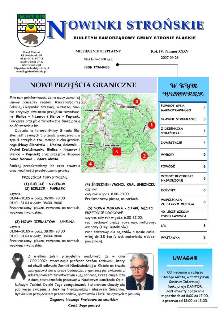 S T R O N IE Ś L. N OWINKI STROŃSKIE Urząd Miejski Ul. Kościuszki 55 tel. (0~74) 811-77-11 Fax (0~74) 811-77-32 www.stronie.pl http://stronie.biuletyn.info.pl e-mail: [email protected] BIULETYN SAMORZĄDOWY GMINY STRONIE ŚLĄSKIE MIESIĘCZNIK BEZPŁATNY Rok IV, Numer XXXV Nakład—1000 egz. 2007-09-28 ISSN 1734-0403 NOWE PRZEJŚCIA GRANICZNE Miło nam poinformować, Ŝe na mocy zawartej umowy pomiędzy rządami Rzeczpospolitej Polskiej i Republiki Czeskiej, w Naszej Gminie przybyły dwa nowe przejścia turystyczne: Bielice – Nýzerov i Bielice - Paprsek. PowyŜsze przejścia turystyczne funkcjonują od 20 września br. Obecnie na terenie Gminy Stronie Śląskie jest czynnych 5 przejść granicznych, w tym 4 przejścia tzw. małego ruchu granicznego (Nowy Gierałtów - Uhelna, ŚnieŜnik Vrchol Kral.Snezniku, Bielice – Nýzerov i Bielice - Paprsek) oraz przejście drogowe Nowa Morawa - Stare Mesto. PoniŜej przedstawiamy ich czas otwarcia oraz moŜliwości przekraczania granicy. PRZEJŚCIA TURYSTYCZNE (1) BIELICE – NÝZEROV (2) BIELICE - PAPRSEK czynne: 01.04—30.09 w godz. 06:00- 20:00 01.10—31.03 w godz. 08:00-18:00 Przekraczamy: pieszo, rowerem, na nartach, wózkiem inwalidzkim. (3) NOWY GIERAŁTÓW - UHELNA czynne: 01.04—30.09 w godz. 08:00- 20:00 01.10—31.03 w godz. 08:00-18:00 Przekraczamy: pieszo, rowerem, na nartach, wózkiem inwalidzkim. (4) ŚNIEśNIK-VRCHOL KRAL.SNEZNIKU czynne: cały rok w godz. 8.00-20.00; Przekraczamy: pieszo, na nartach. (5) NOWA MORAWA - STARE MESTO PRZEJŚCIE DROGOWE czynne: cały rok w godz. 6:00-22:00, ruch osobowy: pieszy, rowerowy, motorowy, osobowy (z wył. autokarów); ruch towarowy dla pojazdów o masie całkowitej do 3.5 ton (z wył. materiałów niebezpiecznych). Z wielkim Ŝalem przyjęliśmy wiadomość, Ŝe w dniu 17.09.2007r. zmarł nagle profesor Stefan Kozłowski, który od chwili odkrycia Jaskini Niedźwiedziej w Kletnie na trwałe zaangaŜował się w prace badawcze, organizacyjne związane z udostępnianiem turystycznym i jej ochroną. Przez długie lata z duŜą skutecznością pracował w Naukowym Komitecie Opiekuńczym Jaskini. Dzięki Jego zaangaŜowaniu i staraniom ukazały się publikacje związane z Jaskinią Niedźwiedzią i Masywem ŚnieŜnika. Był wielkim przyjacielem przewodników, grotołazów i ludzi związanych z jaskinią. śegnamy Naszego Profesora ze smutkiem Cześć Jego pamięci W TYM NUMERZE: POWRÓT SYNA MARNOTRAWNEGO 2 SŁAWNI STRONIANIE 3 Z DZIENNIKA STRAśNIKA 4 INWESTYCJE 4 WYBORY 5 POWÓDŹ 6 WIOSKI BEZTROSKI NAGRODZONE 6 DOśYNKI 6 WSPÓLPRACA ZE STARYM MESTEM 8 40-LECIE SZKOŁY PODSTAWOWEJ LPR 8 WYSTAWKA 8 UWAGA!!! Od niedawna w ratuszu Starégo Mĕsta, w tamtejszym Centrum Informacji, funkcjonuje KANTOR. Jest otwarty codziennie w godzinach od 8:00 do 17:00, z przerwą od 12:00 do 13:00. ROK IV, NUMER XXXV STR. 2 PRZYPOMINAMY !!! JUś DZIŚ WYMIEŃ DOWÓD OSOBISTY! Od 2001 roku trwa wymiana starych dowodów osobistych (zielone ksiąŜeczki) na nowe dowody plastikowe. Zgodnie z ustawą z 10 kwietnia 1974 r. o ewidencji ludności i dowodach osobistych proces wymiany dowodów kończy się 31 grudnia 2007 r. W przyjętej przez Sejm w dniu 7 września b.r. ustawie, wydłuŜono okres posługiwania się starymi, ksiąŜeczkowymi dowodami osobistymi do dnia 31 marca 2008 roku. Wnioski o nowy dowód osobisty naleŜy nadal składać do 31 grudnia 2007 roku! Natomiast do 31 marca 2008 roku w myśl nowej ustawy moŜna posługiwać się ksiąŜeczkowymi dowodami osobistymi, w celu poświadczenia toŜsamości i obywatelstwa polskiego. Wszyscy ci, którzy nie wymienią do tego czasu starych dowodów na nowe, znajdą się w trudnej sytuacji, poniewaŜ nie będą mogli m.in. ♦30.09 mija termin płatności III raty zezwoleń na sprzedaŜ napojów alkoholowych. ♦Przypomina się o konieczności przedłuŜenia umów na uŜytkowanie kwater grzebalnych na cmentarzu komunalnym w Stroniu Śląskim. Opłata za przedłuŜenie uŜytkowania kwatery na okres kolejnych 20 lat wynosi 200 PLN. ♦30.09 mija termin składa- ⇛ załatwić formalności w urzędach, nia wniosków o stypendia ⇛ odebrać listu poleconego na poczcie, Burmistrza ⇛ wziąć kredytu bankowego, skiego (naukowe, sportowe i ⇛ sprzedać lub kupić mieszkania, itp. Nie zwlekaj!!! JuŜ dziś wymień dowód osobisty!!! POWRÓT SYNA MARNOTRAWNEGO — WYSTAWA Na I piętrze Urzędu Miejskiego w Stroniu Śląskim moŜna obejrzeć wystawę pt. „Powrót syna marnotrawnego”. Ekspozycja zawiera prace pana Krystiana Sokoła, dawnego mieszkańca Stronia, który właśnie powraca w swoje umiłowane Sudety, aby ponownie tu osiąść, tym razem juŜ na stałe. W Urzędzie moŜna obejrzeć grafiki, akwarele, zdjęcia obrazów olejnych, a takŜe poczytać poezję i to wszystko autorstwa jednego człowieka. Stronia Ślą- artystyczne). ♦Do dnia 30 września 2007 r. przyjmowane są, w punkcie informacyjnym Urzędu Miejskiego, wnioski do budŜetu Gminy Stronie Śląskie na 2008 rok. ♦Mieszkańcy Gminy Stronie Śląskie do końca 2007roku mogą, na preferencyjnych warunkach, nabyć lokale mieszkaniowe, które dzierŜawią lub wynajmują od Gminy minimum od trzech lat. Bonifikaty na wykup mieszkań wynoszą od 70% do 99% wartości mieszkania i obowiązują do 31 grudnia 2007 r. Szczegółowe informacje moŜna uzyskać w Urzędzie Miejskim pok. Nr 12 (tel. 074 811-77-15). KONKURS ROD „POD ŚWIERKIEM” - ROZSTRZYGNIĘTY Podobnie jak w poprzednich latach, tak i w tym roku odbył się konkurs dla działkowców. Nagrody przyznawano za staranną i wzorową uprawę działek ogrodowych, w podziale na trzy sektory „A”, „B” i „C”. Po przeglądzie działek dokonanym 04.08.2007r., Zarząd Rodzinnych Ogródków Działkowych „Pod Świerkiem” wytypował zwycięzców konkursu. W dniu 1 września Burmistrz Stronia Śląskiego uroczyście wręczył zwycięzcom poszczególnych kategorii dyplomy i nagrody. W kategorii: sektor „A” zwycięŜyła pani Danuta