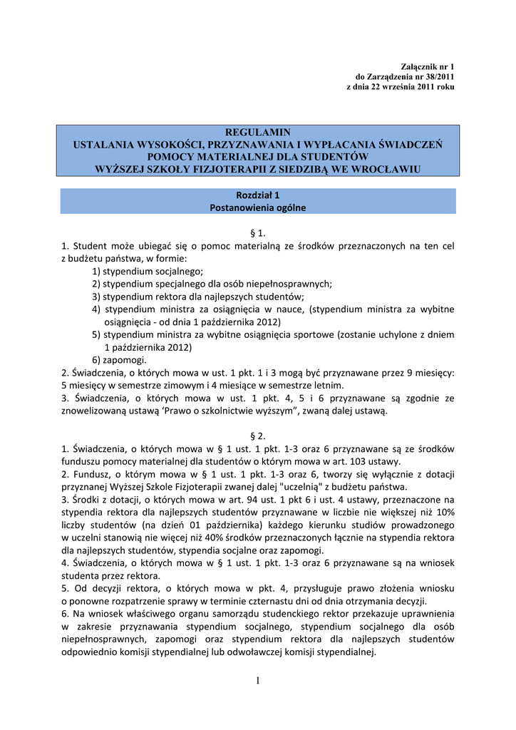 Załącznik nr 1 do Zarządzenia nr 38/2011 z dnia 22 września 2011 roku REGULAMIN USTALANIA WYSOKOŚCI, PRZYZNAWANIA I WYPŁACANIA ŚWIADCZEŃ POMOCY MATERIALNEJ DLA STUDENTÓW WYśSZEJ SZKOŁY FIZJOTERAPII Z SIEDZIBĄ WE WROCŁAWIU Rozdział 1 Postanowienia ogólne § 1. 1. Student może ubiegać się o pomoc materialną ze środków przeznaczonych na ten cel z budżetu państwa, w formie: 1) stypendium socjalnego; 2) stypendium specjalnego dla osób niepełnosprawnych; 3) stypendium rektora dla najlepszych studentów; 4) stypendium ministra za osiągnięcia w nauce, (stypendium ministra za wybitne osiągnięcia - od dnia 1 października 2012) 5) stypendium ministra za wybitne osiągnięcia sportowe (zostanie uchylone z dniem 1 października 2012) 6) zapomogi. 2. Świadczenia, o których mowa w ust. 1 pkt. 1 i 3 mogą być przyznawane przez 9 miesięcy: 5 miesięcy w semestrze zimowym i 4 miesiące w semestrze letnim. 3. Świadczenia, o których mowa w ust. 1 pkt. 4, 5 i 6 przyznawane są zgodnie ze znowelizowaną ustawą ‘Prawo o szkolnictwie wyższym”, zwaną dalej ustawą. § 2. 1. Świadczenia, o których mowa w § 1 ust. 1 pkt. 1-3 oraz 6 przyznawane są ze środków funduszu pomocy materialnej dla studentów o którym mowa w art. 103 ustawy. 2. Fundusz, o którym mowa w § 1 ust. 1 pkt. 1-3 oraz 6, tworzy się wyłącznie z dotacji przyznanej Wyższej Szkole Fizjoterapii zwanej dalej "uczelnią" z budżetu państwa. 3. Środki z dotacji, o których mowa w art. 94 ust. 1 pkt 6 i ust. 4 ustawy, przeznaczone na stypendia rektora dla najlepszych studentów przyznawane w liczbie nie większej niż 10% liczby studentów (na dzień 01 października) każdego kierunku studiów prowadzonego w uczelni stanowią nie więcej niż 40% środków przeznaczonych łącznie na stypendia rektora dla najlepszych studentów, stypendia socjalne oraz zapomogi. 4. Świadczenia, o których mowa w § 1 ust. 1 pkt. 1-3 oraz 6 przyznawane są na wniosek studenta przez rektora. 5. Od decyzji rektora, o których mowa w pkt. 4, przysługuje prawo złożenia wniosku o ponowne rozpatrzenie sprawy w terminie czternastu dni od dnia otrzymania decyzji. 6. Na wniosek właściwego organu samorządu studenckiego rektor przekazuje uprawnienia w zakresie przyznawania stypendium socjalnego, stypendium socjalnego dla osób niepełnosprawnych, zapomogi oraz stypendium rektora dla najlepszych studentów odpowiednio komisji stypendialnej lub odwoławczej komisji stypendialnej. 1 § 3. 1. Prawo do pomocy materialnej z budżetu państwa wygasa po: 1) śmierci studenta; 2) skreśleniu z listy studentów; 3) zawieszeniu w prawach studenta; 4) rezygnacji ze studiów; 5) rezygnacji z przyznanego świadczenia; 6) ukończenia studiów; 7) istotnej zmianie jednego z warunków na podstawie których przyznano studentowi pomoc materialną. 2. Świadczenie pomocy materialnej nie przysługuje studentowi, który powtarza rok lub jest w jest trakcie urlopu. 3. W szczególnej sytuacji, gdy powtarzanie roku lub urlop spowodowane są długotrwałą chorobą lub szczególnie trudną sytuacją losową organ stypendialny może odstąpić od stosowania ust. 2. 4. Studenci, którzy: 1) uzyskali wpis warunkowy - mogą otrzymywać świadczenie określone w § 1 pkt. 1 dopiero od miesiąca, w którym spełnili wszystkie warunki związane z wpisem warunkowym, 2) wznowili studia, zmienili uczelnię lub kierunek studiów – mogą otrzymywać świadczenie określone w § 1. § 4. Łącznie miesięczna wysokość stypendiów, o których mowa w § 1 ust. 1 pkt. 1-3 nie może być wyższa niż 90% najniższego wynagrodzenia zasadniczego asystenta ustalonego w przepisach o wynagradzaniu nauczycieli akademickich. § 5. 1. Student studiujący równocześnie na kilku kierunkach studiów może otrzymać stypendium socjalne, stypendium socjalne dla osób niepełnosprawnych, zapomogę, stypendium rektora dla najlepszych studentów i stypendium ministra za wybitne osiągnięcia tylko na jednym, wskazanym przez studenta kierunku studiów. 2. Student jest obowiązany do złożenia oświadczenia o niepobieraniu świadczeń pomocy materialnej na więcej niż jednym kierunku. 3. Studentowi, który po ukończeniu jednego kierunku studiów, kontynuuje naukę na drugim kierunku studiów, nie przysługują świadczenia, o których mowa w § 1, chyba że kontynuuje on studia po ukończeniu studiów pierwszego stopnia w celu uzyskania tytułu zawodowego magistra, jednakże nie dłużej niż przez okres 3 lat. § 6. 1. Student ubiegający się o świadczenia pomocy materialnej składa w wyznaczonych terminach wypełniony wniosek według wzorów o przyznanie świadczeń pomocy materialnej zawierającego oświadczenie o niepobieraniu świadczeń na innym kierunku studiów wraz z wymaganymi dokumentami uzasadniającymi przyznanie pomocy materialnej. 2. Stypendia, o których mowa w § 1 ust. 1 pkt. 1-3 przyznawane są na rok akademicki. 2 3. Stypendia wypłacane są co miesiąc. W wypadku opóźnienia w przekazaniu uczelni środków z budżetu państwa wypłaty świadczeń pomocy materialnej następują z wyrównaniem za zaległe miesiące. 4. Rektor może wstrzymać wypłatę studentowi świadczenia pomocy materialnej w przypadkach określonych w ustawie. 5. Dokumentację stypendialną gromadzi i przechowuje Kwestor Uczelni, który sporządza także miesięczne listy wypłat. Wypłata stypendium nastąpi w formie bezgotówkowej na rachunek bankowy wskazany przez studenta. 6. Koszty realizacji zadań związanych z przyznawaniem i wypłacaniem stypendiów pokrywane są z funduszu pomocy materialnej dla studentów zgodnie z art. 103 ust. 6 ustawy. 7. Sekretariat Uczelni zobowiązany jest do: 1) udzielania wyczerpujących informacji o formach pomocy materialnej, sposobach i terminach wnioskowania, 2) zaopatrywania studentów we właściwe formularze, 3) przyjmowania wniosków o pomoc materialną, 4) przedkładania wniosków rektorowi lub właściwym komisjom do podjęcia decyzji