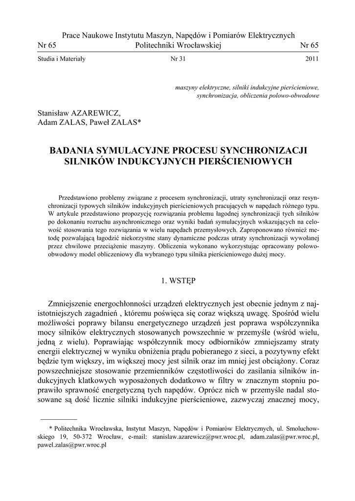 Prace Naukowe Instytutu Maszyn, Napędów i Pomiarów Elektrycznych Nr 65 Politechniki Wrocławskiej Nr 65 Studia i Materiały Nr 31 2011 maszyny elektryczne, silniki indukcyjne pierścieniowe, synchronizacja, obliczenia polowo-obwodowe Stanisław AZAREWICZ, Adam ZALAS, Paweł ZALAS* BADANIA SYMULACYJNE PROCESU SYNCHRONIZACJI SILNIKÓW INDUKCYJNYCH PIERŚCIENIOWYCH Przedstawiono problemy związane z procesem synchronizacji, utraty synchronizacji oraz resynchronizacji typowych silników indukcyjnych pierścieniowych pracujących w napędach różnego typu. W artykule przedstawiono propozycję rozwiązania problemu łagodnej synchronizacji tych silników po dokonaniu rozruchu asynchronicznego oraz wyniki badań symulacyjnych wskazujących na celowość stosowania tego rozwiązania w wielu napędach przemysłowych. Zaproponowano również metodę pozwalającą łagodzić niekorzystne stany dynamiczne podczas utraty synchronizacji wywołanej przez chwilowe przeciążenie maszyny. Obliczenia wykonano wykorzystując opracowany polowoobwodowy model obliczeniowy dla wybranego typu silnika pierścieniowego dużej mocy. 1. WSTĘP Zmniejszenie energochłonności urządzeń elektrycznych jest obecnie jednym z najistotniejszych zagadnień , któremu poświęca się coraz większą uwagę. Spośród wielu możliwości poprawy bilansu energetycznego urządzeń jest poprawa współczynnika mocy silników elektrycznych stosowanych powszechnie w przemyśle (wśród wielu, jedną z wielu). Poprawiając współczynnik mocy odbiorników zmniejszamy straty energii elektrycznej w wyniku obniżenia prądu pobieranego z sieci, a pozytywny efekt będzie tym większy, im większej mocy jest silnik oraz im mniej jest obciążony. Coraz powszechniejsze stosowanie przemienników częstotliwości do zasilania silników indukcyjnych klatkowych wyposażonych dodatkowo w filtry w znacznym stopniu poprawiło sprawność energetyczną tych napędów. Oprócz nich w przemyśle nadal stosowane są dość licznie silniki indukcyjne pierścieniowe, zazwyczaj znacznej mocy, _________ * Politechnika Wrocławska, Instytut Maszyn, Napędów i Pomiarów Elektrycznych, ul. Smoluchowskiego 19, 50-372 Wrocław, e-mail: [email protected], [email protected], [email protected] 42 pracujące w napędach o rozruchu ciężkim, zasilane bezpośrednio z sieci. Napędy te zazwyczaj nie potrzebują regulacji prędkości obrotowej. Bardzo często silniki te w układach napędowych po dokonaniu rozruchu pracują w znacznym niedociążeniu, co skutkuje niskim współczynnikiem mocy, a tym samym gorszą sprawnością energetyczną napędu. Celowym zatem jest poszukiwanie możliwości poprawy tego stanu. Jednym z rozwiązań może być wprowadzanie tych silników w stan pracy synchronicznej po dokonaniu pełnego rozruchu [1, 2, 10]. Realizacja synchronizacji wymaga jednakże rozwiązania pewnych problemów technicznych, z których najistotniejsze to wybór optymalnej chwili załączenia prądu wzbudzenia do uzwojenia wirnika [5–7, 12] oraz dobranie jego minimalnej wartości tak, aby ograniczyć siły dynamiczne występujące w procesie synchronizacji [10]. W tym celu bardzo istotnym jest właściwy wybór układu sterowania rozruchem i zasilania napięciem stałym [11] uzwojeń wirnika. W artykule przedstawiono wyniki badań symulacyjnych napędu z silnikiem indukcyjnym pierścieniowym podczas realizacji procesu synchronizacji, a także przebiegi dynamiczne jakie występują podczas utraty synchronizmu i ponownej resynchronizacji silnika. Poznanie powyższych problemów jest bardzo istotne ze względu na niewielką przeciążalność silników asynchronicznych pierścieniowych podczas pracy synchronicznej. W wyniku przeprowadzonej analizy i badań symulacyjnych zaproponowano układ sterowania rozruchem i zasilania napięciem stałym uzwojeń wirnika silnika. Przedstawiono układ realizacji synchronizacji wraz ze sposobem jego sterowania oraz wyniki badań symulacyjnych różnych stanów pracy wybranego napędu dużej mocy z silnikiem indukcyjnym pierścieniowym. Na podstawie uzyskanych wyników badań określono warunki jakie powinien spełniać silnik pierścieniowy przeznaczony do pracy synchronicznej. Wykazano również, że w stanie pracy synchronicznej silniki indukcyjne pierścieniowe posiadają korzystniejszy współczynnik mocy niż podczas pracy asynchronicznej przy identycznym obciążeniu, a także w określonych przypadkach przy znacznym niedociążeniu mogą pracować w stanie pracy kompensatorowej. 2. BADANIA SYMULACYJNE PROCESU SYNCHRONIZACJI I PRACY SYNCHRONICZNEJ SILNIKA PIERŚCIENIOWEGO Badaniom symulacyjnym poddano silnik indukcyjny pierścieniowy o parametrach zestawionych w tabeli 1. Określenie wpływu chwili załączenia napięcia stałego do uzwojenia wirnika na przebieg procesu synchronizacji wybranego silnika pierścieniowego przeprowadzono w ramach badań symulacyjnych przy różnych wartościach momentu obciążenia. Badania symulacyjne przeprowadzono metodą polowo-obwodową wykorzystując komercyjne oprogramowanie. Na rysunku 1 pokazano fragment magnetowodu badanego silnika wraz z siatką elementów skończonych, wykorzystywanego w części polowej opracowanego modelu obliczeniowego. 43 Tabela 1. Dane znamionowe badanego silnika pierścieniowego Table 1. The ratings of the slip-ring induction motor moc znamionowa kW 1000 napięcie stojana V 6000 prąd stojana A 124 prędkość obrotowa obr/min 493 współczynnik mocy – 0,82ind. sprawność – 94,6% prąd wirnika A 410 Rys. 1. Fragment magnetowodu oraz siatki dyskretyzacyjnej modelowanego silnika Fig. 1. The field part of the model; magnetic core and finite element mesh Podczas obliczeń pracy silnika rozruch dokonywany był w sposób tradycyjny z wykorzystaniem rozrusznika rezystancyjnego. Po ustaleniu się prędkości podsynchronicznej do uzwojeń wirnika dołączano napięcie stałe. Schematy ideowe układów połączeń oraz zasilania uzwojeń wirnika badanego s
