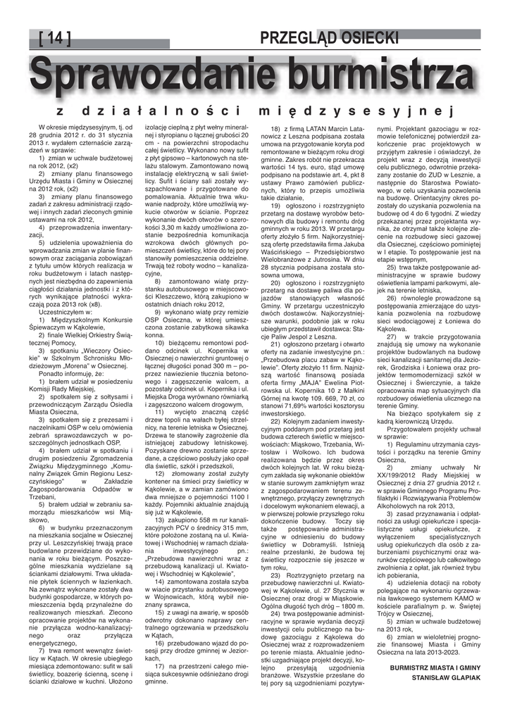 [ 14 ] PRZEGLĄD OSIECKI Sprawozdanie burmistrza z d z i a ł a l n o ś c i W okresie międzysesyjnym, tj. od 28 grudnia 2012 r. do 31 stycznia 2013 r. wydałem czternaście zarządzeń w sprawie: 1) zmian w uchwale budżetowej na rok 2012, (x2) 2) zmiany planu finansowego Urzędu Miasta i Gminy w Osiecznej na 2012 rok, (x2) 3) zmiany planu finansowego zadań z zakresu administracji rządowej i innych zadań zleconych gminie ustawami na rok 2012, 4) przeprowadzenia inwentaryzacji, 5) udzielenia upoważnienia do wprowadzania zmian w planie finansowym oraz zaciągania zobowiązań z tytułu umów których realizacja w roku budżetowym i latach następnych jest niezbędna do zapewnienia ciągłości działania jednostki i z których wynikające płatności wykraczają poza 2013 rok (x8). Uczestniczyłem w: 1) Międzyszkolnym Konkursie Śpiewaczym w Kąkolewie, 2) finale Wielkiej Orkiestry Świątecznej Pomocy, 3) spotkaniu „Wieczory Osieckie” w Szkolnym Schronisku Młodzieżowym „Morena” w Osiecznej. Ponadto informuję, że: 1) brałem udział w posiedzeniu Komisji Rady Miejskiej, 2) spotkałem się z sołtysami i przewodniczącym Zarządu Osiedla Miasta Osieczna, 3) spotkałem się z prezesami i naczelnikami OSP w celu omówienia zebrań sprawozdawczych w poszczególnych jednostkach OSP, 4) brałem udział w spotkaniu i drugim posiedzeniu Zgromadzenia Związku Międzygminnego „Komunalny Związek Gmin Regionu Leszczyńskiego” w Zakładzie Zagospodarowania Odpadów w Trzebani, 5) brałem udział w zebraniu samorządu mieszkańców wsi Miąskowo, 6) w budynku przeznaczonym na mieszkania socjalne w Osiecznej przy ul. Leszczyńskiej trwają prace budowlane przewidziane do wykonania w roku bieżącym. Poszczególne mieszkania wydzielane są ściankami działowymi. Trwa układanie płytek ściennych w łazienkach. Na zewnątrz wykonane zostały dwa budynki gospodarcze, w których pomieszczenia będą przynależne do realizowanych mieszkań. Zlecono opracowanie projektów na wykonanie przyłącza wodno-kanalizacyjnego oraz przyłącza energetycznego, 7) trwa remont wewnątrz świetlicy w Kątach. W okresie ubiegłego miesiąca zdemontowano: sufit w sali świetlicy, boazerię ścienną, scenę i ścianki działowe w kuchni. Ułożono izolację cieplną z płyt wełny mineralnej i styropianu o łącznej grubości 20 cm - na powierzchni stropodachu całej świetlicy. Wykonano nowy sufit z płyt gipsowo – kartonowych na stelażu stalowym. Zamontowano nową instalację elektryczną w sali świetlicy. Sufit i ściany sali zostały wyszpachlowane i przygotowane do pomalowania. Aktualnie trwa wkuwanie nadproży, które umożliwią wykucie otworów w ścianie. Poprzez wykonanie dwóch otworów o szerokości 3,30 m każdy umożliwiona zostanie bezpośrednia komunikacja wzrokowa dwóch głównych pomieszczeń świetlicy, które do tej pory stanowiły pomieszczenia oddzielne. Trwają też roboty wodno – kanalizacyjne, 8) zamontowano wiatę przystanku autobusowego w miejscowości Kleszczewo, którą zakupiono w ostatnich dniach roku 2012, 9) wykonano wiatę przy remizie OSP Osieczna, w której umieszczona zostanie zabytkowa sikawka konna. 10) bieżącemu remontowi poddano odcinek ul. Kopernika w Osiecznej o nawierzchni gruntowej o łącznej długości ponad 300 m – poprzez nawiezienie tłucznia betonowego i zagęszczenie walcem, a pozostały odcinek ul. Kopernika i ul. Miejska Droga wyrównano równiarką i zagęszczono walcem drogowym, 11) wycięto znaczną część drzew topoli na wałach byłej strzelnicy, na terenie letniska w Osiecznej. Drzewa te stanowiły zagrożenie dla istniejącej zabudowy letniskowej. Pozyskane drewno zostanie sprzedane, a częściowo posłuży jako opał dla świetlic, szkół i przedszkoli, 12) złomowany został zużyty kontener na śmieci przy świetlicy w Kąkolewie, a w zamian zamówiono dwa mniejsze o pojemności 1100 l każdy. Pojemniki aktualnie znajdują się już w Kąkolewie, 13) zakupiono 558 m rur kanalizacyjnych PCV o średnicy 315 mm, które położone zostaną na ul. Kwiatowej i Wschodniej w ramach działania inwestycyjnego pn.: „Przebudowa nawierzchni wraz z przebudową kanalizacji ul. Kwiatowej i Wschodniej w Kąkolewie”, 14) zamontowana została szyba w wiacie przystanku autobusowego w Wojnowicach, którą wybił nieznany sprawca, 15) z uwagi na awarię, w sposób odwrotny dokonano naprawy centralnego ogrzewania w przedszkolu w Kątach, 16) przebudowano wjazd do posesji przy drodze gminnej w Jeziorkach, 17) na przestrzeni całego miesiąca sukcesywnie odśnieżano drogi gminne. m i ę d z y s e s y j n e j 18) z firmą LATAN Marcin Latanowicz z Leszna podpisana została umowa na przygotowanie koryta pod remontowane w bieżącym roku drogi gminne. Zakres robót nie przekracza wartości 14 tys. euro, stąd umowę podpisano na podstawie art. 4, pkt 8 ustawy Prawo zamówień publicznych, który to przepis umożliwia takie działanie, 19) ogłoszono i rozstrzygnięto przetarg na dostawę wyrobów betonowych dla budowy i remontu dróg gminnych w roku 2013. W przetargu oferty złożyło 5 firm. Najkorzystniejszą ofertę przedstawiła firma Jakuba Waścińskiego – Przedsiębiorstwo Wielobranżowe z Jutrosina. W dniu 28 stycznia podpisana została stosowna umowa, 20) ogłoszono i rozstrzygnięto przetarg na dostawę paliwa dla pojazdów stanowiących własność Gminy. W przetargu uczestniczyło dwóch dostawców. Najkorzystniejsze warunki, podobnie jak w roku ubiegłym przedstawił dostawca: Stacje Paliw Jespol z Leszna. 21) ogłoszono przetarg i otwarto oferty na zadanie inwestycyjne pn.: „Przebudowa placu zabaw w Kąkolewie”. Oferty złożyło 11 firm. Najniższą wartość finansową posiada oferta firmy „MAJA” Ewelina Piotrowska ul. Kopernika 10 z Małkini Górnej na kwotę 109. 669, 70 zł, co stanowi 71,69% wartości kosztorysu inwestorskiego. 22) Kolejnym zadaniem inwestycyjnym poddanym pod przetarg jest budowa czterech świetlic 