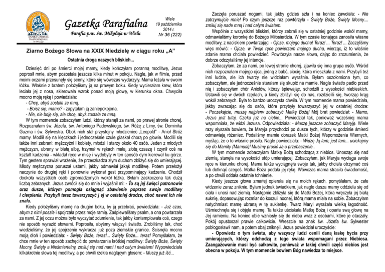 Gazetka Parafialna Parafia p.w. p.w. św. Mikołaja w Wielu Wiele 19 października 2014 r. Nr 36 (222) Ziarno Bożego Słowa na XXIX Niedzielę w ciągu roku „A” Ostatnia droga naszych bliskich... Dziesięć dni po śmierci mojej mamy, kiedy kończyłam poranną modlitwę, Jezus poprosił mnie, abym pozostała jeszcze kilka minut w pokoju. Nagle, jak w filmie, przed moimi oczami przesunęły się sceny, które się wówczas wydarzyły. Mama leżała w swoim łóżku. Właśnie z bratem położyliśmy ją na prawym boku. Kiedy wycierałam krew, która leciała jej z nosa, skierowała wzrok ponad moją głowę, w kierunku okna. Chwyciła mocno moją rękę i powiedziała: - Chcę, abyś została ze mną. - Boisz się, mamo? - zapytałam ją zaniepokojona. - Nie, nie boję się, ale chcę, abyś została ze mną. W tym momencie zobaczyłam ludzi, którzy stanęli za nami, po prawej stronie chorej. Rozpoznałam św. Józefa, św. Antoniego Padewskiego, św. Różę z Limy, św. Dominika Guzma i św. Sylwestra. Obok nich stał przystojny młodzieniec „Leopold" - Anioł Stróż mamy. Modlił się na klęczkach i jednocześnie czule głaskał chorą po głowie. Modlili się także inni zebrani: mężczyźni i kobiety, młodzi i starzy około 40 osób. Jeden z młodych mężczyzn, ubrany w białą albę, trzymał w rękach małą, złotą czaszę i czynił coś na kształt kadzenia - wkładał ręce w misę i wydobyty w ten sposób dym kierował ku górze. Tym gestem sprawiał wrażenie, że przeszkadza złym duchom zbliżyć się do umierającej. Młody mężczyzna poruszał ustami, jakby odmawiał jakąś modlitwę. Potem przełożył naczynie do drugiej ręki i ponownie wykonał gest przypominający kadzenie. Chodził dookoła wszystkich osób zgromadzonych wokół łóżka. Byłam zaskoczona tak dużą liczbą zebranych. Jezus zwrócił się do mnie i wyjaśnił mi: - To są jej święci patronowie oraz dusze, którym pomogła osiągnąć zbawienie poprzez swoje modlitwy i cierpienia. Przybyli teraz towarzyszyć j ej w ostatniej drodze, choć nawet ich nie znała. Kiedy położyliśmy mamę na drugim boku, by ją przebrać, powiedziała: - Już czas, abym z nimi poszła i spojrzała przez moje ramię. Zaśpiewaliśmy psalm, a ona powtarzała za nami. Z jej oczu można było wyczytać zdumienie, tak jakby kontemplowała coś, czego nie sposób wyrazić słowami. Poprosiła, abyśmy włączyli światło. Zrobiliśmy tak, choć wiedzieliśmy, że jej spojrzenie wykracza już poza ziemskie granice. Ścisnęła mocno moją dłoń i powiedziała: - Święty Boże, teraz!... Święty Boże... teraz! Pomyślałam, że chce mnie w ten sposób zachęcić do powtarzania krótkiej modlitwy: Święty Boże, Święty Mocny, Święty a Nieśmiertelny, zmiłuj się nad nami i nad całym światem! Wypowiedziała kilkakrotnie słowa tej modlitwy, a po chwili rzekła naglącym głosem: - Muszę już iść... Zaczęła poruszać nogami, tak jakby gdzieś szła i na koniec zawołała: - Nie zatrzymujcie mnie! Po czym jeszcze raz powtórzyła - Święty Boże, Święty Mocny.... zmiłuj się nade mną i nad całym światem. Wspólnie z wszystkimi bliskimi, którzy zebrali się w ostatniej godzinie wokół mamy, odmawialiśmy koronkę do Bożego Miłosierdzia. W tym czasie konająca zanosiła własne modlitwy, z naciskiem powtarzając: - Ojcze, mojego ducha! Teraz! ... Teraz! ... Zaczęliśmy więc mówić: - Ojcze, w Twoje ręce powierzam mojego ducha, wierząc, iż to właśnie zdanie mama chciała powiedzieć. Powtórzyła nasze słowa, dając do zrozumienia, że dobrze odczytaliśmy jej intencje. Zobaczyłam, że za nami, po lewej stronie chorej, zjawiła się inna grupa osób. Wśród nich rozpoznałam mojego ojca, jedną z babć, ciocię, która mieszkała z nami. Przybyli też inni ludzie, ale ich twarzy nie widziałam wyraźnie. Byłam oszołomiona tym, co zobaczyłam, ale jednocześnie starałam się skupić na mamie. Nagle światło padło przed nią i zobaczyłam chór Aniołów, którzy śpiewając, schodzili z wysokości niebieskich. Ustawili się w dwóch rzędach, a kiedy zbliżyli się do nas, rozdzielili się, tworząc krąg wokół zebranych. Była to bardzo uroczysta chwila. W tym momencie mama powiedziała, jakby zwracając się do osób, które przybyły towarzyszyć jej w ostatniej drodze: - Poczekajcie, muszę najpierw zobaczyć Matkę Bożą! Mój brat powiedział: - Mamo, Jezus jest tutaj. Czeka już na ciebie... Powiedział tak, ponieważ wcześniej mama wspomniała, że widzi Jezusa. Odpowiedziała: - Muszę jeszcze zobaczyć Maryję. Wiele razy słyszała bowiem, że Maryja przychodzi po dusze tych, którzy w godzinie śmierci odmawiają różaniec. Podaliśmy mamie obrazek Matki Bożej Wspomożenia Wiernych, myśląc, że o to właśnie prosiła. Nagle powiedziała: - Widzę Ją tam; jest tam... uciekajmy się do Mamity (Mamusi)! Musimy prosić Ją o przebaczenie.. W tym momencie zobaczyłam Matkę Bożą schodzącą z niebios. Unosząc się nad ziemią, stanęła na wysokości stóp umierającej. Zobaczyłam, jak Maryja wyciąga swoje ręce w kierunku chorej. Mama także wyciągnęła swoje tak, jakby chciała otrzymać coś lub dotknąć czegoś. Matka Boża podała jej rękę. Wówczas mama straciła świadomość, a po chwili oddała ostatnie tchnienie. Kiedy jeszcze głowa zmarłej opierała się na moich rękach, pomyślałam, że całe widzenie zaraz zniknie. Byłam jednak świadkiem, jak nagle dusza mamy oddziela się od ciała i unosi nad ziemią. Następnie zbliżyła się do Matki Bożej, która wręczyła jej białą suknię, dopasowując rozmiar do koszuli nocnej, którą mama miała na sobie. Zobaczyłam natychmiast mamę ubraną w tę sukienkę. Twarz Maryi wyrażała wielką łagodność. Uśmiechnęła się i objęła mamę. Ta także uściskała Matkę Bożą i oparła swą głowę na Jej ramieniu. Na koniec obie wzniosły się do nieba wraz z osobami, które je