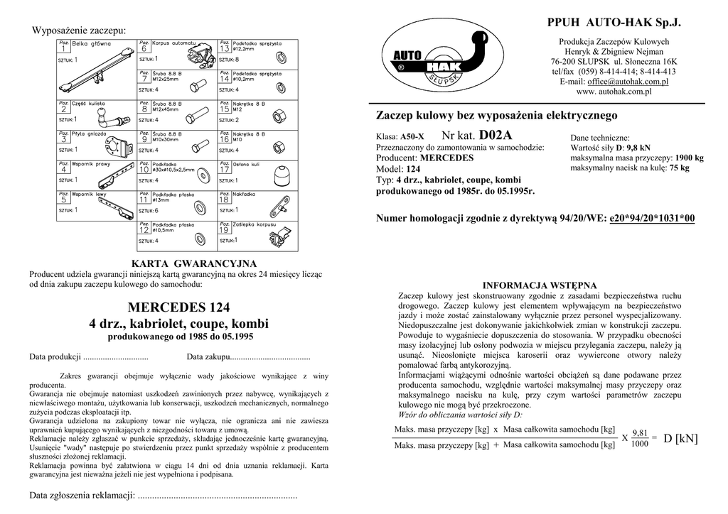 PPUH AUTO-HAK Sp.J. WyposaŜenie zaczepu: Produkcja Zaczepów Kulowych Henryk & Zbigniew Nejman 76-200 SŁUPSK ul. Słoneczna 16K tel/fax (059) 8-414-414; 8-414-413 E-mail: [email protected] www. autohak.com.pl Zaczep kulowy bez wyposaŜenia elektrycznego D02A Klasa: A50-X Nr kat. Przeznaczony do zamontowania w samochodzie: Producent: MERCEDES Model: 124 Typ: 4 drz., kabriolet, coupe, kombi produkowanego od 1985r. do 05.1995r. Dane techniczne: Wartość siły D: 9,8 kN maksymalna masa przyczepy: 1900 kg maksymalny nacisk na kulę: 75 kg Numer homologacji zgodnie z dyrektywą 94/20/WE: e20*94/20*1031*00 KARTA GWARANCYJNA Producent udziela gwarancji niniejszą kartą gwarancyjną na okres 24 miesięcy licząc od dnia zakupu zaczepu kulowego do samochodu: MERCEDES 124 4 drz., kabriolet, coupe, kombi produkowanego od 1985 do 05.1995 Data produkcji .............................. Data zakupu..................................... Zakres gwarancji obejmuje wyłącznie wady jakościowe wynikające z winy producenta. Gwarancja nie obejmuje natomiast uszkodzeń zawinionych przez nabywcę, wynikających z niewłaściwego montaŜu, uŜytkowania lub konserwacji, uszkodzeń mechanicznych, normalnego zuŜycia podczas eksploatacji itp. Gwarancja udzielona na zakupiony towar nie wyłącza, nie ogranicza ani nie zawiesza uprawnień kupującego wynikających z niezgodności towaru z umową. Reklamacje naleŜy zgłaszać w punkcie sprzedaŜy, składając jednocześnie kartę gwarancyjną. Usunięcie "wady" następuje po stwierdzeniu przez punkt sprzedaŜy wspólnie z producentem słuszności złoŜonej reklamacji. Reklamacja powinna być załatwiona w ciągu 14 dni od dnia uznania reklamacji. Karta gwarancyjna jest niewaŜna jeŜeli nie jest wypełniona i podpisana. Data zgłoszenia reklamacji: ................................................................... INFORMACJA WSTĘPNA Zaczep kulowy jest skonstruowany zgodnie z zasadami bezpieczeństwa ruchu drogowego. Zaczep kulowy jest elementem wpływającym na bezpieczeństwo jazdy i moŜe zostać zainstalowany wyłącznie przez personel wyspecjalizowany. Niedopuszczalne jest dokonywanie jakichkolwiek zmian w konstrukcji zaczepu. Powoduje to wygaśniecie dopuszczenia do stosowania. W przypadku obecności masy izolacyjnej lub osłony podwozia w miejscu przylegania zaczepu, naleŜy ją usunąć. Nieosłonięte miejsca karoserii oraz wywiercone otwory naleŜy pomalować farbą antykorozyjną. Informacjami wiąŜącymi odnośnie wartości obciąŜeń są dane podawane przez producenta samochodu, względnie wartości maksymalnej masy przyczepy oraz maksymalnego nacisku na kulę, przy czym wartości parametrów zaczepu kulowego nie mogą być przekroczone. Wzór do obliczania wartości siły D: Maks. masa przyczepy [kg] x Masa całkowita samochodu [kg] 9,81 = X + 1000 Maks. masa przyczepy [kg] + Masa całkowita samochodu [kg] + D [kN] INSTRUKCJA montaŜu i eksploatacji zaczepu kulowego Oznaczenie zacisku wg ISO PN 1 L 2 + 3 31 4 R 5 58R 6 54 7 58L Łączenie przewodów sedan Kierunkowskazy lewe Tylne światła przeciwmgłowe Masa Kierunkowskazy prawe Światła pozycyjne prawe Światła hamowania Światła pozycyjne lewe 4 10 9 A kombi sedan 10 Kolejność czynności przy montaŜu 9 kombi 1 9 7 8 18 5 A 8 3 6 2 Zaczep kulowy przeznaczony jest do zamontowania w samochodzie: MERCEDES 124, 4 drz., kabriolet, coupe, kombi produkowanego od 1985 do 05.1995 r., numer katalogowy D02A i słuŜy do ciągnięcia przyczep o masie całkowitej do 1900 kg i nacisku na kulę max 75 kg. OD PRODUCENTA Dziękujemy za wybór produkowanego przez naszą firmę zaczepu kulowego. Jego niezawodność została potwierdzona licznymi testami oraz opiniami zadowolonych klientów. JednakŜe niezawodność zaczepów kulowych jest zaleŜna równieŜ od prawidłowego montaŜu oraz prawidłowej eksploatacji. Z tego powodu prosimy Państwa o staranne przeczytanie niniejszej instrukcji montaŜu oraz przestrzeganie właściwych wskazówek. Zaczep naleŜy zamontować w miejscach do tego celu przeznaczonych przez producenta samochodu. 1. Zdemontować zderzak, odczepić tłumik z opasek oraz odkręcić osłonę cieplną znajdująca się nad tłumikiem. 2. Odszukać miejsca fabrycznie napunktowane po lewej i prawej stronie podwozia a następnie wykonać otwory (poz. A) wiertłem ø15mm. 3. W znajdujące się po lewej i prawej stronie wnęki koła zapasowego „korytka” włoŜyć wsporniki boczne (poz. 4 i 5) a następnie śrubami M12x45mm z wyposaŜenia (poz. 8) skręcić poprzez wykonane otwory (poz. A) belką główną zaczepu (poz. 1), który naleŜy przyłoŜyć od spodu samochodu. 4. Z prawej strony we wnęce koła zapasowego znajdują się otwory, przez które naleŜy przykręcić wspornik zaczepu śrubami M10x30mm (poz. 9) z wyposaŜenia. 5. Z lewej strony, w miejscach fabryczne napunktowanych przewiercić wiertłem ø11mm otwory przez podwozie z następnie skręcić śrubami M10x30mm (poz. 9) z wyposaŜenia (odpowiednio dla wersji sedan lub kombi). 6. Zamontować osłonę cieplną, podwiesić tłumik oraz zamontować zderzak. 7. Przykręcić korpus automatu (poz. 6) śrubami M12x25mm (poz. 7) wraz z blachą pod gniazdo (poz. 3). Zamocować kulę (poz. 2) zgodnie z instrukcją dołączaną do zaczepu z końcówką szybkodemontowalną. 8. Dokręcić wszystkie śruby momentem jak podano w tabelce. 9. Podłączyć przewody z gniazdka 7- bieg. do instalacji elektrycznej zgodnie z instrukcją fabryczną samochodu (zaleca się wykonanie w ASO). 10. Uzupełnić ewentualne ubytki powłoki malarskiej zaczepu powstałe w trakcie montaŜu. Zalecany moment skręcający dla śrub i nakrętek 8,8: M6 - 11 Nm M8 - 25 Nm M10 - 50 Nm M12 - 87 Nm M14 - 138 Nm M16 - 210 Nm UWAGA Po zamontowaniu zaczepu kulowego naleŜy uzyskać wpis w dowodzie rejestracyjnym pojazdu na "stacji kontroli pojazdów" właściwej dla miejsca zamieszkania . Samochód powinien być wyposaŜony w: -kierunkowskazy boczne, -lusterka boczne o r