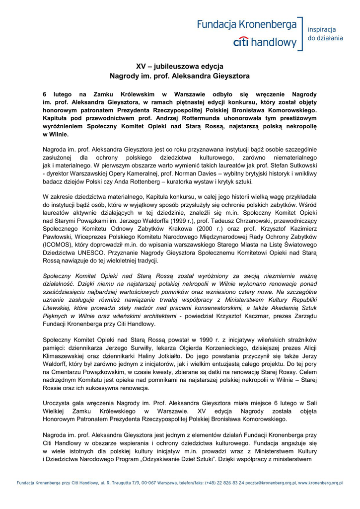 XV – jubileuszowa edycja Nagrody im. prof. Aleksandra Gieysztora 6 lutego na Zamku Królewskim w Warszawie odbyło się wręczenie Nagrody im. prof. Aleksandra Gieysztora, w ramach piętnastej edycji konkursu, który został objęty honorowym patronatem Prezydenta Rzeczypospolitej Polskiej Bronisława Komorowskiego. Kapituła pod przewodnictwem prof. Andrzej Rottermunda uhonorowała tym prestiżowym wyróżnieniem Społeczny Komitet Opieki nad Starą Rossą, najstarszą polską nekropolię w Wilnie. Nagroda im. prof. Aleksandra Gieysztora jest co roku przyznawana instytucji bądź osobie szczególnie zasłużonej dla ochrony polskiego dziedzictwa kulturowego, zarówno niematerialnego jak i materialnego. W pierwszym obszarze warto wymienić takich laureatów jak prof. Stefan Sutkowski - dyrektor Warszawskiej Opery Kameralnej, prof. Norman Davies – wybitny brytyjski historyk i wnikliwy badacz dziejów Polski czy Anda Rottenberg – kuratorka wystaw i krytyk sztuki. W zakresie dziedzictwa materialnego, Kapituła konkursu, w całej jego historii wielką wagę przykładała do instytucji bądź osób, które w wyjątkowy sposób przysłużyły się ochronie polskich zabytków. Wśród laureatów aktywnie działających w tej dziedzinie, znaleźli się m.in. Społeczny Komitet Opieki nad Starymi Powązkami im. Jerzego Waldorffa (1999 r.), prof. Tadeusz Chrzanowski, przewodniczący Społecznego Komitetu Odnowy Zabytków Krakowa (2000 r.) oraz prof. Krzysztof Kazimierz Pawłowski, Wiceprezes Polskiego Komitetu Narodowego Międzynarodowej Rady Ochrony Zabytków (ICOMOS), który doprowadził m.in. do wpisania warszawskiego Starego Miasta na Listę Światowego Dziedzictwa UNESCO. Przyznanie Nagrody Gieysztora Społecznemu Komitetowi Opieki nad Starą Rossą nawiązuje do tej wieloletniej tradycji. Społeczny Komitet Opieki nad Starą Rossą został wyróżniony za swoją niezmiernie ważną działalność. Dzięki niemu na najstarszej polskiej nekropolii w Wilnie wykonano renowacje ponad sześćdziesięciu najbardziej wartościowych pomników oraz wzniesiono cztery nowe. Na szczególne uznanie zasługuje również nawiązanie trwałej współpracy z Ministerstwem Kultury Republiki Litewskiej, które prowadzi stały nadzór nad pracami konserwatorskimi, a także Akademią Sztuk Pięknych w Wilnie oraz wileńskimi architektami - powiedział Krzysztof Kaczmar, prezes Zarządu Fundacji Kronenberga przy Citi Handlowy. Społeczny Komitet Opieki nad Starą Rossą powstał w 1990 r. z inicjatywy wileńskich strażników pamięci: dziennikarza Jerzego Surwiłły, lekarza Olgierda Korzenieckiego, dzisiejszej prezes Alicji Klimaszewskiej oraz dziennikarki Haliny Jotkiałło. Do jego powstania przyczynił się także Jerzy Waldorff, który był zarówno jednym z inicjatorów, jak i wielkim entuzjastą całego projektu. Do tej pory na Cmentarzu Powązkowskim, w czasie kwesty, zbierane są datki na renowację Starej Rossy. Celem nadrzędnym Komitetu jest opieka nad pomnikami na najstarszej polskiej nekropolii w Wilnie – Starej Rossie oraz ich sukcesywna renowacja. Uroczysta gala wręczenia Nagrody im. Prof. Aleksandra Gieysztora miała miejsce 6 lutego w Sali Wielkiej Zamku Królewskiego w Warszawie. XV edycja Nagrody została objęta Honorowym Patronatem Prezydenta Rzeczypospolitej Polskiej Bronisława Komorowskiego. Nagroda im. prof. Aleksandra Gieysztora jest jednym z elementów działań Fundacji Kronenberga przy Citi Handlowy w obszarze wspierania i ochrony dziedzictwa kulturowego. Fundacja angażuje się w wiele istotnych dla polskiej kultury inicjatyw m.in. prowadzi wraz z Ministerstwem Kultury i Dziedzictwa Narodowego Program „Odzyskiwanie Dzieł Sztuki”. Dzięki współpracy z ministerstwem do Polski powróciły dwa obrazy: Odpoczynek w szałasie tatrzańskim", Wojciecha Gersona (2010) oraz „Murzynka” autorstwa Anny Bilińskiej – Bohdanowiczowej (2012). Fundacja prowadzi również program „Korzenie”, przypominający osobę i dokonania Leopolda Kronenberga (patrona Fundacji) oraz dokumentujący historię Banku Handlowego. Nagroda imienia profesora Aleksandra Gieysztora przyznawana jest przez Fundację Kronenberga przy Citi Handlowy od 1999 roku za wybitne osiągnięcia, mające na celu ochronę polskiego dziedzictwa kulturowego Wśród dotychczasowych Laureatów znaleźli się: m.in. prof. Andrzej Tomaszewski, Jan K. Ostrowski, dyrektor Zamku Królewskiego na Wawelu, prof. Stefan Sutkowski, dyrektor Warszawskiej Opery Kameralnej,Nagrodą Gieysztora nagrodzono także takie instytucje jak m.in. Społeczny Komitet Opieki nad Starymi Powązkami, kierowany przez Jerzego Waldorffa, Zakład Narodowy im. Ossolińskich we Wrocławiu, prof. Norman Davies – wybitny brytyjski historyk i wnikliwy badacz dziejów Polski. Kapituła Nagrody im. prof. Aleksandra Gieysztora obraduje pod przewodnictwem prof. Andrzeja Rottermunda, a w jej skład wchodzi Rada i Zarząd Fundacji Kronenberga przy Citi Handlowy. Dodatkowych informacji udzielają: Dorota Szostek - Rustecka, Dyrektor e-mail: [email protected] Krzysztof Kaczmar, Prezes Zarządu [email protected] Biura Fundacji Prasowego Citi Handlowy, Kronenberga przy Citi tel. Handlowy, (+48 tel. 22) 501 690 128 882, 10 49, e-mail: Działająca od 1996 roku Fundacja Kronenberga przy Citi Handlowy wspiera w imieniu Banku prace na rzecz dobra publicznego w obszarach tematycznych takich jak: edukacja, rozwój lokalny i ochrona dziedzictwa kulturowego. Realizowane przez nią działania obejmują m.in. program edukacji finansowej dla uczniów szkół ponadgimnazjalnych Moje Finanse organizowany wspólnie z NBP i Fundacją Młodzieżowej Przedsiębiorczości; Wolontariat Pracowniczy (program zaangażowania pracowników Citi Handlowy w wybrane przedsięwzięcia społeczne), konkursy: Mikroprzedsiębiorca Roku i o Nagrodę Banku Handlowego w Warszawie SA za szczególny wkład w rozwój nauki w sferze ekonomii i finansów oraz Nagrodę im. prof. Aleksandra Gieysztora