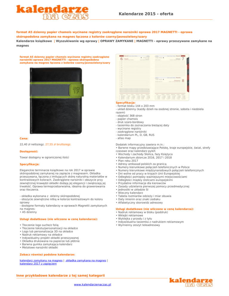 Kalendarze 2015 - oferta format A5 dzienny papier chamois wycinane registry zaokrąglone narożniki oprawa 2017 MAGNETTI - oprawa skóropodobna zamykana na magnes łączona z kolorów czarny/jasnozielony/szary Kalendarze książkowe | Wyszukiwanie wg oprawy | OPRAWY ZAMYKANE | MAGNETTI - oprawy przeszywane zamykane na magnes format A5 dzienny papier chamois wycinane registry zaokrąglone narożniki oprawa 2017 MAGNETTI - oprawa skóropodobna zamykana na magnes łączona z kolorów czarny/jasnozielony/szary Specyfikacja: - format bloku 144 x 203 mm - układ dzienny (każdy dzień na osobnej stronie, sobota i niedziela razem) - objętość 368 stron - papier chamois - druk szaro-bordowy - tasiemka do zaznaczania bieżącej daty - wycinane registry - zaokrąglone narożniki - kalendarium PL, D, GB, RUS - atlas map Cena: 22,40 zł netto/egz. 27,55 zł brutto/egz. Dostępność: Towar dostępny w ograniczonej ilości Specyfikacja: Eleganckie terminarze książkowe na rok 2017 w oprawie skóropodobnej zamykanej na zapięcie z magnesem. Okładka przeszywana, łączona z imitujących skórę naturalną materiałów w kontrastowych kolorach. Zaokrąglone narożniki i obszycie przy zewnętrznej krawędzi okładki dodają jej elegancji i zwiększają jej trwałość. Oprawa termoprzebarwialna, idealna do grawerowania oraz tłoczenia. - okładka wykonana z okleiny skóropodobnej - obszycie zewnętrzne nitką w kolorze kontrastowym do koloru oprawy - dostępne formaty kalendarzy w oprawach Magnetti zamykanych na magnes: • A5 dzienny Usługi dodatkowe (nie wliczone w cenę kalendarza): • Tłoczenie logo suche/z folią • Tłoczenie tekstu/personalizacji na okładce • Logo lub personalizacja 3D na okładce • Nadruk reklamowy na okładce • Indywidualny projekt okładki przeszywanej • Okładka drukowana na papierze lub płótnie • Barwna gumka zamykająca kalendarz • Metalowe narożniki okładki Zobacz również podobne kalendarze: kalendarz zamykany na magnes | okładka zamykana na magnes | kalendarz 2017 z zapięciem Inne przykładowe kalendarze z tej samej kategorii www.kalendarzenaczas.pl Dodatek informacyjny zawiera m.in.: • Barwne mapy przedstawiające Polskę, kraje europejskie, świat, strefy czasowe oraz kalendarz pyleń • Wschody i zachody Słońca, fazy Księżyca • Kalendarium zbiorcze 2016, 2017 i 2018 • Plan roku 2017 • Adresy ambasad polskich za granicą • Numery kierunkowe połączeń telefonicznych w Polsce • Numery kierunkowe międzynarodowych połączeń telefonicznych • Dni wolne od pracy w krajach Unii Europejskiej • Odległości pomiędzy ważniejszymi miejscowościami • Odległości między stolicami europejskimi • Przydatne informacje dla kierowców • Zasady udzielania pierwszej pomocy przedmedycznej • Jednostki w układzie SI • Wieczny kalendarz • Tabela rozmiarów odzieży i miar obuwia • Daty imienin oraz znaki zodiaku • Alfabetyczny skorowidz adresowy Usługi dodatkowe (nie wliczone w cenę kalendarza): • Nadruk reklamowy w bloku (poddruk) • Wklejki reklamowe • Wyklejka z przodu i z tyłu • Indywidualna tasiemka z nadrukiem reklamowym • Wymienny zeszyt teleadresowy Kalendarze 2015 - oferta www.kalendarzenaczas.pl