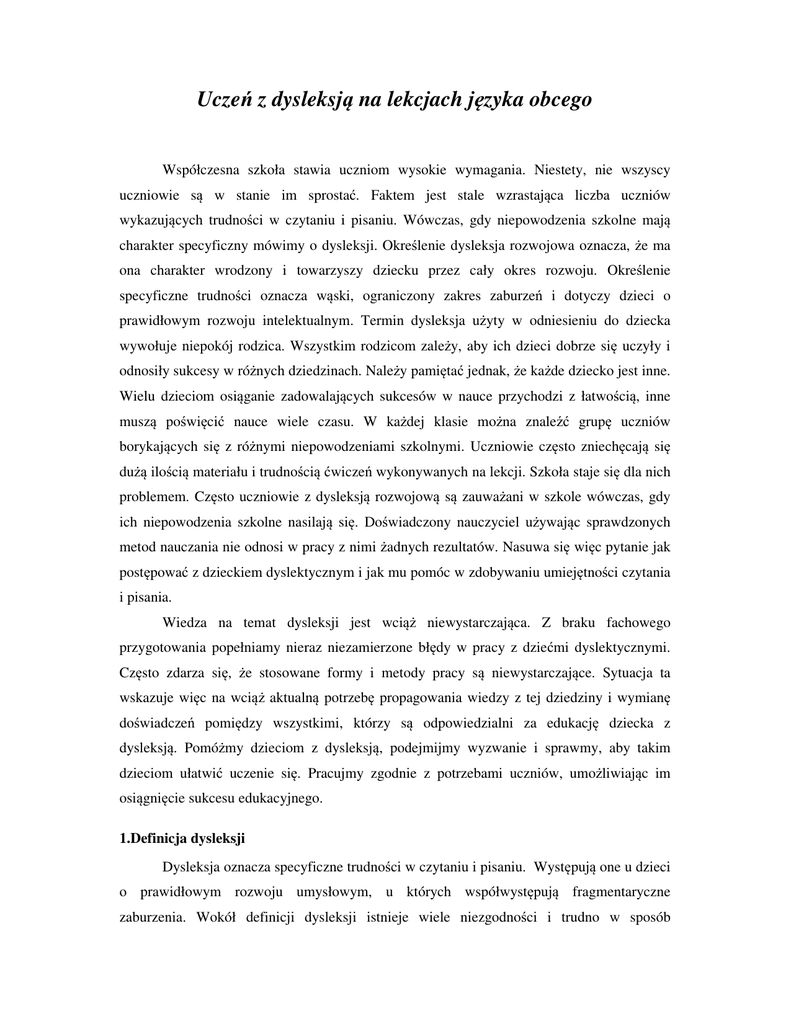 Uczeń z dysleksją na lekcjach języka obcego Współczesna szkoła stawia uczniom wysokie wymagania. Niestety, nie wszyscy uczniowie są w stanie im sprostać. Faktem jest stale wzrastająca liczba uczniów wykazujących trudności w czytaniu i pisaniu. Wówczas, gdy niepowodzenia szkolne mają charakter specyficzny mówimy o dysleksji. Określenie dysleksja rozwojowa oznacza, że ma ona charakter wrodzony i towarzyszy dziecku przez cały okres rozwoju. Określenie specyficzne trudności oznacza wąski, ograniczony zakres zaburzeń i dotyczy dzieci o prawidłowym rozwoju intelektualnym. Termin dysleksja użyty w odniesieniu do dziecka wywołuje niepokój rodzica. Wszystkim rodzicom zależy, aby ich dzieci dobrze się uczyły i odnosiły sukcesy w różnych dziedzinach. Należy pamiętać jednak, że każde dziecko jest inne. Wielu dzieciom osiąganie zadowalających sukcesów w nauce przychodzi z łatwością, inne muszą poświęcić nauce wiele czasu. W każdej klasie można znaleźć grupę uczniów borykających się z różnymi niepowodzeniami szkolnymi. Uczniowie często zniechęcają się dużą ilością materiału i trudnością ćwiczeń wykonywanych na lekcji. Szkoła staje się dla nich problemem. Często uczniowie z dysleksją rozwojową są zauważani w szkole wówczas, gdy ich niepowodzenia szkolne nasilają się. Doświadczony nauczyciel używając sprawdzonych metod nauczania nie odnosi w pracy z nimi żadnych rezultatów. Nasuwa się więc pytanie jak postępować z dzieckiem dyslektycznym i jak mu pomóc w zdobywaniu umiejętności czytania i pisania. Wiedza na temat dysleksji jest wciąż niewystarczająca. Z braku fachowego przygotowania popełniamy nieraz niezamierzone błędy w pracy z dziećmi dyslektycznymi. Często zdarza się, że stosowane formy i metody pracy są niewystarczające. Sytuacja ta wskazuje więc na wciąż aktualną potrzebę propagowania wiedzy z tej dziedziny i wymianę doświadczeń pomiędzy wszystkimi, którzy są odpowiedzialni za edukację dziecka z dysleksją. Pomóżmy dzieciom z dysleksją, podejmijmy wyzwanie i sprawmy, aby takim dzieciom ułatwić uczenie się. Pracujmy zgodnie z potrzebami uczniów, umożliwiając im osiągnięcie sukcesu edukacyjnego. 1.Definicja dysleksji Dysleksja oznacza specyficzne trudności w czytaniu i pisaniu. Występują one u dzieci o prawidłowym rozwoju umysłowym, u których współwystępują fragmentaryczne zaburzenia. Wokół definicji dysleksji istnieje wiele niezgodności i trudno w sposób jednoznaczny i prosty identyfikować osoby dyslektyczne. Według Marty Bogdanowicz (Bogdanowicz, 1995, s.25) dla określenia specyficznych trudności w czytaniu i pisaniu używano następujących terminów: „ślepota słowna” (W. Pringle Morgan 1896), „legastenia” (P. Ranschburg, 1916), „wrodzona dysleksja” (J. Hinshelwood 1917), „dysleksja rozwojowa” (Critchley, 1964). Specyficzne trudności w czytaniu i pisaniu opisano i nazwano wrodzoną „ślepotą słowną” 100 lat temu, gdy angielski okulista W. Pringle Morgan opisał przypadek 14 - letniego chłopca, który nie mógł nabyć umiejętności czytania mimo prawidłowego rozwoju intelektualnego, niezaburzonych zmysłów wzroku i słuchu. Zaburzenie nazwał „wrodzoną ślepotą słowną”. Termin ten miał podkreślać, że zaburzenia uniemożliwiające opanowanie umiejętności czytania mają charakter wrodzony, tzn., że istnieją od urodzenia a nie są nabywane w ciągu życia dziecka. W krajach niemieckojęzycznych często używanym terminem był termin „lagastenia” wprowadzony w 1916 roku przez P. Ranschburga. Termin „dysleksja” po raz pierwszy został zastosowany w roku 1887 przez R. Berlina, profesora ze Stuttgartu. Autor mianem tym określił rzadkie formy zaburzeń uczenia się objawiające się utratą zdolności do czytania u dorosłych. Z czasem zaczęto do tego terminu dodawać określenia „ wrodzona”, „rozwojowa”. W 1917 roku na oznaczenie specyficznych trudności w czytaniu i pisaniu zaczęto używać terminu „dysleksja wrodzona”. Termin „dysleksja rozwojowa” rozpowszechnił MacDonald Critchley w latach 60. Wielu autorów powołuje się jednak na definicję tego zaburzenia, które oficjalnie zostało przyjęte przez Światową Federację Neurologów w 1968 roku. Zawiera następujący zapis: „Specyficzna rozwojowa dysleksja to zaburzenie manifestujące się trudnościami w nauce czytania, mimo stosowania konwencjonalnych metod nauczania, normalnej inteligencji i sprzyjających warunków społeczno-kulturowych. Jest spowodowana zaburzeniami podstawowych zdolności poznawczych, które często uwarunkowane są konstytucjonalnie” (Bogdanowicz, 2009, s. 23). Powszechnie jednak uznaje się definicję, która została opublikowana w 1994 roku przez Towarzystwo im. Ortona. Jest ona bardziej precyzyjna niż poprzednie. Brzmi ona następująco: „Dysleksja jest jednym z wielu różnych rodzajów trudności w uczeniu się. Jest specyficznym trudnościami zaburzeniem w uwarunkowanym dekodowaniu pojedynczych konstytucjonalnie. słów, co Charakteryzuje najczęściej się odzwierciedla niewystarczające zdolności przetwarzania fonologicznego. Trudności w dekodowaniu pojedynczych słów są zazwyczaj niewspółmierne do wieku życia oraz innych zdolności poznawczych i umiejętności szkolnych; trudności te nie są wynikiem ogólnego zaburzenia rozwoju ani zaburzeń sensorycznych. Dysleksja manifestuje się różnorodnymi trudnościami w odniesieniu do różnych form komunikacji językowej, często oprócz trudności w czytaniu (reading problems) dodatkowo pojawiają się poważne trudności w opanowaniu czynności pisania (writing) i poprawnej pisowni (spelling)” (Bogdanowicz, 2009, s. 25) Zgodnie z powyższą definicją specyfika trudności w czytaniu i pisaniu to wyróżnik dysleksji spośród innych trudności w uczeniu się. Termin dysleksja występuje z określeniem „rozwojowa”. Oznacza to, że