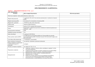 Załącznik nr 2- DZ-2501/408/15/1 Dostawa aparatury laboratoryjnej do PIWet-PIB w Puławach OPIS PRZEDMIOTU ZAMÓWIENIA Zadanie 1 - SPEKTROFOTOMETR UV/VIS – szt. 1 CPV: 38 50 00 00-0 Parametr Opis wymagań dla parametru Oferowane parametry Oferowane urządzenie: należy podać producenta, model, nr kat. Długość drogi optycznej w granicach: 0.03, do 0,5 mm ustawiana automatycznie w zależności od stężenia próbki Objętość mierzonej próbki od minimum 0,5 µl niezależnie od stężenia próbki Długość fali w granicach: 190-840 nm, pełny zakres skanowania Źródło światła błyskowa lampa ksenonowa Typ detektora Precyzja pomiaru absorbancji: matryca CCD co najmniej 2048 elementów bezpośrednio w próbce bez użycia kuwet, mikrokuwet, końcówek pomiarowych, nakrywek – „cups” 0,001 Dokładność pomiaru absorbancji: 2% Zakres absorbancji w granicach: 0,04-500 Abs 2-25 000 ng/µl oraz od 0,10mg/ml (BSA) do 750 mg/ml BSA bez potrzeby powtarzania pomiaru próbki o nieznanym stężeniu, bez konieczności zagęszczania lub rozcieńczania <4 sek łącznie z czyszczeniem Pomiar Zakres pomiaru stężenia dsDNA Czas całego cyklu pomiarowego Statyw pomiarowy instrumentu Pomiar wydajności wyznakowania sond fluorescencyjnych w nanokropli Wymiary zewnętrzne urządzenia Wyposażenie urządzenia Oprogramowanie nie może być elementem wymiennym instrumentu wymagane nie większe niż: 20 x 33 cm wbudowany dotykowy, kolorowy ekran o przekątnej co najmniej 7 cali do sterowania urządzeniem urządzenie powinno posiadać wewnętrzny mikroprocesor do pełnej obsługi oprogramowania. Pomiar nie wymaga zewnętrznego komputera. Oprogramowanie sterujące mobilne z interfejsem graficznym. Oprogramowanie w j. polskim. Możliwość tworzenia własnych krzywych standardowych (kalibracji, wzorcowych) oraz możliwość pomiaru białka metodą metodami kolorymetrycznymi, metoda Bradforda, Lowry`ego, Pierca, BCA, .…………………………… data i podpis czytelny lub parafa z pieczęcią imienną Załącznik nr 2- DZ-2501/408/15/1 Dostawa aparatury laboratoryjnej do PIWet-PIB w Puławach Wyposażenie urządzenia Długość drogi optycznej Limit detekcji dla modułu kuwetowego Stężenie próbki dla modułu kuwetowego Możliwość podłączenia do urządzenia skanera bar kodów probówek 1D i 2D Urządzenie musi posiadać możliwość rozbudowy Drukarka termiczna Stacja do przygotowywania próbki do pomiaru Pozostałe spektrofotometryczna przy długości fali 280 nm, Metody pomiarowe dla ds. DNA, ss DNA, RNA , oligonukletorydów, mikromacierzy możliwość wybierania grup długości fali przy jakiej ma być pomiar w aplikacji UV/VIS Oprogramowanie musi pozwalać na eksport wyników do programu Excel Oprogramowanie musi pozwalać na tworzenie własnych metod z lub bez użycia krzywych standardowych Oprogramowanie automatycznie wyświetla pełne spektrum UV-Vis od 190840nm Oprogramowanie posiadające przycisk automatycznego pomiaru kolejnej próbki, moduł pozwalający na automatyczne przeliczanie stężeń Urządzenie wyposażone w Wi-Fi, port Ethernet oraz 3 porty USB Urządzenie wyposażone w moduł pomiaru w kuwecie do pomiarów kinetycznych i stężenia kultur komórkowych OD600 Wbudowany inkubator z możliwością podgrzewania kuwety w zakresie do 37ºC do 45°C dokładność +-0,5ºC 10,5,2,1 mm nie gorszy niż 0,4 ng/µl (dsDNA) co najmniej 750 ng/µl (dsDNA) wymagane za pomocą podłączenia przez port USB o przystawkę do pomiaru próbek fluorescencyjnych w probówkach PCR. Moduł do pomiarów fluorescencyjnych musi dawać możliwość pomiaru od 10 pikogramów/µl dsDNA oraz musi być wyposażony w trzy LED-y jako źródło światła (niebieski LED ok. 470 nm, zielony LED ok 525nm, czerwony LED ok 636nm) Spektrofotometr musi być wyposażony w drukarkę termiczną tej samej firmy, która jest zainstalowana poprzez podłączenie przez port USB. Do spektrofotometru musi być dołączone 200 sztuk kuwet jednorazowych oraz dwie kuwety kwarcowe przeznaczone do pomiaru w porcie kuwetowym tego spektrofotometru. Spektrofotometr musi być dostarczony wraz z stacją umożliwiającą przygotowanie próbki do pomiaru. Stacja musi mieć możliwość zmieszania próbki (zworteksowania) oraz musi mieć możliwość wirowania jednocześnie 12 próbek 2 ml lub 0,2 ml przy maksymalnie 13 500 RPM oraz maksymalnym RCF x g 12 300. gwarancja: min. 12 miesięcy, instrukcja w języku polskim lub angielskim, bezpłatny serwis gwarancyjny, .…………………………… data i podpis czytelny lub parafa z pieczęcią imienną Załącznik nr 2- DZ-2501/408/15/1 Dostawa aparatury laboratoryjnej do PIWet-PIB w Puławach serwis pogwarancyjny, autoryzowany serwis na terenie Polski, czas reakcji serwisu przypadku awarii – do 48 godzin, czas naprawy w przypadku sprowadzenia części z zagranicy – do 14 dni roboczych, montaż, instalacja, pierwsze uruchomienie i szkolenia personelu w miejscu użytkowania, w siedzibie Zamawiającego. Przez „czas reakcji” należy rozumieć czas, w którym serwisant, po otrzymaniu zgłoszenia, stawi się w siedzibie końcowego użytkownika i przystąpi do niezwłocznego usunięcia usterek. Zadanie 2 – WIRÓWKA Z CHŁODZENIEM – szt. 1 CPV: 38 50 00 00-0 Parametr Opis wymagań dla parametru Oferowane parametry Oferowane urządzenie: należy podać producenta, model, nr kat. prędkość 200 do 14 000 obr/min zakres temperatur OD -9oC do +40oC wirnik wychylny, razem z koszami umożliwiający wirowanie do 3214 x g (3900 rpm) dostępne wirniki adaptery pojemność chłodzenie silnik liczba programów ustawienia tempa hamowania/przyspieszania zegar sterujący wymiary szafka możliwość stosowania wymiennych rotorów, łatwa i szybka wymiana rotorów 4 adaptery do wirowania 14 probówek 15ml każdy i 4 adaptery do wirowania 7 probówek 50 ml każdy możliwość wirowania w probówkach o poj. od 0,2 ml do 750 ml, a także płytek (przy użyciu odpowiednich adapterów – zama