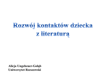 Alicja Ungeheuer-Gołąb Uniwersytet Rzeszowski Akt odbioru we wczesnym dzieciństwie N=P KOMUNIKAT O=D CZYTANIA DOMOWE Zespół oddziaływań zapoznających dziecko z rozmaitymi formami wypowiedzi literackiej przez pośrednika, odbywający się w domowym zaciszu Opowieści ustne Opowieści czytane oglądanie obrazków wykonanie rozpoznanie Sfery psychiczne dziecięcego odbiorcy literatury Dziecko – jedność ducha, ciała i umysłu • Kołysanka – sfera podświadoma • Wyliczanka – sfera behawioralna • Bajeczka – sfera intelektualna Etapy czytania: * kołysanki, teksty do zabaw niemowlęcych * recytowanie rymowanek i krótkich wierszyków * oglądanie obrazków i ilustracji * opowiadanie bajeczek * opowiadanie historyjek "domowych" *opowiadanie baśni *opowiadanie lub czytanie opowieści o zwierzętach i przyrodzie * czytanie dłuższych utworów * samodzielna lektura Kierunki przekazu oralnego pośrednika lektury Sposób opowiadania: • tembr głosu, tempo, intonacja, akcentowanie, pauzy • wykorzystywanie walorów dramatycznych dzieła • powtarzanie Wartości kinetyczne literatury dla dziecka: • doświadczenia dotykowe, czuciowe, ruchowe i przestrzenne dziecko - odbiorca Atmosfera przekazu: • miłość • akceptacja b Treści utworów Rola ilustracji: • wspólne oglądanie ilustracji • odpowiadanie na pytania dziecka • teatralizacja Ważne zjawiska współczesnej literatury dziecięcej i młodzieżowej * realizm magiczny * przełamywanie tabu * karnawalizacja świata * przewaga archetypu nad sygnaturą * chęć zawłaszczenia wyobraźnią czytelnika * wykorzystywanie języka baśni * funkcja inicjacyjna * kryminał i horror Ważne zjawiska współczesnej literatury dziecięcej i młodzieżowej * sentymentalizm * zjawisko gry/zabawy z czytelnikiem * dekonstrukcjonizm i postmodernizm Nurt imaginacyjny • Niebieska niedźwiedzica Joanna Chmielewska il. Jona Jung • Moje, nie moje, il. Krystyna Lipka-Sztarbałło, Zielony wędrowiec Liliana Bardijewska il. Adam Kilian • Sen, który odszedł Anna Onichimowska il. K. Lipka-Sztarbalło • Wyspa Urodzinowa Ewa Maria Letki il. M. Ekier • Król i mgła Ewa Maria Letki il. Ewa Poklewska-Kozielło • Bal u zegarmistrza Teofila, Podróż do krainy Om. Opowieść hipotetyczna Marta Tomaszewska • Lustro pana Grymsa Dorota Terakowska • Cyryl, gdzie jesteś? Krótka, ale opowieść, Wiktor Woroszylski • Wio, Leokadio Joanna Kulmowa • W Nieparyżu i gdzie indziej Anna Kamieńska • Dobry potwór nie jest zły Anna Onichimowska Nurt detektywistyczny • Detektyw Pozytywka, Nowe kłopoty detektywa Pozytywki Grzegorz Kasdepke, • Seria o Zuzi – Zuzia na zamku Białej Damy, Zuzia i Panna N. Mariusz Niemycki • Dziwne przypadki Ferdynanda Szkodnika Marcin Pałasz • Bery, gangster i góra kłopotów Małgorzata Strękowska-Zaremba • Agencja detektywistyczna Jacek Dubois • Pojedynek detektywów Arkadiusz Niemirski • Felix, Net i Nika (cykl 1-6) Rafał Kosik • Detektyw Kefirek M. Strękowska-Zaremba Nurt horror story • • • • • • • • • • • • • • Bożęta i my Ewa Nowacka Duch starej kamienicy Anna Onichimowska Maciek i łowcy duchów Anna Onichimowska Straszyć nie jest łatwo Marcin Pałasz Opowieści ze starego strychu Beata Ostrowicka Nędzny żywot bagiennego wampira Mariusz Niemycki Widma z ulicy Widmowej. Koszmarne przygody Koszmariusza i Horroraty Kalina Jerzykowska Kluska, Kefir i Tutejszy Jerzego Broszkiewicza, Wielki pościg – Julia Hartwig i Artur Międzyrzecki, poezja Wiersze, że aż strach! Małgorzata Strzałkowska Ala Betka i demon miasta Ida Pierelotkin Strach ma wielkie oczy Marcin Pałasz, Gdy diabeł mówi, do usług Joanna Olech, Czarny Młyn Marcin Szczygielski Dziękuję za uwagę