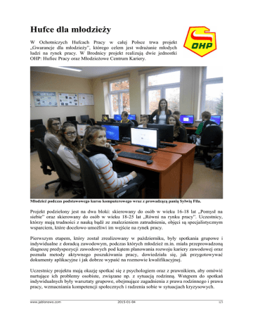 Hufce dla młodzieży W Ochotniczych Hufcach Pracy w całej Polsce trwa projekt „Gwarancje dla młodzieży”, którego celem jest wdrażanie młodych ludzi na rynek pracy. W Brodnicy projekt realizują dwie jednostki OHP: Hufiec Pracy oraz Młodzieżowe Centrum Kariery. Młodzież podczas podstawowego kursu komputerowego wraz z prowadzącą panią Sylwią Fila. Projekt podzielony jest na dwa bloki: skierowany do osób w wieku 16-18 lat „Pomysł na siebie” oraz skierowany do osób w wieku 18-25 lat „Równi na rynku pracy”. Uczestnicy, którzy mają trudności z nauką bądź ze znalezieniem zatrudnienia, objęci są specjalistycznym wsparciem, które docelowo umożliwi im wejście na rynek pracy. Pierwszym etapem, który został zrealizowany w październiku, były spotkania grupowe i indywidualne z doradcą zawodowym, podczas których młodzież m.in. miała przeprowadzoną diagnozę predyspozycji zawodowych pod kątem planowania rozwoju kariery zawodowej oraz poznała metody aktywnego poszukiwania pracy, dowiedziała się, jak przygotowywać dokumenty aplikacyjne i jak dobrze wypaść na rozmowie kwalifikacyjnej. Uczestnicy projektu mają okazję spotkać się z psychologiem oraz z prawnikiem, aby omówić nurtujące ich problemy osobiste, związane np. z sytuacją rodzinną. Wstępem do spotkań indywidualnych były warsztaty grupowe, obejmujące zagadnienia z prawa rodzinnego i prawa pracy, wzmacniania kompetencji społecznych i radzenia sobie w sytuacjach kryzysowych. www.jablonowo.com 2015-01-04 1/3 Na warsztatach z doradztwa zawodowego uczestnicy poznali m.in. swoje predyspozycje zawodowe. Najmłodsza grupa projektowa z opiekunem Iwoną Meller oraz komendantem Hufca Pracy Dariuszem Malinowskim www.jablonowo.com 2015-01-04 2/3 Nie wszyscy beneficjenci biorą udział we wszystkich zajęciach, wytypowani są do nich zgodnie z potrzebami i preferencjami zawodowymi. Cześć przeszła kurs komputerowy na poziomie podstawowym, kilkanaście osób uczestniczyło w kursie komputerowym zakończony egzaminem EDCL. Młodzież ucząca się ma zagwarantowane zajęcia wyrównawcze z przedmiotów szkolnych, z kolei młodzież bezrobotna została skierowana na kurs prawa jazdy kat. B. Dostępne są także kursy: językowy, przedsiębiorczości, zawodowe i kwalifikacyjne zawodowe. Starsi uczestnicy odbędą staże zawodowe, za które będą otrzymywali wynagrodzenie. Ochotnicze Hufce Pracy są jedną z instytucji (obok m.in. urzędów pracy), na której Ministerstwo Pracy i Polityki Społecznej oparło realizację „Gwarancji dla młodzieży”. Projekt jest odpowiedzią na propozycję Komisji Europejskiej w ramach programu „Pakiet na rzecz zatrudnienia młodzieży”. OHP od dawna angażuje się w podnoszenie kwalifikacji młodych ludzi, w samej tylko Brodnicy z pomocy skorzystało kilkadziesiąt osób. Magdalena Golubska, wychowawca 2-1 HP www.jablonowo.com 2015-01-04 3/3