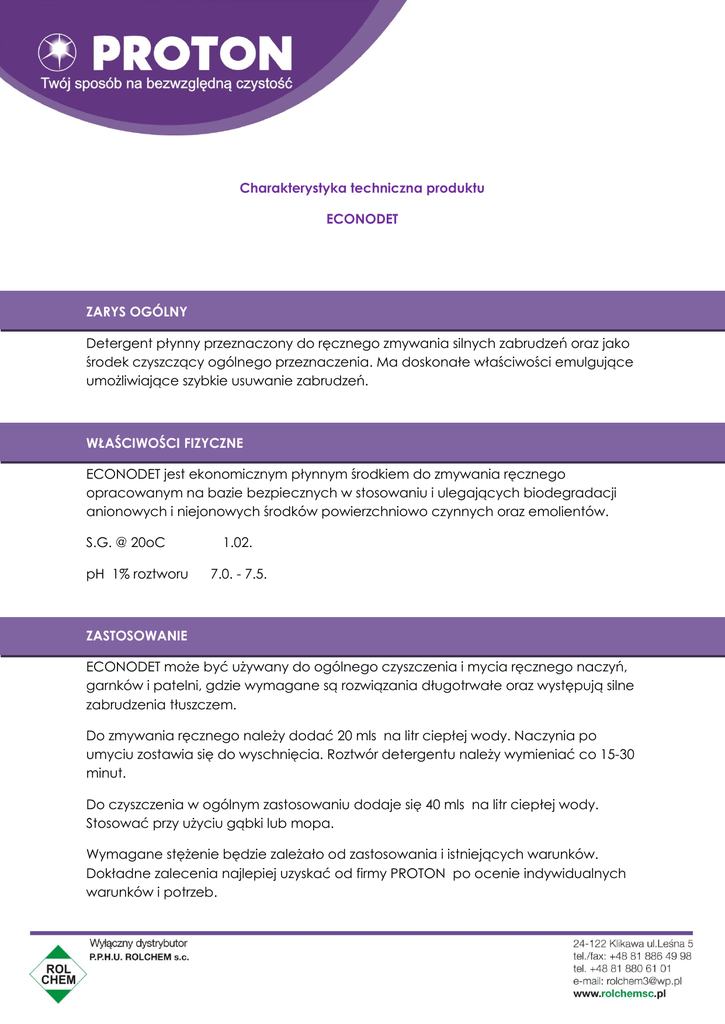 Charakterystyka techniczna produktu ECONODET ZARYS OGÓLNY Detergent płynny przeznaczony do ręcznego zmywania silnych zabrudzeń oraz jako środek czyszczący ogólnego przeznaczenia. Ma doskonałe właściwości emulgujące umożliwiające szybkie usuwanie zabrudzeń. WŁAŚCIWOŚCI FIZYCZNE ECONODET jest ekonomicznym płynnym środkiem do zmywania ręcznego opracowanym na bazie bezpiecznych w stosowaniu i ulegających biodegradacji anionowych i niejonowych środków powierzchniowo czynnych oraz emolientów. S.G. @ 20oC pH 1% roztworu 1.02. 7.0. - 7.5. ZASTOSOWANIE ECONODET może być używany do ogólnego czyszczenia i mycia ręcznego naczyń, garnków i patelni, gdzie wymagane są rozwiązania długotrwałe oraz występują silne zabrudzenia tłuszczem. Do zmywania ręcznego należy dodać 20 mls na litr ciepłej wody. Naczynia po umyciu zostawia się do wyschnięcia. Roztwór detergentu należy wymieniać co 15-30 minut. Do czyszczenia w ogólnym zastosowaniu dodaje się 40 mls na litr ciepłej wody. Stosować przy użyciu gąbki lub mopa. Wymagane stężenie będzie zależało od zastosowania i istniejących warunków. Dokładne zalecenia najlepiej uzyskać od firmy PROTON po ocenie indywidualnych warunków i potrzeb. OPAKOWANIE 4 x 5 l plastikowe pojemniki. 20 l plastikowe beczki. 25 l plastikowe beczki. 200 l plastikowe beczki. Dokument opracowany przez: The Proton Group Limited, Normanton Industrial Estate, Normanton, West Yorkshire, WF6 1QT. Tel: +44(0) 1924 892834 Data: 01.03.98 Odnośnik: econodet.neu Edycja: 98/2