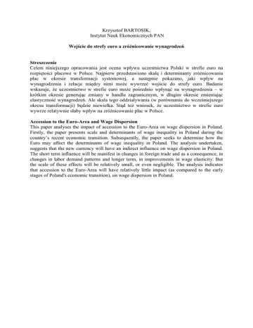 Krzysztof BARTOSIK, Instytut Nauk Ekonomicznych PAN Wejście do strefy euro a zróŜnicowanie wynagrodzeń Streszczenie Celem niniejszego opracowania jest ocena wpływu uczestnictwa Polski w strefie euro na rozpiętości płacowe w Polsce. Najpierw przedstawiono skalę i determinanty zróŜnicowania płac w okresie transformacji systemowej, a następnie pokazano, jaki wpływ na wynagrodzenia i relacje między nimi moŜe wywrzeć wejście do strefy euro. Badanie wskazuje, Ŝe uczestnictwo w strefie euro moŜe pośrednio wpłynąć na wynagrodzenia – w krótkim okresie generując zmiany w handlu zagranicznym, w długim okresie zmieniając elastyczność wynagrodzeń. Ale skala tego oddziaływania (w porównaniu do wcześniejszego okresu transformacji) będzie niewielka. Stąd teŜ wniosek, Ŝe uczestnictwo w strefie euro wywrze relatywnie słaby wpływ na zróŜnicowanie płac w Polsce. Accession to the Euro-Area and Wage Dispersion This paper analyses the impact of accession to the Euro-Area on wage dispersion in Poland. Firstly, the paper presents scale and determinants of wage inequality in Poland during the country’s recent economic transition. Subsequently, the paper seeks to determine how the Euro may affect the determinants of wage inequality in Poland. The analysis undertaken, suggests that the new currency will have an indirect influence on wage dispersion in Poland. The short term influence will be manifest in changes in foreign trade and as a consequence, in changes in labor demand patterns and longer term, in improvements in wage elasticity. But the scale of these effects will be relatively small, or even negligible. The analysis indicates that accession to the Euro-Area will have relatively little impact (as compared to the early stages of Poland's economic transition), on wage dispersion in Poland.