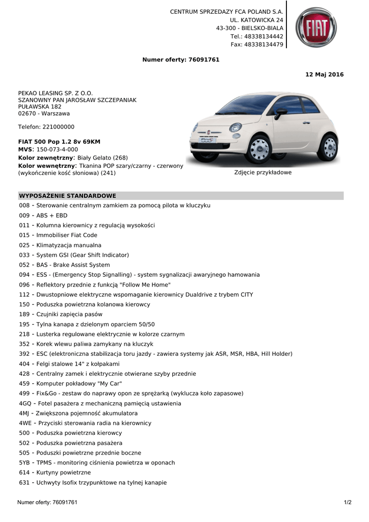 CENTRUM SPRZEDAZY FCA POLAND S.A. UL. KATOWICKA 24 43-300 - BIELSKO-BIALA Tel.: 48338134442 Fax: 48338134479 Numer oferty: 76091761 12 Maj 2016 PEKAO LEASING SP. Z O.O. SZANOWNY PAN JAROSŁAW SZCZEPANIAK PUŁAWSKA 182 02670 - Warszawa Telefon: 221000000 FIAT 500 Pop 1.2 8v 69KM MVS: 150-073-4-000 Kolor zewnętrzny: Biały Gelato (268) Kolor wewnętrzny: Tkanina POP szary/czarny - czerwony (wykończenie kość słoniowa) (241) Zdjęcie przykładowe WYPOSAŻENIE STANDARDOWE - Sterowanie centralnym zamkiem za pomocą pilota w kluczyku 009 - ABS + EBD 011 - Kolumna kierownicy z regulacją wysokości 015 - Immobiliser Fiat Code 025 - Klimatyzacja manualna 033 - System GSI (Gear Shift Indicator) 052 - BAS - Brake Assist System 094 - ESS - (Emergency Stop Signalling) - system sygnalizacji awaryjnego hamowania 096 - Reflektory przednie z funkcją "Follow Me Home" 112 - Dwustopniowe elektryczne wspomaganie kierownicy Dualdrive z trybem CITY 150 - Poduszka powietrzna kolanowa kierowcy 189 - Czujniki zapięcia pasów 195 - Tylna kanapa z dzielonym oparciem 50/50 218 - Lusterka regulowane elektrycznie w kolorze czarnym 352 - Korek wlewu paliwa zamykany na kluczyk 392 - ESC (elektroniczna stabilizacja toru jazdy - zawiera systemy jak ASR, MSR, HBA, Hill Holder) 404 - Felgi stalowe 14" z kołpakami 428 - Centralny zamek i elektrycznie otwierane szyby przednie 459 - Komputer pokładowy "My Car" 499 - Fix&Go - zestaw do naprawy opon ze sprężarką (wyklucza koło zapasowe) 4GQ - Fotel pasażera z mechaniczną pamięcią ustawienia 4MJ - Zwiększona pojemność akumulatora 4WE - Przyciski sterowania radia na kierownicy 500 - Poduszka powietrzna kierowcy 502 - Poduszka powietrzna pasażera 505 - Poduszki powietrzne przednie boczne 5YB - TPMS - monitoring ciśnienia powietrza w oponach 614 - Kurtyny powietrzne 631 - Uchwyty Isofix trzypunktowe na tylnej kanapie 008 Numer oferty: 76091761 1/2 - Trójkąt ostrzegawczy 665 - Zapalniczka 692 - Reflektory dodatkowe do jazdy dziennej (DRL) 6ZE - Radio Uconnect (bez CD) z portami USB i AUX 77N - Zestaw wskaźników analogowy z ekranem komputera pokładowego 823 - Gniazdko zasilające 12V na tunelu środkowym 876 - Zderzaki w kolorze nadwozia 890 - Uchwyt po stronie pasażera 912 - Gaśnica 661 CENA SAMOCHODU BAZOWEGO FIAT 500 Pop 1.2 8v 69KM NETTO BRUTTO 38.211,38 PLN 47.000,00 PLN WYPOSAŻENIE DODATKOWO PŁATNE NETTO BRUTTO 5CA Lakier pastelowy 1.097,56 PLN 1.350,00 PLN Suma 1.097,56 PLN 1.350,00 PLN 39.308,94 PLN 48.350,00 PLN NETTO BRUTTO Rabat specjalny -7.232,84 PLN -8.896,40 PLN Suma -7.232,84 PLN -8.896,40 PLN Cena pojazdu z wyposażeniem RABATY PODSUMOWANIE Suma VAT( 23 %) Łącznie do zapłaty NETTO BRUTTO 32.076,10 PLN 39.453,60 PLN 7.377,50 PLN 0,00 PLN 39.453,60 PLN 39.453,60 PLN Dziękujemy za zainteresowanie. Wiktor Ogłoziński CENTRUM SPRZEDAZY FCA POLAND S.A. UL. KATOWICKA 24 43-300 BIELSKO-BIALA Email: [email protected] Oferta jest ważna przez 30 dni począwszy od dzisiaj. Warunki oferty mają charakter orientacyjny i mogą zostać zmienione w momencie uaktualnienia cen lub warunków promocji. Zdjęcie samochodu może odbiegać od oferowanej wersji. Numer oferty: 76091761 2/2