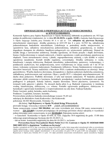 Komornik Sądowy (dawniej Rew.Bartło) przy Sądzie Rejonowym w Opolu Bartłomiej Jabłoński Kancelaria Komornicza Gen. Zajączka 18/4, 45-050 Opole tel. (077)4566831 fax (077)4537426 e-mail: [email protected] www.opolekomornik.pl BJ Km 3451/14 Opole, dnia 21-08-2015 P.T. Komornik Sądowy przy Sądzie Rejonowym w Opolu Bartłomiej Jabłoński ul. gen. Józefa Zajączka 18 45-050 Opole << ODPIS >> *0020001024955* OBWIESZCZENIE O PIERWSZEJ LICYTACJI NIERUCHOMOŚCI nr KWOP1O/00040069/8 Komornik Sądowy przy Sądzie Rejonowym w Opolu Bartłomiej Jabłoński na podstawie art. 953 kpc podaje do publicznej wiadomości, że: w dniu 05-10-2015r. o godz. 10:00 w budynku Sądu Rejonowego w Opolu mającego siedzibę przy Ozimska 60 A w sali nr 129, odbędzie się pierwsza licytacja nieruchomości stanowiącej działkę gruntową nr 623/139 km 4 o pow. 0,3763 ha, zabudowaną jednorodzinnym budynkiem mieszkalnym. Lokalizacja w pośredniej strefie miejscowości, w sąsiedztwie lasu, zabudowy mieszkaniowej jednorodzinnej, zabudowy gospodarczej, ze średnio dogodnym dostępem do obiektów handlowo-usługowych czy użyteczności publicznej. Dojazd do działki drogą o nawierzchni asfaltowej. Działka ogrodzona, od frontu przęsła i słupki drewniane, brama i furtka drewniane w ramach stalowych, z boków ogrodzenie z siatki powlekanej, panelowej na słupkach. Teren nieruchomości równy i płaski, zagospodarowany zielenią, z tyłu działki w części ogrodowej nasadzenia. Kształt działki regularny, czworokątny. Działka uzbrojona w wodę, kanalizację i energię elektryczną. Budynek mieszkalny, jednorodzinny, parterowy, wolnostojący, z poddaszem użytkowym, bez podpiwniczenia, nowo wybudowany (w mojej ocenie od 5 do 10 lat temu), wykonany systemem tradycyjnym. Fundamenty żelbetowe. Ściany fundamentowe wykonane z bloczków betowych. Ściany nadziemia z bloczków PGS z tynkiem strukturalnym na elewacji. Strop gęstożebrowy. Więźba dachowa drewniana, dwuspadowa z dachem pokrytym dachówką cementową, zakładkową, podwieszonym nad wejściem. Okna z profili PCV z żaluzjami antywłamaniowymi. W dachu okna połaciowe. Podbitki drewniane. Z tyłu nad tarasem zadaszenie. W budynku posadzki mieszane: płytki ceramiczne w korytarzu, łazienkach, przedpokoju i aneksie kuchennym oraz panele podłogowe w pokojach. Schody stalowe, stopnie drewniane. Drzwi płycinowe, systemowe. Na ścianach tynki gipsowe i gładzie. Na skosach dachu płyty k.-g. Budynek wyposażony w instalację wodną, kanalizacyjną, elektryczną, c.o. własne. Ponadto ogrzewanie podłogowe, elektryczne w łazienkach i ogrzewanie kominkowe z rozprowadzeniem na cały dom. Funkcja budynku: Parter: korytarz, pokój, łazienka, aneks kuchenny, Poddasze: 2 sypialnie, korytarz, łazienka. Powierzchnia użytkowa budynku mieszkalnego wynosi: 91,85 m2. należącej do dłużników:Anna Krakowska i Jan Krakowski położonej: 46-043 Biestrzynnik, Ozimska 1A, dla której Sąd Rejonowy w Opolu Wydział Ksiąg Wieczystych prowadzi księgę wieczystą o numerze KW [NKW: OP1O/00040069/8] Suma oszacowania wynosi 300 300,00zł, zaś cena wywołania jest równa 3/4 sumy oszacowania i wynosi 225 225,00zł. Licytant przystępujący do przetargu powinien złożyć rękojmię w wysokości jednej dziesiątej sumy oszacowania, to jest 30 030,00zł. Rękojmię można uiścić: - w kancelarii Komornika w Opole 45-050, ul. Gen. Zajączka 18/4 najpóźniej do godz. 15.00 dnia roboczego poprzedzającego licytację (do 02-10-2015 r.), - lub na konto komornika najpóżniej do dnia 04-10-2015 r. na konto: Powszechna Kasa Oszczędności Bank Polski SA I O. Centrum w Opolu 53 10203668 0000 5002 0093 0313 z dopiskiem "wadium na licytację" Zgodnie z przepisem art.976 §1 kpc w przetargu nie mogą uczestniczyć osoby, które mogą nabyć nieruchomość tylko za zezwoleniem organu państwowego, a zezwolenia tego nie przedstawiły oraz inne osoby wymienione w tym artykule. W ciągu dwóch ostatnich tygodni przed licytacją wolno oglądać nieruchomość w dni powszednie od godz.11:00 do godz.12:00 oraz przeglądać w Sądzie Rejonowym w Opolu przy Ozimska 60 A w pok. 116 odpis protokołu oszacowania nieruchomości, operat szacunkowy biegłego sądowego, wypis z rejestru gruntów wraz z mapką z akt postępowania egzekucyjnego. Prawa osób trzecich nie będą przeszkodą do licytacji i przysądzenia własności na rzecz nabywcy bez zastrzeżeń, jeżeli osoby te przed rozpoczęciem przetargu nie złożą dowodu, że wniosły powództwo o zwolnienie nieruchomości lub przedmiotów razem z nią zajętych od egzekucji i uzyskały w tym zakresie orzeczenie wstrzymujące egzekucję. Użytkowanie, służebności i prawa dożywotnika, jeżeli nie są ujawnione w księdze wieczystej lub przez złożenie dokumentu do zbioru dokumentów i nie zostaną zgłoszone najpóźniej na trzy dni przed rozpoczęciem licytacji, nie będą uwzględnione w dalszym toku egzekucji i wygasną z chwilą uprawomocnienia się postanowienia o przysądzeniu własności. Kandydaci na nabywców licytacyjnych pozostający w związku małżeńskim i których stosunki majątkowe kształtowane są umową małżeńską, powinni na licytację stawić się wraz z notarialnym odpisem przedmiotowej umowy. Osoby pozostające w związku małżeńskim przystępujące do licytacji bez współmałżónka (ki) aby móc uczestniczyć w licytacji muszą przedstawić notarialne pełnomocnictwo do dokonywania czynności prawnej w imieniu nieobecnego. z upoważnienia Komornika asesor Szymon Krawczyk z upoważnienia Komornika Komornik Sądowy asesor Jacek Szczepaniec Bartłomiej Jabłoński