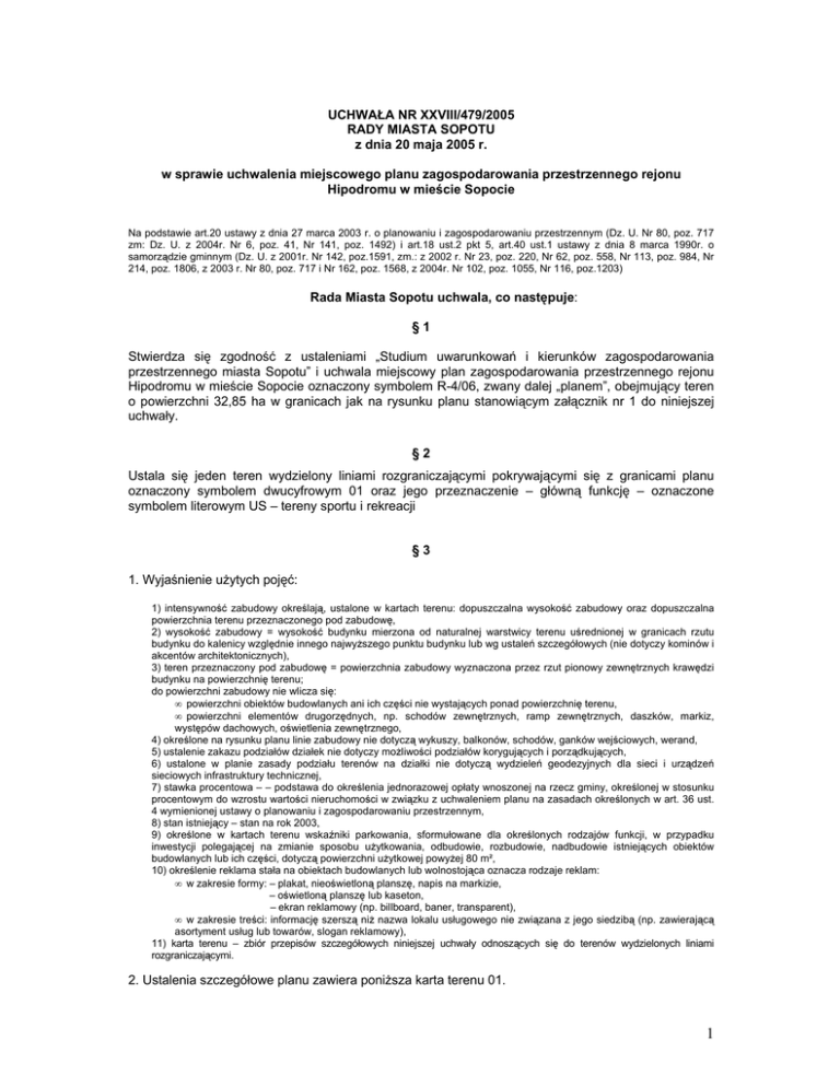 UCHWAŁA NR XXVIII/479/2005 RADY MIASTA SOPOTU z dnia 20 maja 2005 r. w sprawie uchwalenia miejscowego planu zagospodarowania przestrzennego rejonu Hipodromu w mieście Sopocie Na podstawie art.20 ustawy z dnia 27 marca 2003 r. o planowaniu i zagospodarowaniu przestrzennym (Dz. U. Nr 80, poz. 717 zm: Dz. U. z 2004r. Nr 6, poz. 41, Nr 141, poz. 1492) i art.18 ust.2 pkt 5, art.40 ust.1 ustawy z dnia 8 marca 1990r. o samorządzie gminnym (Dz. U. z 2001r. Nr 142, poz.1591, zm.: z 2002 r. Nr 23, poz. 220, Nr 62, poz. 558, Nr 113, poz. 984, Nr 214, poz. 1806, z 2003 r. Nr 80, poz. 717 i Nr 162, poz. 1568, z 2004r. Nr 102, poz. 1055, Nr 116, poz.1203) Rada Miasta Sopotu uchwala, co następuje: §1 Stwierdza się zgodność z ustaleniami „Studium uwarunkowań i kierunków zagospodarowania przestrzennego miasta Sopotu” i uchwala miejscowy plan zagospodarowania przestrzennego rejonu Hipodromu w mieście Sopocie oznaczony symbolem R-4/06, zwany dalej „planem”, obejmujący teren o powierzchni 32,85 ha w granicach jak na rysunku planu stanowiącym załącznik nr 1 do niniejszej uchwały. §2 Ustala się jeden teren wydzielony liniami rozgraniczającymi pokrywającymi się z granicami planu oznaczony symbolem dwucyfrowym 01 oraz jego przeznaczenie – główną funkcję – oznaczone symbolem literowym US – tereny sportu i rekreacji §3 1. Wyjaśnienie uŜytych pojęć: 1) intensywność zabudowy określają, ustalone w kartach terenu: dopuszczalna wysokość zabudowy oraz dopuszczalna powierzchnia terenu przeznaczonego pod zabudowę, 2) wysokość zabudowy = wysokość budynku mierzona od naturalnej warstwicy terenu uśrednionej w granicach rzutu budynku do kalenicy względnie innego najwyŜszego punktu budynku lub wg ustaleń szczegółowych (nie dotyczy kominów i akcentów architektonicznych), 3) teren przeznaczony pod zabudowę = powierzchnia zabudowy wyznaczona przez rzut pionowy zewnętrznych krawędzi budynku na powierzchnię terenu; do powierzchni zabudowy nie wlicza się: • powierzchni obiektów budowlanych ani ich części nie wystających ponad powierzchnię terenu, • powierzchni elementów drugorzędnych, np. schodów zewnętrznych, ramp zewnętrznych, daszków, markiz, występów dachowych, oświetlenia zewnętrznego, 4) określone na rysunku planu linie zabudowy nie dotyczą wykuszy, balkonów, schodów, ganków wejściowych, werand, 5) ustalenie zakazu podziałów działek nie dotyczy moŜliwości podziałów korygujących i porządkujących, 6) ustalone w planie zasady podziału terenów na działki nie dotyczą wydzieleń geodezyjnych dla sieci i urządzeń sieciowych infrastruktury technicznej, 7) stawka procentowa – – podstawa do określenia jednorazowej opłaty wnoszonej na rzecz gminy, określonej w stosunku procentowym do wzrostu wartości nieruchomości w związku z uchwaleniem planu na zasadach określonych w art. 36 ust. 4 wymienionej ustawy o planowaniu i zagospodarowaniu przestrzennym, 8) stan istniejący – stan na rok 2003, 9) określone w kartach terenu wskaźniki parkowania, sformułowane dla określonych rodzajów funkcji, w przypadku inwestycji polegającej na zmianie sposobu uŜytkowania, odbudowie, rozbudowie, nadbudowie istniejących obiektów budowlanych lub ich części, dotyczą powierzchni uŜytkowej powyŜej 80 m², 10) określenie reklama stała na obiektach budowlanych lub wolnostojąca oznacza rodzaje reklam: • w zakresie formy: – plakat, nieoświetloną planszę, napis na markizie, – oświetloną planszę lub kaseton, – ekran reklamowy (np. billboard, baner, transparent), • w zakresie treści: informację szerszą niŜ nazwa lokalu usługowego nie związana z jego siedzibą (np. zawierającą asortyment usług lub towarów, slogan reklamowy), 11) karta terenu – zbiór przepisów szczegółowych niniejszej uchwały odnoszących się do terenów wydzielonych liniami rozgraniczającymi. 2. Ustalenia szczegółowe planu zawiera poniŜsza karta terenu 01. 1 3. Karta terenu: KARTA TERENU DO MIEJSCOWEGO PLANU ZAGOSPODAROWANIA PRZESTRZENNEGO NR R-4/06 1. NUMER TERENU: 01 2. POWIERZCHNIA: 32,85 ha. 3. PRZEZNACZENIE TERENU: US - teren sportu i rekreacji – fragment zespołu hipodromu, ośrodka sportów konnych z towarzyszącą zabudową usługową; dopuszcza się incydentalne wykorzystywanie terenu hipodromu dla organizacji imprez masowych nie związanych z główną funkcją terenu. 4. ZASADY OCHRONY I KSZTAŁTOWANIA ŁADU PRZESTRZENNEGO: 4.1 zespół hipodromu stanowi istotny element w układzie kompozycyjnym miasta i pozostaje w ścisłym związku przestrzennym z korytarzem ekologicznym Świemirowsko – Karlikowskim łączącym dolinę Świemirowską z pasem nadmorskim; zagospodarowanie terenu musi być zharmonizowane pod względem zasad zabudowy oraz proporcji powierzchni zabudowanej do terenów otwartych, a takŜe podporządkować się celowi uzyskania harmonijnej całości zespołu sportowo-rekreacyjnego, 4.2 zasady ochrony i kształtowania ładu przestrzennego określają ustalenia zawarte w punktach 5, 6, 7, 8, 9, 10, 11 5. ZASADY KSZTAŁTOWANIA ZABUDOWY I ZAGOSPODAROWANIA TERENU: 5.1 linie zabudowy – nieprzekraczalne linie zabudowy, jak na rysunku planu, 5.2 wysokość zabudowy – do 12,5m, 5.3 maksymalna wielkość terenu przeznaczonego pod zabudowę – w zasięgu określonych linii zabudowy - bez ograniczeń, 5.4 minimalna powierzchnia biologicznie czynna – 90% powierzchni terenu 01, 5.5 forma zabudowy – wolnostojąca, 5.6 geometria dachu – indywidualna forma dachów; w przypadku dachów spadzistych kąt nachylenia połaci dachowych do 45º, 5.7 intensywność zabudowy określają ustalenia zawarte w pkt. 5.2 i 5.3, 5.8 inne ● wyklucza się pokrycie dachów blachodachówką i dachówką bitumiczną, ● wymaga się wysokiego standardu zabudowy i wysokiej jakości rozwiązań architektonicznych. 6. ZASADY I WARUNKI SCALANIA I PODZIAŁU NIERUCHOMOŚCI: 6.1 wielkość działki – zakaz wydzielania nowych działek