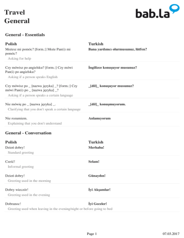 Travel General General - Essentials Polish Turkish Możesz mi pomóc? [form.:] Może Pan(i) mi pomóc? Asking for help Bana yardımcı olurmusunuz, lütfen? Czy mówisz po angielsku? [form.:] Czy mówi Pan(i) po angielsku? Asking if a person speaks English İngilizce konuşuyor musunuz? Czy mówisz po _ [nazwa języka] _? [form.:] Czy mówi Pan(i) po _ [nazwa języka] _? Asking if a person speaks a certain language _[dil]_ konuşuyor musunuz? Nie mówię po _ [nazwa języka] _. Clarifying that you don't speak a certain language _[dil]_ konuşmuyorum. Nie rozumiem. Explaining that you don't understand Anlamıyorum General - Conversation Polish Turkish Dzień dobry! Standard greeting Merhaba! Cześć! Informal greeting Selam! Dzień dobry! Greeting used in the morning Günaydın! Dobry wieczór! Greeting used in the evening İyi Akşamlar! Dobranoc! İyi Geceler! Greeting used when leaving in the evening/night or before going to bed Page 1 07.03.2017 Travel General Jak się masz? [form.:] Jak się Pan(i) ma? Nasılsın? Polite small talk enquiring about the other person's well-being Dobrze, dziękuję. Polite reply to 'How are you?' İyiyim, teşekkür ederim. Jak się nazywasz? [form.:] Jak się Pan(i) nazywa? Asking the other person's name Adın ne? Nazywam się ___. Telling someone your name Benim adım _. Skąd pochodzisz? [form.:] Skąd Pan(i) pochodzi? Asking about someone's origin Nerelisin? Pochodzę z ___. Answering about your origin Ben _lıyım. Ile masz lat? [form.:] Ile ma Pan(i) lat? Asking about someone's age Kaç yaşındasın? Mam ___ lat(a). Answering about your age Ben _ yaşındayım. Tak Positive reply Evet Nie Negative reply Hayır Proszę Filler word to add polite touch Lütfen Proszę bardzo! Used when giving something to someone Buradan gidin! Dziękuję. Thanking someone Teşekkür ederim. Page 2 07.03.2017 Travel General Dziękuję bardzo. Thanking someone very warmly Çok teşekkür ederim. Proszę bardzo! / Nie ma za co! Politely replying to a 'thank you' Rica ederim. Przepraszam. Apologizing for something Üzgünüm. Przepraszam. Getting the attention of someone Afedersiniz. Nic się nie stało. Replying to an apology if you accept it Herşey yolunda. Nie ma sprawy. Replying to an apology if you accept it Sorun değil. Uwaga! Making someone aware of a danger Dikkat et! Jestem głodny/-a. Used when feeling hungry Acıktım. Chce mi się pić. Used when feeling thirsty Susadım. Jestem zmęczony/-a. Used when feeling tired Yorgunum. Źle się czuję. Used when feeling sick Hastayım. Nie wiem. You don't know the answer to a question Bilmiyorum. Miło było cię poznać. [form.:] Miło było Panią/Pana poznać. Polite good-bye phrase after first meeting Seninle tanışmak güzeldi. Page 3 07.03.2017 Travel General Do widzenia! Saying farewell Güle güle! General - Complaints Polish Turkish Chciał(a)bym złożyć skargę. Polite way of starting your complaint Bir şikayette bulunmak istiyorum. Kto tu rządzi? Finding out who is responsible Burada sorumlu kim? To jest absolutnie niedopuszczalne! Strongly expressing your dissatisfaction Bu tamamen kabul edilemez birşey! Żądam zwrotu pieniędzy! Asking for a refund Paramı geri istiyorum! Czekamy ponad godzinę. Complaining about long waiting times Bir saatten fazla bir süredir bekliyoruz. General - Swearing Polish Turkish To jedzenie smakuje jak gówno! Rude way of showing displeasure with your food Bu yemek bok gibi! Ten napój/drink smakuje jak szczyny! Rude way of showing displeasure with a drink Bu içecek çiş gibi! To miejsce to obrzydliwa nora! Bu yer bok çukuru! Rude way of showing displeasure with an establishment Ten samochód to wrak! Rude way of showing displeasure with a car Bu araba döküntü! Obsługa jest do dupy! Rude way of showing displeasure with the service Hizmet berbat! Page 4 07.03.2017 Travel General To jest totalne zdzierstwo! Rudely complaining about a high price Bu tamamen bir soygun! Gówno prawda! Bu saçma! Rude way of showing disbelief in something someone said Kretyn/Kretynka! Insulting a person by criticizing his/her intelligence Sen aptal bir moronsun! Gówno wiesz! Insulting a person by criticizing his/her knowledge Bir bok bilmiyorsun! Odwal się! Rudely telling a person to leave immediately Siktir git! Załatwmy to na zewnątrz! Asking a person to fight outside of an establishment Hadi bunu dışarda halledelim! Page 5 Powered by TCPDF (www.tcpdf.org) 07.03.2017