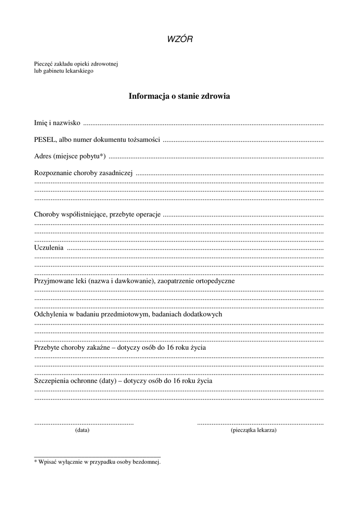 WZÓR Pieczęć zakładu opieki zdrowotnej lub gabinetu lekarskiego Informacja o stanie zdrowia Imię i nazwisko ..................................................................................................................................... PESEL, albo numer dokumentu tożsamości ......................................................................................... Adres (miejsce pobytu*) ....................................................................................................................... Rozpoznanie choroby zasadniczej ........................................................................................................ ................................................................................................................................................................ ................................................................................................................................................................ ................................................................................................................................................................ Choroby współistniejące, przebyte operacje ......................................................................................... ................................................................................................................................................................ ................................................................................................................................................................ ................................................................................................................................................................ Uczulenia .............................................................................................................................................. ................................................................................................................................................................ ................................................................................................................................................................ ................................................................................................................................................................ Przyjmowane leki (nazwa i dawkowanie), zaopatrzenie ortopedyczne ................................................................................................................................................................ ................................................................................................................................................................ ................................................................................................................................................................ Odchylenia w badaniu przedmiotowym, badaniach dodatkowych ................................................................................................................................................................ ................................................................................................................................................................ ................................................................................................................................................................ Przebyte choroby zakaźne – dotyczy osób do 16 roku życia ................................................................................................................................................................ ................................................................................................................................................................ ................................................................................................................................................................ Szczepienia ochronne (daty) – dotyczy osób do 16 roku życia ................................................................................................................................................................ ................................................................................................................................................................ ....................................................... (data) ___________________________________ * Wpisać wyłącznie w przypadku osoby bezdomnej. ...................................................................... (pieczątka lekarza)
