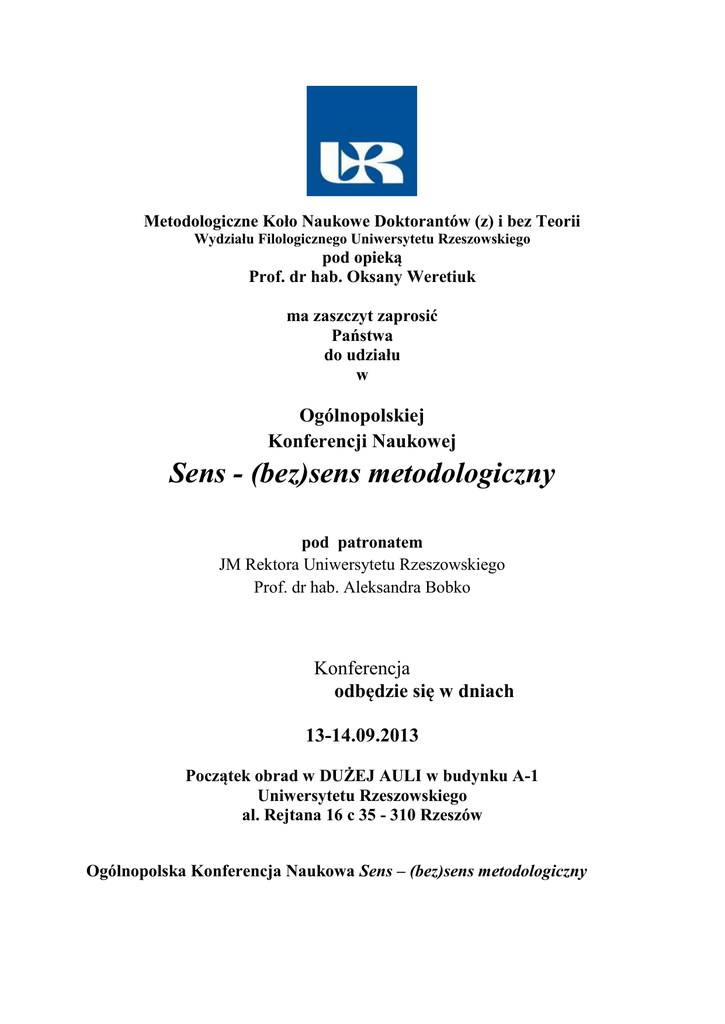 Metodologiczne Koło Naukowe Doktorantów (z) i bez Teorii Wydziału Filologicznego Uniwersytetu Rzeszowskiego pod opieką Prof. dr hab. Oksany Weretiuk ma zaszczyt zaprosić Państwa do udziału w Ogólnopolskiej Konferencji Naukowej Sens - (bez)sens metodologiczny pod patronatem JM Rektora Uniwersytetu Rzeszowskiego Prof. dr hab. Aleksandra Bobko Konferencja odbędzie się w dniach 13-14.09.2013 Początek obrad w DUŻEJ AULI w budynku A-1 Uniwersytetu Rzeszowskiego al. Rejtana 16 c 35 - 310 Rzeszów Ogólnopolska Konferencja Naukowa Sens – (bez)sens metodologiczny skierowana jest do studentów studiów doktoranckich, przedstawicieli różnych dyscyplin humanistycznych, którzy w referatach wykażą się umiejętnością wykorzystania poznanych metodologii i założeń teoretycznych pragniemy zachęcić do inicjatywy przede wszystkim początkujących naukowców oczekujemy przedstawienia problemów badawczych za pomocą przekonującej argumentacji, na fachowym, naukowym poziomie. Liczymy, że artykuły odznaczać się będą różnorodnością stylów, interpretacji, świeżością spojrzeń, nowatorstwem odczytań oraz temperamentem badawczym. Główne aspekty tematyczne, czyli sensowność lub jej brak, pozwolą skrzyżować te zagadnienia z pojęciami zarówno natury filozoficznej, jak i literaturoznawczej. W związku z powyższym proponujemy stanowisko metodologiczne, najczęściej nazywane pluralizmem teoretycznym, które umożliwi zaprezentowanie na wskazanym przez siebie „materiale badawczym” różnorodność metod lub teorii. Przedmiotem refleksji mogą stać się następujące kwestie: nowe tematy badań stanowisko badacza „uwięzionego” między teorią a praktyką próba zastosowania teorii oraz metod w praktyce literackiej, a także językowej (bez)sens korzystania z postulatów metodologicznych zaprezentowanie oryginalnych pomysłów interpretacyjnych polemika z propozycjami teoretyków językoznawstwa tudzież literatury Powyższe sugestie nie wyczerpują problematyki planowanej konferencji, w związku z tym zachęcamy Państwa do zgłaszania własnych pomysłów. Prosimy o przesyłanie tematów wystąpień, krótkich abstraktów ( do 300 słów) oraz informacji kontaktowych (imię, nazwisko, reprezentowana placówka naukowa, numer telefonu, adres email) do 07.08.2013 roku, na adres elektroniczny: [email protected] Informacja o zakwalifikowaniu do udziału w konferencji zostanie podana najpóźniej 07.08.2013 roku W 2014 toku planujemy wydanie recenzowanej monografii naukowej MKNDT zastrzega sobie prawo wyboru artykułów do publikacji pokonferencyjnej. Przewidujemy opłatę konferencyjną w wysokości 100 złotych Komitet Naukowy Konferencji: JM Rektor Uniwersytetu Rzeszowskiego prof. dr hab. Aleksander Bobko Prorektor ds. Nauki Uniwersytetu Rzeszowskiego prof. dr hab. Sylwester Czopek Prorektor ds. Studenckich i kształcenia Uniwersytetu Rzeszowskiego dr hab. prof. UR Wojciech Walat Dziekan Wydziału Filologicznego dr hab. prof. UR Zenon Ożóg Prodziekan Wydziału Filologicznego ds. Nauki dr hab. prof. UR Kazimierz Maciąg Dyrektor Instytutu Filologii Polskiej dr hab. prof. UR Janusz Pasterski Kierownik Zakładu Języka Polskiego prof. dr hab. Kazimierz Ożóg Dyrektor Instytutu Filologii Angielskiej prof. dr hab. Grzegorz A. Kleparski Dyrektor Instytutu Filologii Niemieckiej dr hab. prof. UR Mariola Wierzbicka Dyrektor Instytutu Filologii Rosyjskiej dr Grzegorz Ziętala Dyrektor Instytutu Filozofii dr hab. prof. UR Przemysław Paczkowski Dr hab. prof. UR Magdalena Żardecka-Nowak Komitet Organizacyjny Konferencji: Przewodniczący Komitetu Organizacyjnego Konferencji prof. dr hab. Oksana Weretiuk Zastępcy Przewodniczącego Komitetu Organizacyjnego Konferencji: mgr Sylwia Indycka-Rosół (sprawy językoznawców) mgr Greta Alina Jagiełła (sprawy literaturoznawców) Sekretarze Komitetu Organizacyjnego Konferencji mgr Paulina Sienkiewicz (sprawy ogólne) mgr Karolina Krzysztoń (sprawy językoznawców) mgr Katarzyna Winnicka (sprawy literaturoznawców) Skarbnicy Komitetu Organizacyjnego Konferencji mgr Joanna Mazur (sprawy ogólne) mgr Artur Przybyła (sprawy językoznawców i literaturoznawców) Serdecznie zapraszamy Opiekun Naukowy MKNDT prof. dr hab. Oksana Weretiuk Prezes Zarządu MKNDT mgr Greta Alina Jagiełła