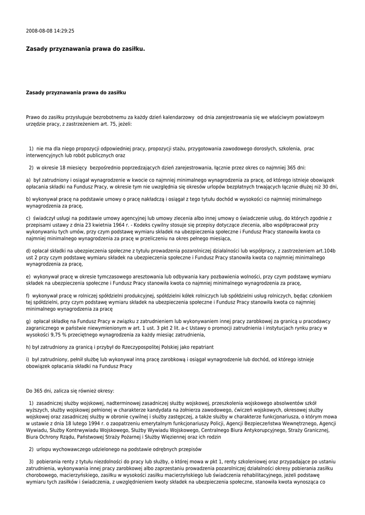 2008-08-08 14:29:25 Zasady przyznawania prawa do zasiłku. Zasady przyznawania prawa do zasiłku Prawo do zasiłku przysługuje bezrobotnemu za każdy dzień kalendarzowy od dnia zarejestrowania się we właściwym powiatowym urzędzie pracy, z zastrzeżeniem art. 75, jeżeli: 1) nie ma dla niego propozycji odpowiedniej pracy, propozycji stażu, przygotowania zawodowego dorosłych, szkolenia, prac interwencyjnych lub robót publicznych oraz 2) w okresie 18 miesięcy bezpośrednio poprzedzających dzień zarejestrowania, łącznie przez okres co najmniej 365 dni: a) był zatrudniony i osiągał wynagrodzenie w kwocie co najmniej minimalnego wynagrodzenia za pracę, od którego istnieje obowiązek opłacania składki na Fundusz Pracy, w okresie tym nie uwzględnia się okresów urlopów bezpłatnych trwających łącznie dłużej niż 30 dni, b) wykonywał pracę na podstawie umowy o pracę nakładczą i osiągał z tego tytułu dochód w wysokości co najmniej minimalnego wynagrodzenia za pracę, c) świadczył usługi na podstawie umowy agencyjnej lub umowy zlecenia albo innej umowy o świadczenie usług, do których zgodnie z przepisami ustawy z dnia 23 kwietnia 1964 r. - Kodeks cywilny stosuje się przepisy dotyczące zlecenia, albo współpracował przy wykonywaniu tych umów, przy czym podstawę wymiaru składek na ubezpieczenia społeczne i Fundusz Pracy stanowiła kwota co najmniej minimalnego wynagrodzenia za pracę w przeliczeniu na okres pełnego miesiąca, d) opłacał składki na ubezpieczenia społeczne z tytułu prowadzenia pozarolniczej działalności lub współpracy, z zastrzeżeniem art.104b ust 2 przy czym podstawę wymiaru składek na ubezpieczenia społeczne i Fundusz Pracy stanowiła kwota co najmniej minimalnego wynagrodzenia za pracę, e) wykonywał pracę w okresie tymczasowego aresztowania lub odbywania kary pozbawienia wolności, przy czym podstawę wymiaru składek na ubezpieczenia społeczne i Fundusz Pracy stanowiła kwota co najmniej minimalnego wynagrodzenia za pracę, f) wykonywał pracę w rolniczej spółdzielni produkcyjnej, spółdzielni kółek rolniczych lub spółdzielni usług rolniczych, będąc członkiem tej spółdzielni, przy czym podstawę wymiaru składek na ubezpieczenia społeczne i Fundusz Pracy stanowiła kwota co najmniej minimalnego wynagrodzenia za pracę g) opłacał składkę na Fundusz Pracy w związku z zatrudnieniem lub wykonywaniem innej pracy zarobkowej za granicą u pracodawcy zagranicznego w państwie niewymienionym w art. 1 ust. 3 pkt 2 lit. a-c Ustawy o promocji zatrudnienia i instytucjach rynku pracy w wysokości 9,75 % przeciętnego wynagrodzenia za każdy miesiąc zatrudnienia, h) był zatrudniony za granicą i przybył do Rzeczypospolitej Polskiej jako repatriant i) był zatrudniony, pełnił służbę lub wykonywał inną pracę zarobkową i osiągał wynagrodzenie lub dochód, od którego istnieje obowiązek opłacania składki na Fundusz Pracy Do 365 dni, zalicza się również okresy: 1) zasadniczej służby wojskowej, nadterminowej zasadniczej służby wojskowej, przeszkolenia wojskowego absolwentów szkół wyższych, służby wojskowej pełnionej w charakterze kandydata na żołnierza zawodowego, ćwiczeń wojskowych, okresowej służby wojskowej oraz zasadniczej służby w obronie cywilnej i służby zastępczej, a także służby w charakterze funkcjonariusza, o którym mowa w ustawie z dnia 18 lutego 1994 r. o zaopatrzeniu emerytalnym funkcjonariuszy Policji, Agencji Bezpieczeństwa Wewnętrznego, Agencji Wywiadu, Służby Kontrwywiadu Wojskowego, Służby Wywiadu Wojskowego, Centralnego Biura Antykorupcyjnego, Straży Granicznej, Biura Ochrony Rządu, Państwowej Straży Pożarnej i Służby Więziennej oraz ich rodzin 2) urlopu wychowawczego udzielonego na podstawie odrębnych przepisów 3) pobierania renty z tytułu niezdolności do pracy lub służby, o której mowa w pkt 1, renty szkoleniowej oraz przypadające po ustaniu zatrudnienia, wykonywania innej pracy zarobkowej albo zaprzestaniu prowadzenia pozarolniczej działalności okresy pobierania zasiłku chorobowego, macierzyńskiego, zasiłku w wysokości zasiłku macierzyńskiego lub świadczenia rehabilitacyjnego, jeżeli podstawę wymiaru tych zasiłków i świadczenia, z uwzględnieniem kwoty składek na ubezpieczenia społeczne, stanowiła kwota wynosząca co najmniej minimalne wynagrodzenie za pracę 4) niewymienione powyżej okresy, za które były opłacane składki na ubezpieczenia społeczne i Fundusz Pracy, jeżeli podstawę wymiaru składek stanowiła kwota wynosząca co najmniej minimalne wynagrodzenie za pracę 5) za które przyznano odszkodowanie z tytułu niezgodnego z przepisami rozwiązania przez pracodawcę stosunku pracy lub stosunku służbowego, oraz okres, za który wypłacono pracownikowi odszkodowanie z tytułu skrócenia okresu wypowiedzenia umowy o pracę 6) świadczenia usług na podstawie umowy uaktywniającej, o której mowa w art. 50 ustawy z dnia 04 dziećmi w wieku do lat 3 luty 2011r o opiece nad 7) pobierania renty rodzinnej, w przypadku gdy nastąpił zbieg prawa do tej renty z prawem do renty i wybrano pobieranie renty rodzinnej z tytułu niezdolności do pracy 8) sprawowania osobistej opieki nad dzieckiem przez osoby, o których mowa w art.6a ust.1 ustawy z systemie ubezpieczeń społecznych (Dz. U z 2013r poz. 1442 z późn. zm.) dnia 13 października 1998 o 9) pobierania świadczenia pielęgnacyjnego lub specjalnego zasiłku opiekuńczego na podstawie przepisów o świadczeniach rodzinnych, lub zasiłku dla opiekuna na podstawie przepisów o ustaleniu i wypłacie zasiłków dla opiekunów, jeżeli utrata prawa do nich była spowodowana śmiercią osoby, nad którą opieka była sprawowana (wejście w życie 01.01.2017r) Prawo do zasiłku przysługuje bezrobotnym zwolnionym z zakładów karnych i aresztów śledczych, zarejestrowanym w okresie 30 dni od dnia zwolnienia, jeżeli suma okresów, przypadających w okres