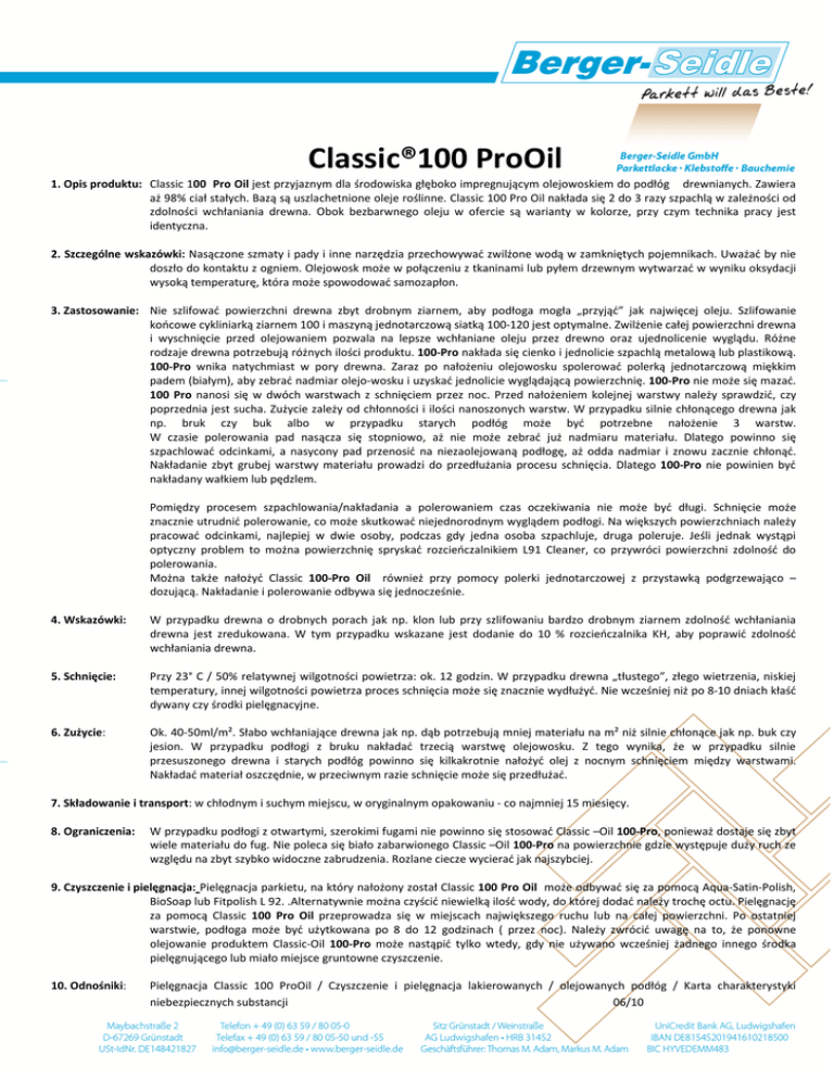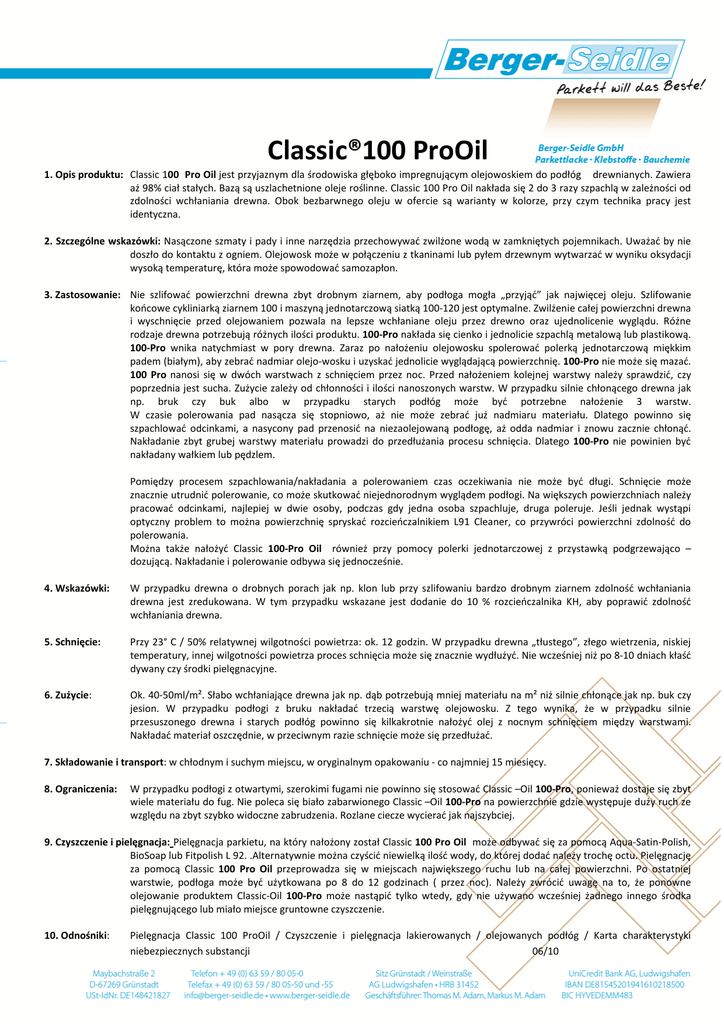Classic®100 ProOil 1. Opis produktu: Classic 100 Pro Oil jest przyjaznym dla środowiska głęboko impregnującym olejowoskiem do podłóg drewnianych. Zawiera aż 98% ciał stałych. Bazą są uszlachetnione oleje roślinne. Classic 100 Pro Oil nakłada się 2 do 3 razy szpachlą w zależności od zdolności wchłaniania drewna. Obok bezbarwnego oleju w ofercie są warianty w kolorze, przy czym technika pracy jest identyczna. 2. Szczególne wskazówki: Nasączone szmaty i pady i inne narzędzia przechowywać zwilżone wodą w zamkniętych pojemnikach. Uważać by nie doszło do kontaktu z ogniem. Olejowosk może w połączeniu z tkaninami lub pyłem drzewnym wytwarzać w wyniku oksydacji wysoką temperaturę, która może spowodować samozapłon. 3. Zastosowanie: Nie szlifować powierzchni drewna zbyt drobnym ziarnem, aby podłoga mogła „przyjąć” jak najwięcej oleju. Szlifowanie końcowe cykliniarką ziarnem 100 i maszyną jednotarczową siatką 100-120 jest optymalne. Zwilżenie całej powierzchni drewna i wyschnięcie przed olejowaniem pozwala na lepsze wchłaniane oleju przez drewno oraz ujednolicenie wyglądu. Różne rodzaje drewna potrzebują różnych ilości produktu. 100-Pro nakłada się cienko i jednolicie szpachlą metalową lub plastikową. 100-Pro wnika natychmiast w pory drewna. Zaraz po nałożeniu olejowosku spolerować polerką jednotarczową miękkim padem (białym), aby zebrać nadmiar olejo-wosku i uzyskać jednolicie wyglądającą powierzchnię. 100-Pro nie może się mazać. 100 Pro nanosi się w dwóch warstwach z schnięciem przez noc. Przed nałożeniem kolejnej warstwy należy sprawdzić, czy poprzednia jest sucha. Zużycie zależy od chłonności i ilości nanoszonych warstw. W przypadku silnie chłonącego drewna jak np. bruk czy buk albo w przypadku starych podłóg może być potrzebne nałożenie 3 warstw. W czasie polerowania pad nasącza się stopniowo, aż nie może zebrać już nadmiaru materiału. Dlatego powinno się szpachlować odcinkami, a nasycony pad przenosić na niezaolejowaną podłogę, aż odda nadmiar i znowu zacznie chłonąć. Nakładanie zbyt grubej warstwy materiału prowadzi do przedłużania procesu schnięcia. Dlatego 100-Pro nie powinien być nakładany wałkiem lub pędzlem. Pomiędzy procesem szpachlowania/nakładania a polerowaniem czas oczekiwania nie może być długi. Schnięcie może znacznie utrudnić polerowanie, co może skutkować niejednorodnym wyglądem podłogi. Na większych powierzchniach należy pracować odcinkami, najlepiej w dwie osoby, podczas gdy jedna osoba szpachluje, druga poleruje. Jeśli jednak wystąpi optyczny problem to można powierzchnię spryskać rozcieńczalnikiem L91 Cleaner, co przywróci powierzchni zdolność do polerowania. Można także nałożyć Classic 100-Pro Oil również przy pomocy polerki jednotarczowej z przystawką podgrzewająco – dozującą. Nakładanie i polerowanie odbywa się jednocześnie. 4. Wskazówki: W przypadku drewna o drobnych porach jak np. klon lub przy szlifowaniu bardzo drobnym ziarnem zdolność wchłaniania drewna jest zredukowana. W tym przypadku wskazane jest dodanie do 10 % rozcieńczalnika KH, aby poprawić zdolność wchłaniania drewna. 5. Schnięcie: Przy 23° C / 50% relatywnej wilgotności powietrza: ok. 12 godzin. W przypadku drewna „tłustego”, złego wietrzenia, niskiej temperatury, innej wilgotności powietrza proces schnięcia może się znacznie wydłużyć. Nie wcześniej niż po 8-10 dniach kłaść dywany czy środki pielęgnacyjne. 6. Zużycie: Ok. 40-50ml/m². Słabo wchłaniające drewna jak np. dąb potrzebują mniej materiału na m² niż silnie chłonące jak np. buk czy jesion. W przypadku podłogi z bruku nakładać trzecią warstwę olejowosku. Z tego wynika, że w przypadku silnie przesuszonego drewna i starych podłóg powinno się kilkakrotnie nałożyć olej z nocnym schnięciem między warstwami. Nakładać materiał oszczędnie, w przeciwnym razie schnięcie może się przedłużać. 7. Składowanie i transport: w chłodnym i suchym miejscu, w oryginalnym opakowaniu - co najmniej 15 miesięcy. 8. Ograniczenia: W przypadku podłogi z otwartymi, szerokimi fugami nie powinno się stosować Classic –Oil 100-Pro, ponieważ dostaje się zbyt wiele materiału do fug. Nie poleca się biało zabarwionego Classic –Oil 100-Pro na powierzchnie gdzie występuje duży ruch ze względu na zbyt szybko widoczne zabrudzenia. Rozlane ciecze wycierać jak najszybciej. 9. Czyszczenie i pielęgnacja: Pielęgnacja parkietu, na który nałożony został Classic 100 Pro Oil może odbywać się za pomocą Aqua-Satin-Polish, BioSoap lub Fitpolish L 92. .Alternatywnie można czyścić niewielką ilość wody, do której dodać należy trochę octu. Pielęgnację za pomocą Classic 100 Pro Oil przeprowadza się w miejscach największego ruchu lub na całej powierzchni. Po ostatniej warstwie, podłoga może być użytkowana po 8 do 12 godzinach ( przez noc). Należy zwrócić uwagę na to, że ponowne olejowanie produktem Classic-Oil 100-Pro może nastąpić tylko wtedy, gdy nie używano wcześniej żadnego innego środka pielęgnującego lub miało miejsce gruntowne czyszczenie. 10. Odnośniki: Pielęgnacja Classic 100 ProOil / Czyszczenie i pielęgnacja lakierowanych / olejowanych podłóg / Karta charakterystyki niebezpiecznych substancji 06/10