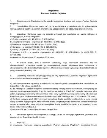 Regulamin Pucharu Sześciu Pagórów 1. Stowarzyszenie Paralotniarzy Cumulus24 organizuje konkurs pod nazwą „Puchar Sześciu Pagórów”. 2. Uczestnikiem Konkursu może być osoba posiadająca uprawnienia do do wykonywania lotów paralotnią zgodnie z polskim prawem oraz ubezpieczenie od odpowiedzialności cywilnej. 3. Uczestnicy Konkursu mają za zadanie wykonać loty paralotnią ze startu nożnego z następujących „Sześciu Pagórów”: a) Chełm – w pobliżu (N 49:36.251, E 020:59.758), b) Jaworzyna Krynicka – w pobliżu (N 49:24.883, E 20:53.802), c) Makowica – w pobliżu (N 49:29.703, E 020:41.754), d) Cergowa – w pobliżu (N 49:32.195, E 021:43.206), e) Działy – w pobliżu (N 49:44.063, E 021:50.656), f) Mszana N i S – w pobliżu odpowiednio (N 49:28.971, E 021:38.663), (N 49:30.827, E: 021:38.915) w okresie od 9 kwietnia do 30 września 2016 roku. 4. W trakcie startu, lotu i lądowań uczestnicy mają obowiązek stosować się do obowiązujących przepisów prawa, w szczególności prawa lotniczego oraz przepisów o ubezpieczeniu od odpowiedzialności cywilnej. Uczestnicy ponoszą wyłączną odpowiedzialność za przygotowanie i przebieg lotu. 5. Uczestnicy Konkursu otrzymują punkty za loty wykonane z „Sześciu Pagórów” zgłoszone na xcportal.pl według następujących zasad: a) za lot przyznawane są punkty w zależności od jego długości z uwzględnieniem mnożników za trójkąt FAI (1.8), trójkąt płaski (1.5), b) dla każdego z „Sześciu Pagórów” zostanie ułożony ranking lotów uczestników, od najwyżej do najniżej punktowanego (według 5.a); do rankingu za każdy z „Pagórów” zostanie zaliczony tylko jeden, najwyżej punktowany lot uczestnika; pilot, który wykonał najwyżej punktowany lot z danego Pagóra otrzyma 20 punktów do klasyfikacji Konkursu; pilot krótszego lotu – 19 punktów i tak dalej, c) Konkurs wygrywa pilot, który otrzymał największą liczbę punktów według 5.b; w razie równej liczby punktów wygrywa pilot, który wykonał starty z większej liczby startowisk; w razie kolejnego remisu wygrywa pilot, który otrzymał największą liczbę punktów za jeden z wykonanych przez siebie lotów lotów według 5.a. c) w Konkursie nie obowiązuje minimalna długość lotu. 6. Pilot może zgłosić lot na xcportal.pl w ciągu 14 dni od dnia jego wykonania, jednakże nie później niż do 3 października 2016 roku. 7. Nagrody: a) zwycięzca Konkursu otrzyma przechodni Puchar „Sześciu Pagórów”; zwycięzca trzech kolejnych edycji Konkursu otrzyma Puchar na własność, b) pośród uczestników Konkursu zostaną rozlosowane nagrody główne oraz inne nagrody; uczestnik Konkursu może otrzymać tylko jedną nagrodę główną, c) w losowaniu wezmą udział bilety uczestników w liczbie odpowiadającej wzorowi: liczba punktów uzyskanych przez uczestnika w klasyfikacji Konkursu / 10; wynik zaokrągla się w górę. 8. Losowanie zostanie przeprowadzone w czasie imprezy na zakończenie sezonu organizowanej przez Stowarzyszenie Paralotniarzy Cumulus24. 7. Każdy uczestnik ma prawo złożyć protest co do zaliczenia albo odmowy zaliczenia poszczególnych do lotów do klasyfikacji w terminie najpóźniej 7 dni od dnia zarejestrowania lub odmowy zarejestrowania lotu na xcportal.pl. Protest powinien zawierać imię i nazwisko uczestnika oraz przyczyny jego złożenia. 8. Piloci, którzy w ramach Konkursu, wykonają loty ze wszystkich Pagórów, zostaną wyróżnieni przez Stowarzyszenie. 9. Wszystkie sprawy sporne związane z przebiegiem Konkursu, w tym rozpatrywanie protestów uczestników, będą rozstrzygane przez Sąd Koleżeński Stowarzyszenia Paralotniarzy Cumulus24. Sąd Koleżeński może oddalić protest, nakazać uwzględnić lot w klasyfikacji, usunąć lot z klasyfikacji, zawiesić uczestnika w prawie do udziału w Konkursie na okres 1 miesiąca oraz zdyskwalifikować uczestnika. Decyzje Sądu Koleżeńskiego w sprawach Konkursu są ostateczne.