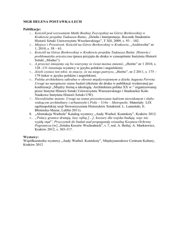 MGR HELENA POSTAWKA-LECH Publikacje: 1. Kościół pod wezwaniem Matki Boskiej Zwycięskiej na Górze Borkowskiej w Krakowie projektu Tadeusza Ruttie, „Dzieła i Interpretacje. Rocznik Studentów Historii Sztuki Uniwersytetu Wrocławskiego”, T XII, 2009, s. 93 – 102. 2. Miejsce i Przestrzeń. Kościół na Górze Borkowskiej w Krakowie, „Archiwolta” nr 1, 2010, s. 58 – 61. 3. Kościół na Górze Borkowskiej w Krakowie projektu Tadeusza Ruttie. Historia i problematyka artystyczna (praca przyjęta do druku w czasopiśmie Instytutu Historii Sztuki „Modus”). 4. A przecież śmiejemy się bo wierzymy że świat można zmienić, „Herito” nr 1 2010, s. 128 -131 (recenzja wystawy w języku polskim i angielskim). 5. Jeżeli czytasz ten tekst, to znaczy, że na niego patrzysz, „Herito”, nr 2 2011, s. 175 – 179 (tekst w języku polskim i angielskim). 6. Polska architektura sakralna w okresie międzywojennym a dzieła Augusta Perreta. Uwagi na marginesie stanu badań (złożone do druku w publikacji wydawanej po konferencji „Między formą a ideologią. Architektura polska XX w.” organizowanej przez Instytut Historii Sztuki Uniwersytetu Warszawskiego i Studenckie Koło Naukowe Instytutu Historii Sztuki UW). 7. Niewidzialne miasto. Uwagi na temat prezentowania ludziom niewidomym i słabo widzącym architektury i urbanistyki ( Polis – Urbs – Metropolis. Materiały LIX ogólnopolskiej sesji Stowarzyszenia Historyków Sztukired. L. Lameński, E. Błotnicka-Mazur, Lublin 2011). 8. „Abstrakcja Warhola” Katalog wystawy „Andy Warhol. Konteksty”, Kraków 2012. 9. „Polacy granice drutują, lasy rąbią […], koszary dla wojska budują, więc nie wyjdą stąd”. Przyczynek do badań nad propagandą wizualną Korpusu Ochrony Pogranicza [w] „Sztuka Kresów Wschodnich”, t. 7, red. A. Betlej, A. Markiewicz, Kraków 2012, s. 303-317. Wystawy: Współkuratorka wystawy „Andy Warhol. Konteksty”, Międzynarodowe Centrum Kultury, Kraków 2012