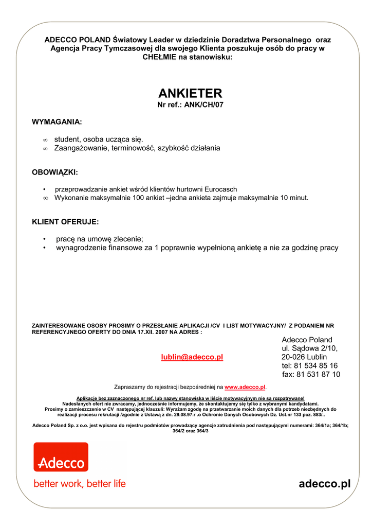 ADECCO POLAND Światowy Leader w dziedzinie Doradztwa Personalnego oraz Agencja Pracy Tymczasowej dla swojego Klienta poszukuje osób do pracy w CHEŁMIE na stanowisku: ANKIETER Nr ref.: ANK/CH/07 WYMAGANIA: • • student, osoba ucząca się. ZaangaŜowanie, terminowość, szybkość działania OBOWIĄZKI: • • przeprowadzanie ankiet wśród klientów hurtowni Eurocasch Wykonanie maksymalnie 100 ankiet –jedna ankieta zajmuje maksymalnie 10 minut. KLIENT OFERUJE: • • pracę na umowę zlecenie; wynagrodzenie finansowe za 1 poprawnie wypełnioną ankietę a nie za godzinę pracy ZAINTERESOWANE OSOBY PROSIMY O PRZESŁANIE APLIKACJI /CV I LIST MOTYWACYJNY/ Z PODANIEM NR REFERENCYJNEGO OFERTY DO DNIA 17.XII. 2007 NA ADRES : [email protected] Adecco Poland ul. Sądowa 2/10, 20-026 Lublin tel: 81 534 85 16 fax: 81 531 87 10 Zapraszamy do rejestracji bezpośredniej na www.adecco.pl. Aplikacje bez zaznaczonego nr ref. lub nazwy stanowiska w liście motywacyjnym nie są rozpatrywane! Nadesłanych ofert nie zwracamy, jednocześnie informujemy, Ŝe skontaktujemy się tylko z wybranymi kandydatami. Prosimy o zamieszczenie w CV następującej klauzuli: WyraŜam zgodę na przetwarzanie moich danych dla potrzeb niezbędnych do realizacji procesu rekrutacji /zgodnie z Ustawą z dn. 29.08.97.r .o Ochronie Danych Osobowych Dz. Ust.nr 133 poz. 883/.. Adecco Poland Sp. z o.o. jest wpisana do rejestru podmiotów prowadzący agencje zatrudnienia pod następującymi numerami: 364/1a; 364/1b; 364/2 oraz 364/3 adecco.pl