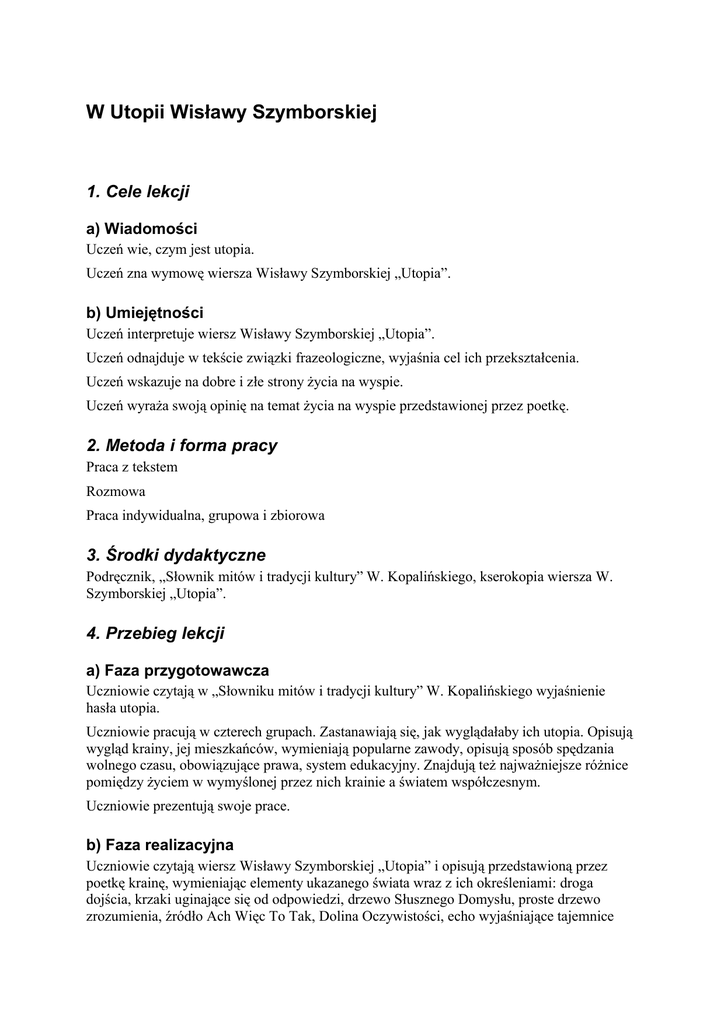 W Utopii Wisławy Szymborskiej 1. Cele lekcji a) Wiadomości Uczeń wie, czym jest utopia. Uczeń zna wymowę wiersza Wisławy Szymborskiej „Utopia”. b) Umiejętności Uczeń interpretuje wiersz Wisławy Szymborskiej „Utopia”. Uczeń odnajduje w tekście związki frazeologiczne, wyjaśnia cel ich przekształcenia. Uczeń wskazuje na dobre i złe strony życia na wyspie. Uczeń wyraża swoją opinię na temat życia na wyspie przedstawionej przez poetkę. 2. Metoda i forma pracy Praca z tekstem Rozmowa Praca indywidualna, grupowa i zbiorowa 3. Środki dydaktyczne Podręcznik, „Słownik mitów i tradycji kultury” W. Kopalińskiego, kserokopia wiersza W. Szymborskiej „Utopia”. 4. Przebieg lekcji a) Faza przygotowawcza Uczniowie czytają w „Słowniku mitów i tradycji kultury” W. Kopalińskiego wyjaśnienie hasła utopia. Uczniowie pracują w czterech grupach. Zastanawiają się, jak wyglądałaby ich utopia. Opisują wygląd krainy, jej mieszkańców, wymieniają popularne zawody, opisują sposób spędzania wolnego czasu, obowiązujące prawa, system edukacyjny. Znajdują też najważniejsze różnice pomiędzy życiem w wymyślonej przez nich krainie a światem współczesnym. Uczniowie prezentują swoje prace. b) Faza realizacyjna Uczniowie czytają wiersz Wisławy Szymborskiej „Utopia” i opisują przedstawioną przez poetkę krainę, wymieniając elementy ukazanego świata wraz z ich określeniami: droga dojścia, krzaki uginające się od odpowiedzi, drzewo Słusznego Domysłu, proste drzewo zrozumienia, źródło Ach Więc To Tak, Dolina Oczywistości, echo wyjaśniające tajemnice świata, jaskinia w której leży sens, jezioro głębokiego przekonania, góra Pewność Niewzruszona. Uczniowie zastanawiają się nad poszczególnymi nazwami elementów rzeczywistości, wyjaśniają, dlaczego poetka tak je nazwała. Uczniowie poszukują w tekście utworu wyrażeń z języka potocznego, związków frazeologicznych, jeśli zostały zmienione, wyjaśniają sens tej zmiany, podając znaczenie podstawowe i nadane przez poetkę – uzupełniają tabelę. Związek podstawowy Stąpać po niepewnym gruncie sens Znajdować się w sytuacji zagrożenia, być niepewnym swoich dalszych losów, ryzykować Związek przekształcony Stanąć na gruncie dowodów sens Być pewnym swoich racji, czuć się bezpiecznie, nie mieć wątpliwości Im dalej w las, tym więcej drzew Im dalej w las tym szerzej się otwiera Dolina Oczywistości. Prawda wypływa na Oliwa na wierzch wierzch wypływa Uczniowie wskazują na zmiany i zastanawiają się, w jakim celu poetka zmieniła związki frazeologiczne. Uczniowie wymieniają korzyści z mieszkania na tej wyspie, np. pewność odpowiedzi na wszystkie pytania, brak wątpliwości, znajomość prawdy. Uczniowie odpowiadają, dlaczego wyspa jest bezludna i czy zawsze była pozbawiona mieszkańców, próbują odpowiedzieć, dlaczego ludzie nie chcą mieszkać na wyspie. Uczniowie zastanawiają się nad znaczeniem końcowych słów utworu: „Jak gdyby tylko odchodzono stąd i bezpowrotnie zanurzano się w topieli. W życiu nie do pojęcia.” Nauczyciel dzieli tablicę na pół. Jedną połowę tytułuje: topiel – życie nie do pojęcia, drugą: wyspa, na której wszystko się wyjaśnia. Uczniowie dopisują określenia, które kojarzą im się z tymi wyrażeniami, odwołują się do treści wiersza. c) Faza podsumowująca Uczniowie wyjaśniają, na czym polega utopijność w wierszu Wisławy Szymborskiej, odpowiadając, czy pewność, znajomość prawdy daje człowiekowi szczęście. Uczniowie pracują w parach; wskazują zalety i wady życia na wyspie opisanej przez Szymborską. Uczniowie prezentują swoje prace. Każdy uczeń odpowiada, czy chciałby żyć na takiej wyspie, jaką przedstawiła poetka. 5. Bibliografia M. Nagajowa, Świat w słowach i obrazach. Podręcznik do kształcenia literackiego i kulturowego dla klasy pierwszej gimnazjum, Wydawnictwa Szkolne i Pedagogiczne, Warszawa 1999. 6. Załączniki brak a) Karta pracy ucznia brak b) Zadanie domowe Opisz miejsce o nazwie Utopia. 7. Czas trwania lekcji 45 minut 8. Uwagi do scenariusza brak