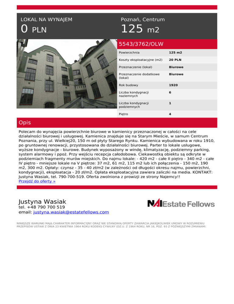 LOKAL NA WYNAJEM Poznań, Centrum 0 125 PLN m2 5543/3762/OLW Powierzchnia 125 m2 Koszty eksploatacyjne (m2) 20 PLN Przeznaczenie (lokal) Biurowe Przeznaczenie dodatkowe (lokal) Biurowe Rok budowy 1920 Liczba kondygnacji naziemnych 6 Liczba kondygnacji podziemnych 1 Piętro 4 Opis Polecam do wynajęcia powierzchnie biurowe w kamienicy przeznaczonej w całości na cele działalności biurowej i usługowej. Kamienica znajduje się na Starym Mieście, w samum Centrum Poznania, przy ul. Wielkiej20, 150 m od płyty Starego Rynku. Kamienica wybudowana w roku 1910, po gruntownej renowacji, przystosowana do działalności biurowej. Parter to lokale usługowe, wyższe kondygnacje - biurowe. Budynek wyposażony w windę, klimatyzację, podziemny parking, system alarmowy i ppoż. Przy wejściu recepcja całodobowa. Ciekawostką obiektu są odkryte w podziemiach fragmenty murów miejskich. Do najmu lokale: - 420 m2 - całe II piętro - 340 m2 - całe IV piętro - mniejsze lokale na V piętrze: 37 m2, 61 m2, 115 m2 lub ich połączenia - 150 m2, 190 m2, 300 m2. Opłaty: czynsz - 35 - 40 zł/m2 (w zależności od długości okresu najmu, powierzchni, kondygnacji), eksploatacja - 20 zł/m2. Opłata eksploatacyjna zawiera zaliczki na media. KONTAKT: Justyna Wasiak, tel. 790-700-519. Oferta zwolniona z prowizji ze strony Najemcy!! Przejdź do oferty » Justyna Wasiak tel. +48 790 700 519 email: [email protected] NINIEJSZE WARUNKI MAJĄ CHARAKTER INFORMACYJNY ORAZ NIE STANOWIĄ OFERTY ZAWARCIA JAKIEJKOLWIEK UMOWY W ROZUMIENIU PRZEPISÓW USTAW Z DNIA 23 KWIETNIA 1964 ROKU KODEKS CYWILNY (DZ.U. Z 1964 ROKU, NR 16, POZ. 93 Z PÓŹNIEJSZYMI ZMIANAMI. Powered by TCPDF (www.tcpdf.org)