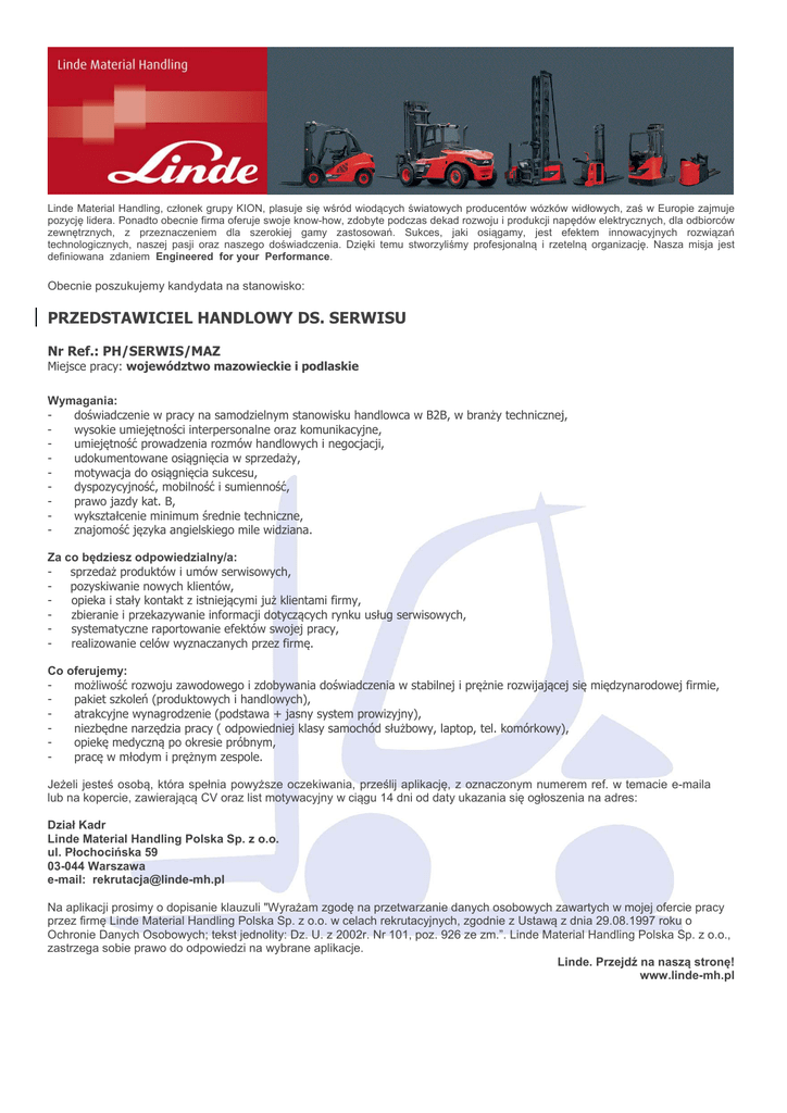 Linde Material Handling, członek grupy KION, plasuje się wśród wiodących światowych producentów wózków widłowych, zaś w Europie zajmuje pozycję lidera. Ponadto obecnie firma oferuje swoje know-how, zdobyte podczas dekad rozwoju i produkcji napędów elektrycznych, dla odbiorców zewnętrznych, z przeznaczeniem dla szerokiej gamy zastosowań. Sukces, jaki osiągamy, jest efektem innowacyjnych rozwiązań technologicznych, naszej pasji oraz naszego doświadczenia. Dzięki temu stworzyliśmy profesjonalną i rzetelną organizację. Nasza misja jest definiowana zdaniem Engineered for your Performance. Obecnie poszukujemy kandydata na stanowisko: PRZEDSTAWICIEL HANDLOWY DS. SERWISU Nr Ref.: PH/SERWIS/MAZ Miejsce pracy: województwo mazowieckie i podlaskie Wymagania: doświadczenie w pracy na samodzielnym stanowisku handlowca w B2B, w branży technicznej, wysokie umiejętności interpersonalne oraz komunikacyjne, umiejętność prowadzenia rozmów handlowych i negocjacji, udokumentowane osiągnięcia w sprzedaży, motywacja do osiągnięcia sukcesu, dyspozycyjność, mobilność i sumienność, prawo jazdy kat. B, wykształcenie minimum średnie techniczne, znajomość języka angielskiego mile widziana. Za co będziesz odpowiedzialny/a: sprzedaż produktów i umów serwisowych, pozyskiwanie nowych klientów, opieka i stały kontakt z istniejącymi już klientami firmy, zbieranie i przekazywanie informacji dotyczących rynku usług serwisowych, systematyczne raportowanie efektów swojej pracy, realizowanie celów wyznaczanych przez firmę. Co oferujemy: możliwość rozwoju zawodowego i zdobywania doświadczenia w stabilnej i prężnie rozwijającej się międzynarodowej firmie, pakiet szkoleń (produktowych i handlowych), atrakcyjne wynagrodzenie (podstawa + jasny system prowizyjny), niezbędne narzędzia pracy ( odpowiedniej klasy samochód służbowy, laptop, tel. komórkowy), opiekę medyczną po okresie próbnym, pracę w młodym i prężnym zespole. Jeżeli jesteś osobą, która spełnia powyższe oczekiwania, prześlij aplikację, z oznaczonym numerem ref. w temacie e-maila lub na kopercie, zawierającą CV oraz list motywacyjny w ciągu 14 dni od daty ukazania się ogłoszenia na adres: Dział Kadr Linde Material Handling Polska Sp. z o.o. ul. Płochocińska 59 03-044 Warszawa e-mail: [email protected] Na aplikacji prosimy o dopisanie klauzuli "Wyrażam zgodę na przetwarzanie danych osobowych zawartych w mojej ofercie pracy przez firmę Linde Material Handling Polska Sp. z o.o. w celach rekrutacyjnych, zgodnie z Ustawą z dnia 29.08.1997 roku o Ochronie Danych Osobowych; tekst jednolity: Dz. U. z 2002r. Nr 101, poz. 926 ze zm.”. Linde Material Handling Polska Sp. z o.o., zastrzega sobie prawo do odpowiedzi na wybrane aplikacje. Linde. Przejdź na naszą stronę! www.linde-mh.pl