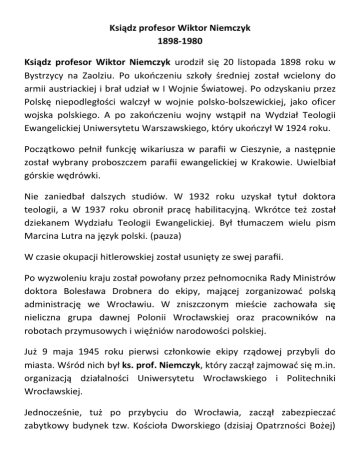 Ksiądz profesor Wiktor Niemczyk 1898-1980 Ksiądz profesor Wiktor Niemczyk urodził się 20 listopada 1898 roku w Bystrzycy na Zaolziu. Po ukooczeniu szkoły średniej został wcielony do armii austriackiej i brał udział w I Wojnie Światowej. Po odzyskaniu przez Polskę niepodległości walczył w wojnie polsko-bolszewickiej, jako oficer wojska polskiego. A po zakooczeniu wojny wstąpił na Wydział Teologii Ewangelickiej Uniwersytetu Warszawskiego, który ukooczył W 1924 roku. Początkowo pełnił funkcję wikariusza w parafii w Cieszynie, a następnie został wybrany proboszczem parafii ewangelickiej w Krakowie. Uwielbiał górskie wędrówki. Nie zaniedbał dalszych studiów. W 1932 roku uzyskał tytuł doktora teologii, a W 1937 roku obronił pracę habilitacyjną. Wkrótce też został dziekanem Wydziału Teologii Ewangelickiej. Był tłumaczem wielu pism Marcina Lutra na język polski. (pauza) W czasie okupacji hitlerowskiej został usunięty ze swej parafii. Po wyzwoleniu kraju został powołany przez pełnomocnika Rady Ministrów doktora Bolesława Drobnera do ekipy, mającej zorganizowad polską administrację we Wrocławiu. W zniszczonym mieście zachowała się nieliczna grupa dawnej Polonii Wrocławskiej oraz pracowników na robotach przymusowych i więźniów narodowości polskiej. Już 9 maja 1945 roku pierwsi członkowie ekipy rządowej przybyli do miasta. Wśród nich był ks. prof. Niemczyk, który zaczął zajmowad się m.in. organizacją działalności Uniwersytetu Wrocławskiego i Politechniki Wrocławskiej. Jednocześnie, tuż po przybyciu do Wrocławia, zaczął zabezpieczad zabytkowy budynek tzw. Kościoła Dworskiego (dzisiaj Opatrzności Bożej) przy ulicy Kazimierza Wielkiego 29. Przejął też dwa budynki mieszkalne obok kościoła. Szybko zabezpieczył także kontynuowanie nabożeostw ewangelickich w kościele świętej Elżbiety (dziś Bazylika św. Elżbiety) oraz w kościele Marii Magdaleny (dziś kościół polsko-katolicki), gdzie istniały jeszcze dwie duże parafie niemieckie. W tym czasie otrzymał pełnomocnictwo Konsystorza Kościoła Ewangelicko-Augsburskiego w Polsce oficjalnie upoważniające go do organizowania życia kościelnego we Wrocławiu i na Dolnym Śląsku. 5 sierpnia 1945 roku w Kościele Dworskim poprowadził pierwsze polskie nabożeostwo we Wrocławiu po przeszło stuletniej przerwie. Wcześniej, do kooca XVIII wieku, nabożeostwa w języku polskim odbywały się jedynie w kościółku św. Wojciecha przy tej samej ulicy. Niestety zostały zakooczone germanizacyjną polityką władz pruskich. Po pierwszym powojennym nabożeostwie zwołano Zgromadzenie Parafialne, które jednomyślnie podjęło uchwałę o powołaniu polskiej Parafii Ewangelickiej i wybrało Radę Parafialną. Pierwsze nabożeostwo połączone z sakramentem Komunii Świętej odbyło się 4 listopada 1945r., a pierwsza powojenna konfirmacja młodzieży 23 czerwca 1946 roku w Kościele Elżbiety. Rok później – 30 listopada 1947 roku odbyło się uroczyste nabożeostwo inauguracyjne połączone z poświęceniem i przemianowaniem dawnego Kościoła Dworskiego na Kościół Opatrzności Bożej. Po zorganizowaniu życia tej pierwszej polskiej parafii ewangelickiej na Dolnym Śląsku, ksiądz dr Wiktor Niemczyk zajął się organizacją studiów teologii ewangelickiej na Uniwersytecie Warszawskim. W 1946 roku uzyskał tytuł profesorski, a na początku lat pięddziesiątych ubiegłego wieku zorganizował od podstaw Chrześcijaoską Akademię Teologiczną ekumeniczną uczelnię wyższą, otwartą dla studentów z kościołów protestanckich, prawosławnych i tradycji starokatolickiej. W latach 19541964 pełnił funkcję rektora tej uczelni. W latach siedemdziesiątych został uhonorowany tytułem doktora honoris causa Chrześcijaoskiej Akademii Teologicznej w Warszawie. Był także przewodniczącym komisji przekładu Pisma Świętego, która w 1975 roku wydała nowy przekład Biblii, tzw. Biblię Warszawską. Jest to do dziś najpopularniejszy protestancki przekład Pisma Świętego w Polsce. Brał aktywny udział w pracach Polskiej Rady Ekumenicznej i w wielu konferencjach teologicznych w kraju i zagranicą. Mimo wielu pełnionych funkcji i obowiązków, zawsze na pierwszym miejscu stawiał swoją rodzinę. (pauza) Zmarł 18 listopada 1980 roku w Warszawie.