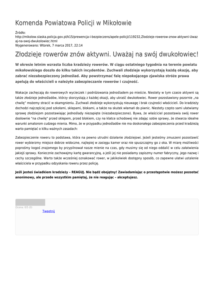 Komenda Powiatowa Policji w Mikołowie Źródło: http://mikolow.slaska.policja.gov.pl/k15/prewencja-i-bezpieczens/apele-policji/119232,Zlodzieje-rowerow-znow-aktywni-Uwaz aj-na-swoj-dwukolowiec.html Wygenerowano: Wtorek, 7 marca 2017, 22:14 Złodzieje rowerów znów aktywni. Uważaj na swój dwukołowiec! W okresie letnim wzrasta liczba kradzieży rowerów. W ciągu ostatniego tygodnia na terenie powiatu mikołowskiego doszło do kilku takich incydentów. Zuchwali złodzieje wykorzystają każdą okazję, aby zabrać niezabezpieczony jednoślad. Aby powstrzymać falę niepokojącego zjawiska stróże prawa apelują do właścicieli o należyte zabezpieczanie rowerów i czujność. Wakacje zachęcają do rowerowych wycieczek i podróżowania jednośladem po mieście. Niestety w tym czasie aktywni są także złodzieje jednośladów, którzy skorzystają z każdej okazji, aby ukraść dwukołowiec. Rower pozostawiony pozornie „na chwilę” możemy stracić w okamgnieniu. Zuchwali złodzieje wykorzystują nieuwagę i brak czujności właścicieli. Do kradzieży dochodzi najczęściej pod szkołami, sklepami, blokami, a także na skutek włamań do piwnic. Niestety często sami ułatwiamy sprawę złodziejom pozostawiając jednoślady niezapięte (niezabezpieczone). Bywa, że właściciel pozostawia swój rower dosłownie "na chwilę" przed sklepem, przed blokiem, czy na klatce schodowej nie zdając sobie sprawy, że stwarza idealne warunki amatorom cudzego mienia. Mimo, że w przypadku jednośladów nie ma doskonałego zabezpieczenia przed kradzieżą warto pamiętać o kilku ważnych zasadach: Zabezpieczenie roweru to podstawa, która na pewno utrudni działanie złodziejowi. Jeżeli jesteśmy zmuszeni pozostawić rower wybierzmy miejsce dobrze widoczne, najlepiej w zasięgu kamer oraz nie spuszczajmy go z oka. W miarę możliwości poprośmy kogoś znajomego by przypilnował nasze mienie na czas, gdy musimy się od niego oddalić w celu załatwienia jakiejś sprawy. Koniecznie zachowajmy kartę gwarancyjną, a jeśli jej nie posiadamy zapiszmy numer fabryczny, jego nazwę i cechy szczególne. Warto także wcześniej oznakować rower, w jakikolwiek dostępny sposób, co zapewne ułatwi ustalenie właściciela w przypadku odzyskania roweru przez policję. Jeśli jesteś świadkiem kradzieży – REAGUJ. Nie bądź obojętny! Zawiadamiając o przestępstwie możesz pozostać anonimowy, ale przede wszystkim pamiętaj, że nie reagując – akceptujesz. Ocena: 0/5 (0) Tweetnij