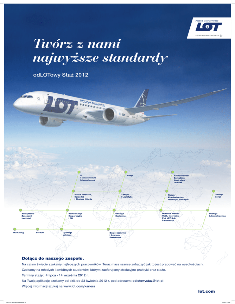 Twórz z nami najwyższe standardy odLOTowy Staż 2012 IT i Infrastruktura Informatyczna Siatka Połączeń, Sprzedaż i Obsługa Klienta Komunikacja Korporacyjna i PR Zarządzanie Zasobami Ludzkimi Marketing Produkt Operacje Lotnicze Audyt Rachunkowość Zarządcza, Kontroling i Finans Zakupy i Logistyka Obsługa Naziemna Obsługa Cargo Nadzór Eksploatacyjny Operacji Lotniczych Ochrona Prawna Osób, Interesów PLL LOT S.A. i Informacji Obsługa Administracyjna Bezpieczeństwo i Ochrona Przewozów Dołącz do naszego zespołu. Na całym świecie szukamy najlepszych pracowników. Teraz masz szanse zobaczyć jak to jest pracować na wysokościach. Czekamy na młodych i ambitnych studentów, którym zaoferujemy atrakcyjne praktyki oraz staże. Terminy staży: 4 lipca - 14 września 2012 r. Na Twoją aplikację czekamy od dziś do 23 kwietnia 2012 r. pod adresem: [email protected] Więcej informacji szukaj na www.lot.com/kariera 312737-Pl-TargiPracy-420x594.indd 1 lot.com 12-03-12 16:00
