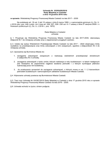 Uchwała Nr XXXII/420/2016 Rady Miejskiej w Czeladzi z dnia 19 grudnia 2016 roku w sprawie: Wieloletniej Prognozy Finansowej Miasta Czeladź na lata 2017 – 2030 Na podstawie art. 18 ust. 2 pkt 15 ustawy z dnia 8 marca 1990 r. o samorządzie gminnym (t.j. Dz. U. z 2016 roku, poz. 446 z późn. zm.) oraz art. 226, 227, 228 i 230 ust. 6 i 7 ustawy z dnia 27 sierpnia 2009 r. o finansach publicznych (t.j. Dz. U. z 2016 r., poz. 1870) Rada Miejska w Czeladzi uchwala: § 1. Przyjmuje się Wieloletnią Prognozę Finansową Miasta Czeladź na lata 2017-2030, stanowiącą Załącznik Nr 1 do niniejszej uchwały wraz z objaśnieniami przyjętych wartości. § 2. Ustala się wykaz Wieloletnich Przedsięwzięć Miasta Czeladź na lata 2017 – 2022 obejmujący limity wydatków na przedsięwzięcia oraz limity zobowiązań z nimi związanych, zgodnie z Załącznikiem Nr 2 do niniejszej uchwały. § 3. Upoważnia się Burmistrza Miasta do: 1. zaciągania zobowiązań związanych w załączniku Nr 2 uchwały, z realizacją wieloletnich przedsięwzięć określonych 2. zaciągania zobowiązań z tytułu umów, których realizacja w roku budżetowym i w latach następnych jest niezbędna do zapewnienia ciągłości działania jednostki i z których wynikające płatności wykraczają poza rok budżetowy, 3. do przekazania uprawnień do zaciągania zobowiązań, o których mowa w ust. 1 i 2 kierownikom jednostek budżetowych i samorządowych zakładów budżetowych Miasta Czeladź. § 4. Wykonanie uchwały powierza się Burmistrzowi Miasta Czeladź. § 5. Traci moc Uchwała Nr XX/267/2015 Rady Miejskiej w Czeladzi z dnia 17 grudnia 2015 roku w sprawie Wieloletniej Prognozy Finansowej Miasta Czeladź na lata 2016 – 2030. § 6. Uchwała wchodzi w życie z dniem podjęcia. OBJAŚNIENIA WARTOŚCI PRZYJĘTYCH DO WIELOLETNIEJ PROGNOZY FINANSOWEJ MIASTA CZELADŹ NA LATA 2017-2030 Wieloletnia prognoza finansowa została opracowana w oparciu o art. 226-232 ustawy o finansach publicznych oraz rozporządzenie Ministra Finansów z dnia 10 stycznia 2013 r. w sprawie wieloletniej prognozy finansowej: - Prognoza finansowa obejmuje okres roku 2017 oraz kolejnych trzech lat. - Prognoza kwoty długu, stanowiąca część wieloletniej prognozy finansowej sporządzona jest do 2030 roku, tj. do roku na który zaciągnięto bądź planuje się zaciągnąć zobowiązania (od roku 2020 prognoza finansowa uzupełniona jest jedynie w pozycjach niezbędnych do wyliczenia kwoty długu). - Limity wydatków na przedsięwzięcia określono do 2022. Wieloletnia prognoza finansowa została sporządzona zgodnie z wymogami prawnymi w szczegółowości określonej wzorem ustalonym przez Ministra Finansów w rozporządzeniu z dnia 10 stycznia 2013 r. Wieloletnia Prognoza Finansowa przekazywana jest Regionalnej Izbie Obrachunkowej w wersji elektronicznej, podpisanej kwalifikowanym podpisem elektronicznym, za pośrednictwem wskazanego przez Ministra Finansów oprogramowania. Przystępując do sporządzenia Wieloletniej Prognozy Finansowej przeanalizowano realizację wielkości budżetowych lat poprzednich. Dochody i wydatki Długoterminowa prognoza dochodów powstała w wyniku analizy wielkości dochodów uzyskanych z poszczególnych źródeł w latach poprzednich, dochodach planowanych na 2016 rok i poziomie ich realizacji, możliwości pozyskania dofinansowania lub sfinansowania zadań ze środków unijnych. W prognozie uwzględniono dochody z podatków, opłat, subwencji, dotacji w wielkościach realnych do uzyskania oraz środki pochodzące z Unii Europejskiej i środki z innych źródeł w kwotach wynikających z możliwości pozyskania dofinansowania w okresie programowania 2014-2020 w ramach Zintegrowanych Inwestycji Terytorialnych. Dane dotyczące kwot dochodów i wydatków bieżących w zakresie roku 2017 są zgodne z projektem budżetu na 2017 rok i w zakresie części dochodów wynikają z zawiadomień przekazanych przez Ministra Finansów i Wojewodę Śląskiego. Natomiast konstruując wielkości dotyczące kolejnych lat przyjęto zasadę, iż dochody bieżące oraz wydatki bieżące w stosunku do roku poprzedniego w przybliżeniu wzrastają od 1%-3,5% (zaokrąglając do pełnych tysięcy złotych): - kolumna 1.1.1 dochody z tytułu udziału w podatku dochodowym od osób fizycznych – prognozowane przez Ministerstwo Finansów na 2017 rok) w kolejnych latach wzrastają o ok. 3,5% w stosunku do roku poprzedniego, - kolumna 1.1.2 dochody z tytułu udziału w podatku dochodowym od osób prawnych wzrasta o 100.000 zł w stosunku do roku poprzedniego, - kolumna 1.1.3 podatki i opłaty wzrastają o ok. 3,5% w stosunku do roku poprzedniego, z tego wpływy z podatku od nieruchomości (kol. 1.1.3.1) również wzrastają o ok. 3,5%, - kolumna 1.1.4 subwencje ogólne – założono wzrost planowanej na 2017 rok przez Ministra Finansów kwoty rokrocznie o ok.3%. Kwota wydatków bieżących na lata 2017 i kolejne (kolumna 2.1) zostały zaplanowane z uwzględnieniem konieczności zapewnienia środków na funkcjonowanie Miasta oraz zapewnienia spełnienia wskaźnika spłaty zobowiązań. W ramach wydatków bieżących zaplanowano kwoty wydatków niezbędne do zabezpieczenia w budżetach do roku 2019 na ewentualną spłatę udzielonego za zobowiązania ZIK sp. z o.o. poręczenia (kolumna 2.1.1). Ponadto w budżecie roku 2017 oraz kolejnych lat zabezpieczono środki na obsługę długu, a w tym na odsetki – wyliczenia oparto na oprocentowaniu wynikającym z zawartych umów – wskaźnik WIBOR oraz marża banku (kolumna 2.1.3.1) z tym, że dla roku 2017 zabezpieczono środki na prowizje od planowanych do zaciągnięcia kredytów oraz emisji obligacji (kolumna 2.1.3). Wieloletnia Prognoza Finansowa zakłada nadwyżkę dochodów bieżących w stosunku do wydatków bieżących, celem zapewnienia środków na spłatę wcześniej zaciągniętych zobowiązań a także zapewniając relację zrównoważenia o której mowa w art. 242 ustawy o finansach 