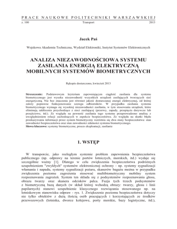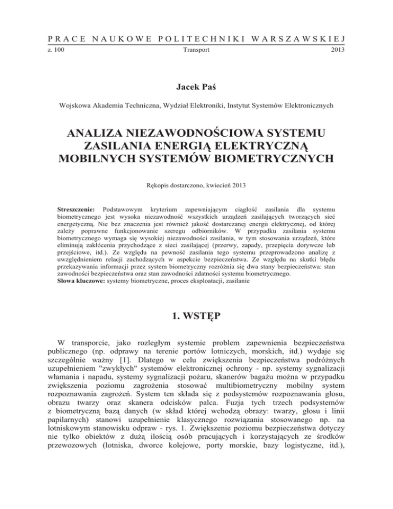PRACE NAUKOWE POLITECHNIKI WARSZAWSKIEJ z. 100 Transport 2013 Jacek Pa" Wojskowa Akademia Techniczna, Wydzia8 Elektroniki, Instytut Systemów Elektronicznych ANALIZA NIEZAWODNO$CIOWA SYSTEMU ZASILANIA ENERGI' ELEKTRYCZN' MOBILNYCH SYSTEMÓW BIOMETRYCZNYCH R<kopis dostarczono, kwiecie= 2013 Streszczenie: Podstawowym kryterium zapewniaj>cym ci>g8o@B zasilania dla systemu biometrycznego jest wysoka niezawodno@B wszystkich urz>dze= zasilaj>cych tworz>cych sieB energetyczn>. Nie bez znaczenia jest równieF jako@B dostarczanej energii elektrycznej, od której zaleFy poprawne funkcjonowanie szeregu odbiorników. W przypadku zasilania systemu biometrycznego wymaga si< wysokiej niezawodno@ci zasilania, w tym stosowania urz>dze=, które eliminuj> zak8ócenia przychodz>ce z sieci zasilaj>cej (przerwy, zapady, przepi<cia dorywcze lub przej@ciowe, itd.). Ze wzgl<du na pewno@B zasilania tego systemu przeprowadzono analiz< z uwzgl<dnieniem relacji zachodz>cych w aspekcie bezpiecze=stwa. Ze wzgl<du na skutki b8<du przekazywania informacji przez system biometryczny rozróFnia si< dwa stany bezpiecze=stwa: stan zawodno@ci bezpiecze=stwa oraz stan zawodno@ci zdatno@ci systemu biometrycznego. S+owa kluczowe: systemy biometryczne, proces eksploatacji, zasilanie 1. WST.P W transporcie, jako rozleg8ym systemie problem zapewnienia bezpiecze=stwa publicznego (np. odprawy na terenie portów lotniczych, morskich, itd.) wydaje si< szczególnie waFny [1]. Dlatego w celu zwi<kszenia bezpiecze=stwa podróFnych uzupe8nieniem "zwyk8ych" systemów elektronicznej ochrony - np. systemy sygnalizacji w8amania i napadu, systemy sygnalizacji poFaru, skanerów bagaFu moFna w przypadku zwi<kszenia poziomu zagroFenia stosowaB multibiometryczny mobilny system rozpoznawania zagroFe=. System ten sk8ada si< z podsystemów rozpoznawania g8osu, obrazu twarzy oraz skanera odcisków palca. Fuzja tych trzech podsystemów z biometryczn> baz> danych (w sk8ad której wchodz> obrazy: twarzy, g8osu i linii papilarnych) stanowi uzupe8nienie klasycznego rozwi>zania stosowanego np. na lotniskowym stanowisku odpraw - rys. 1. Zwi<kszenie poziomu bezpiecze=stwa dotyczy nie tylko obiektów z duF> ilo@ci> osób pracuj>cych i korzystaj>cych ze @rodków przewozowych (lotniska, dworce kolejowe, porty morskie, bazy logistyczne, itd.), 154 Jacek Pa@ ale waFne jest takFe podczas monitorowania sk8adów @rodków transportowych (bezpiecze=stwo publiczne pasaFerów podczas jazdy), bezpiecze=stwo 8adunków oraz newralgicznych budowli transportowych (np. lotniska, bazy paliw, stacje transformatorowe i rozdzielcze niskich, @rednich i wysokich napi<B, itp.), jako 8atwych obiektów ataków terrorystycznych mog>cych zdezorganizowaB funkcjonowanie transportu, a co za tym idzie i gospodarki pa=stwa na duFym obszarze [1,3]. System multibiometryczny w powi>zaniu z innymi systemami: np. ochrony elektronicznej, transmisji danych, 8>czno@ci przewodowej i bezprzewodowej to telematyka transportu - rys. 1. Telematyka transportu jest to dzia8 wiedzy o transporcie integruj>cy informatyk< i telekomunikacj< w zastosowaniach dla potrzeb zarz>dzania i sterowania ruchem w systemach transportowych, stymuluj>cy dzia8alno@B techniczno - organizacyjn> umoFliwiaj>c> podniesienie efektywno@ci i bezpiecze=stwa eksploatacji tych systemów" [2]. Rozwi>zania telematyki transportu w szerokim zakresie wykorzystywane s> do realizacji us8ug zwi>zanych z zapewnieniem bezpiecze=stwa transportu, a takFe bezpiecze=stwa publicznego w szeroko rozumianych systemach i obiektach transportowych [1, 3]. Rys. 1. Schemat zasilania systemu biometrycznego - lotniskowe stanowisko odpraw, gdzie: p1,p2 – biometryka odcisku palca; m1,m2 – biometryka g8osu; k1,k2 – biometryka rozpoznawania twarzy; R1 – skaner bagaFu, B1,B2 – akumulatory wewn<trzne podtrzymuj>ce prac< mikroprocesorów; UPS – zasilacz bezprzerwowy systemu; C – agregat pr>dotwórczy; L1,L2 – linie elektroenergetyczne zasilaj>ce rozleg8y obszar lotniskowy z poszczególnych elektrowni G1,G2 (opracowanie w8asne) Analiza niezawodno@ciowa systemu zasilania energi> elektryczn> mobilnych … 155 Dzia8anie wszystkich systemów telematycznych, które s> zlokalizowane np. w portach lotniczych wymaga niezawodnego zasilania energi> elektryczn> o odpowiednich parametrach, które s> dok8adnie okre@lone np. w normach [12]. Podstawowym kryterium zapewniaj>cym ci>g8o@B zasilania dla mobilnego systemu biometrycznego jest wysoka niezawodno@B wszystkich urz>dze= zasilaj>cych tworz>cych sieB energetyczn>. Nie bez znaczenia jest równieF jako@B dostarczanej energii elektrycznej, od której zaleFy poprawne funkcjonowanie szeregu odbiorników. Parametry jako@ciowe energii elektrycznej – zasilaj>cej odbiorniki elektryczne, w tym system biometryczny zosta8y okre@lone w odpowiednich normach – np. PN-EN 50160 lub rozporz>dzeniach Dz. U. nr 93/2007 [1]. Normy i rozporz>dzenia @ci@le okre@laj> parametry energii elektrycznej, jednak brak jest przepisów wykonawczych, które stanowi8yby podstaw< egzekwowania od odbiorców filtrowania wprowadzanych do sieci zak8óce=. Powoduje to, Fe parametry dostarczanej energii odbiegaj> od wymaga= formalnych. Dla urz>dze= tworz>cych system biometryczny najbardziej niebezpieczne s> krótkie przerwy w zasilaniu oraz ich szczególne przypadki okre@lone, jako zapady napi<cia. W przypadku zasilania systemu biometrycznego wymaga si< wysokiej niezawodno@ci zasilania, w tym stosowania urz>dze=, które eliminuj> zak8ócenia przychodz>ce z sieci zasilaj>cej (przerwy, zapady, cz<stotliwo@ci harmoniczne napi<cia sieci, przepi<cia dorywcze lub przej@ciowe, itd.). Badania w sektorze IT prowadzone w Wielkiej Brytanii przez National Computing Center szacowa8y @rednie straty wynikaj>ce z awarii elektrycznych jako wyFsze niF spowodowane wy8adowaniami atmosferycznymi lub kradzieFami [4]. W systemach biometrycznych bazy danych biometrycznych przechowywane s> na serwerach. jcieFki dost<pu w serwerach wi<kszo@ci systemów sieciowych (w tym takFe dla 
