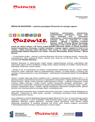 informacja prasowa 27 maja 2014 r. MEDIALNE MAZOWSZE – czyli jak przyciągnąć filmowców do naszego regionu Krajobrazy zachwycające naturalnością, postindustrialne przestrzenie, miasta małe i duże, tradycyjne wsie i nowoczesne miejscowości – zróżnicowanie Mazowsza to jego potencjał. Warto by dostrzegła to branża medialna – głównie z zagranicy. Fundacja Edukacji i Sztuki Filmowej Macieja Ślesickiego i Bogusława Lindy Laterna Magica przy udziale prawie pół miliona złotych z UE tworzy projekt Medialne Mazowsze. Będzie on przede wszystkim skupiał kompleksową informację o branży medialnej z naszego regionu, wspierał te firmy w ich rozwoju, a także promował walory Mazowsza. Dziś umowę na unijne dofinansowanie podpisali wicemarszałek Wiesław Raboszuk oraz reżyser i kanclerz Warszawskiej Szkoły Filmowej – Maciej Ślesicki. – To niecodzienny projekt – związany z promocją Mazowsza, ale trochę w nietypowy sposób – poprzez film, przedsiębiorców, którzy zajmują się filmem i poprzez ludzi, którzy już coś dla filmu zrobili – powiedział wicemarszałek Wiesław Raboszuk. Medialne Mazowsze to niekomercyjny projekt służący międzynarodowej promocji województwa jako atrakcyjnego regionu dla firm medialnych z całego świata, miejsca otwartego na kontakty z branżą filmową, telewizyjną, reklamową i nowych mediów. – Wydaje mi się, że województwo ma ciekawą i niewykorzystaną infrastrukturę, taką jak – dworki, obiekty historyczne, zamki, restauracje. Warto to usystematyzować i pokazać. To projekt otwarty na młodych ludzi i otwarty na kulturę połączoną z nowy technologiami – dodał kanclerz Warszawskiej Szkoły Filmowej Maciej Ślesicki. Jednym z działań będą targi branży medialnej wraz z imprezami towarzyszącymi (listopad 2014 r.). To pierwsza impreza wystawiennicza tej branży w województwie mazowieckim. Organizowane w Warszawskiej Szkole Filmowej – jednej z trzech wyższych uczelni filmowych w Polsce – a jedynej na Mazowszu, skupią w jednym miejscu start-upy z branży nowych mediów, producentów filmowych, telewizyjnych i gier komputerowych, producentów i dystrybutorów sprzętu audiowizualnego, firmy świadczące usługi z zakresu produkcji i postprodukcji obrazu i dźwięku, agencje interaktywne, producentów oprogramowania, agencje aktorskie oraz instytucje publiczne promujące region i przedsiębiorczość. Targi mają służyć prezentacji usług i produktów oferowanych przez firmy z branży medialnej działających na Mazowszu. Towarzyszyć im będą panele, warsztaty i prezentacje prowadzone przez przedstawicieli instytucji publicznych i biznesu. Innym działaniem w ramach Medialnego Mazowsza będzie Mazovian Film Tour, w ramach którego sześciu reżyserów i operatorów z trzech europejskich szkół filmowych spędzi razem dwa tygodnie, objeżdżając najbardziej atrakcyjne miejsca Mazowsza, i zrealizuje krótkie reportażowe formy filmowe według założonego scenariusza. W rezultacie powstanie cykl filmów, które zostaną następnie zmontowane w Warszawskiej Szkole Filmowej i zaprezentowane w ramach targów. Poza tym Medialne Mazowsze to dwujęzyczny serwis internetowy zawierający: spis mazowieckich firm z branży medialnej, wykaz atrakcyjnych miejsc i najciekawszych turystycznych obiektów – w formie interaktywnej mapy, oraz przewodnik po Mazowszu w wersji elektronicznej. Powstanie również mobilna aplikacja (na platformy Android i OS). Na potrzeby zagranicznych klientów powstanie również drukowany katalog w języku angielskim z informacją o Mazowszu. Będzie on dystrybuowany dzięki współpracy z Polskim Instytutem Sztuki Filmowej na ważnych międzynarodowych festiwalach i targach filmowych. Inwestycja decyzją zarządu województwa mazowieckiego otrzymała dofinansowanie w ramach Regionalnego Programu Operacyjnego Województwa Mazowieckiego na lata 2007-2013, w odpowiedzi na konkurs przeprowadzony przez Mazowiecką Jednostkę Wdrażania Programów Unijnych. Tytuł projektu: Stworzenie kompleksowej oferty turystycznej w ramach promocji województwa mazowieckiego jako atrakcyjnego regionu dla filmowców z całego świata – Medialne Mazowsze. Beneficjent: Fundacja Edukacji i Sztuki Filmowej Macieja Ślesickiego i Bogusława Lindy Laterna Magica Całkowita wartość projektu: 767 539,68 zł Kwota dofinansowania: 468 012,00 zł Działanie 6.2. Turystyka Biuro Prasowe Urząd Marszałkowski Województwa Mazowieckiego tel. 22 59 07 602, kom. 510 591 974 e-mail: [email protected] Agnieszka Niedźwiedzka Wydział Informacji i Szkoleń Beneficjentów Mazowiecka Jednostka Wdrażania Programów Unijnych Tel. 22 542 25 62 e-mail: [email protected] Wojciech Karubin Koordynator projektu Medialne Mazowsze tel. 501 159 828 e-mail: [email protected] Kontakt dla mediów: Dominika Majewska tel. 537 837 337 e-mail: [email protected]
