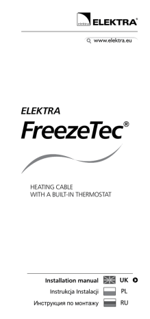 www.elektra.eu ELEKTRA FreezeTec ® HEATING CABLE WITH A BUILT-IN THERMOSTAT Installation manual UK Instrukcja Instalacji PL Инструкция по монтажу RU Application ELEKTRA FreezeTec® heating cables are intended for the anti-freeze protection of pipes with a max. diameter of 50 mm (2”), valves and water meters. They are recommended for installations located in unheated rooms or outdoors. The heating cable is installed on pipes, under insulation. The ELEKTRA FreezeTec® heating cables are produced in ready-made units, including heating cable with built-in thermostat at one end and terminated at the other end with a power supply conductor with a sealed plug. The thermostat will commence operation when the temperature on the pipe’s surface under thermal insulation will drop below +3°C, and terminate heating when the temperature will exceed +10°C. 6 5 4 2 1 3 ELEKTRA FreezeTec ® heating cable 1•ELEKTRA 2•„cold” FreezeTec® heating cable power supply conductor 3•connecting joint between the power supply conductor and the heating cable 4•label 5•thermostat 6•sealed plug 3 Heating Cable ELEKTRA Product Features • available in ready-made units with length varying from 2 to 42 m, • terminated at one end with a 1.5 m long power supply conductor with a sealed plug and with a thermostat at the other end, • power output of the heating cable: 12 W/m, • power supply voltage: 230 V, 50/60 Hz, • min. installation temperature: -5°C, • max. operating temperature: 70°C, • min. cable bending radius: 3.5 D, • controls: built-in bimetal thermostat. 4 operation on: +3°C operation off: +10°C Installation Stage 1 The selected length of the heating cable should match the length of the pipe to be heated. Place the cable along the pipe, fixing with installation tape (included in the package), as shown in the diagram. Place the thermostat at this end of the pipe which will be exposed to lowest ambient temperatures. 30 0 mm installation tape top pipeline thermal insulation heating cable 5 Heating Cable ELEKTRA NOTE: ! If ELEKTRA FreezeTec® heating cable’s length slightly exceeds that of the pipe, the cable can be positioned spirally along the pipe. When heating plastic pipes, use self-adhesive aluminium tape under the heating cable. Positioning the heating cable on bends and elbows 6 Positioning the heating cable on valves and flanges CAUTION: eating cables must not cross or be brought H nearer than the distance of 5 cm max. ! 7 Heating Cable ELEKTRA Stage 2 When the cable has been positioned on the pipe, cover it on the entire length with self-adhesive aluminum tape. This will keep the cable directly at the pipe’s surface which facilitates heat transfer. Moreover, the tape will prevent the cable from being pushed into the thermal insulation layer thus protecting the cable from potential overheating. Stage 3 The pipes with heating cables positioned on them should be covered with a layer of insulation. The thickness of the insulation will depend on the ambient minimum temperature to be encountered in the vicinity of the insulated pipe. Pipe’s internal diameter Minimum ambient temperature -15°C -25°C -35°C DN [mm] Inches 8 ¼ 9 9 15 ½ 9 9 9 20 ¾ 9 9 13 25 1 9 9 13 32 1¼ 9 13 19 40 1½ 9 13 19 50 2 9 13 19 Insulation’s thickness [mm] 9 Operation Connect ELEKTRA FreezeTec® heating cable to mains. Power supply installation must be equipped with a residual current device of the sensitivity level ∆ ≤ 30 mA. The RCD does not have to be dedicated to the FreezeTec® heating cable, it can be a common device used for other circuits/equipment. 8 Warranty Conditions ELEKTRA company grants a 3 year-long warranty (from the date of purchase) for the ELEKTRA FreezeTec® heating cables. 1.For the warranty to apply, the following is required: a.the heating system was installed in compliance with this manual, b.proof of purchase for the heating cable is included. 2.The Warranty is void if persons other than an ELEKTRA-certified installer attempted to repair the product. 3.The Warranty does not cover: a.mechanical damage, b.damage due to unsuitable power supply, c.lack of adequate overload and differential protection measures, d.damage resulting from electrical connection performed in violation of the regulations in force. 4.A s part of the Warranty service, ELEKTRA undertakes to reimburse all costs incurred solely in connection with repairing or replacing a defective heating mat. 5.The Warranty covering the purchased commercial goods does not exclude, limit or suspend other Buyer’s rights resulting from the incompatibility of the goods purchased with the agreement of purchase. NOTE: he Warranty claims must be registered T with the proof of purchase, in the place of purchase or the offices of ELEKTRA. ! 9 www.elektra.eu www.elektra.pl ELEKTRA FreezeTec ® PRZEWÓD GRZEJNY Z WBUDOWANYM TERMOSTATEM Installation manual UK Instrukcja Instalacji PL Инструкция по монтажу RU Zastosowanie Przewody grzejne ELEKTRA FreezeTec® przeznaczone są do ochrony przed zamarzaniem rur o średnicy do 50mm (2”), zaworów i wodomierzy. Stosowane są w izolowanych instalacjach w nieogrzewanych pomieszczeniach lub na zewnątrz. Przewód umieszczany jest na rurze, pod izolacją. Przewody grzejne ELEKTRA FreezeTec® składają się z przewodu grzejnego z wbudowanym na końcu termostatem. Z drugiej strony zakończone są przewodem zasilającym z hermetyczną wtyczką. Termostat powoduje uruchomienie pracy przewodu, gdy temperatura na rurze, pod izolacją termiczną, spadnie do +3°C, zaś wyłączenie grzania następuje w temperaturze +10°C. 6 5 4 2 1 3 Przewód grzejny ELEKTRA FreezeTec ® 1• przewód grzejny ELEKTRA FreezeTec® 2• przewód zasilający „zimny” 3• mufa łącząca przewód grzejny z przewodem zasilającym 4• tabliczka znamionowa 5• termostat 6• wtyczka hermetyczna 13 Przewód Grzejny ELEKTRA Charakterystyka • przewody gotowe do in