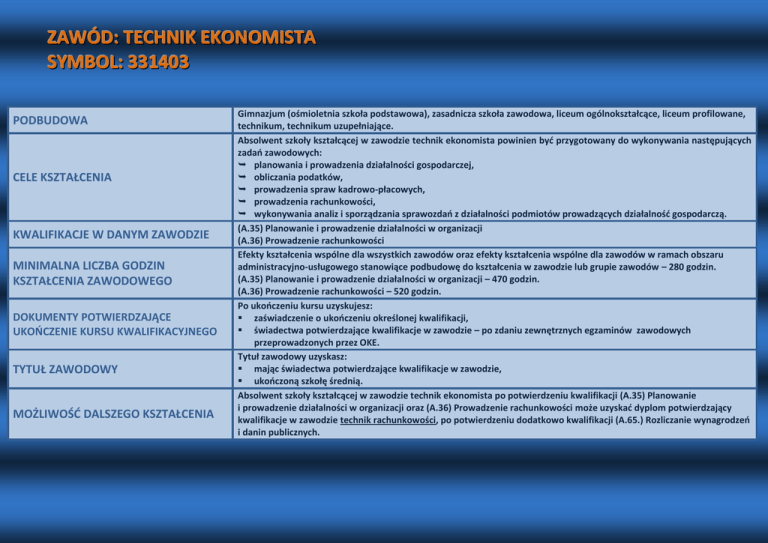 ZAWÓD: TECHNIK EKONOMISTA SYMBOL: 331403 PODBUDOWA CELE KSZTAŁCENIA KWALIFIKACJE W DANYM ZAWODZIE MINIMALNA LICZBA GODZIN KSZTAŁCENIA ZAWODOWEGO DOKUMENTY POTWIERDZAJĄCE UKOŃCZENIE KURSU KWALIFIKACYJNEGO TYTUŁ ZAWODOWY MOŻLIWOŚĆ DALSZEGO KSZTAŁCENIA Gimnazjum (ośmioletnia szkoła podstawowa), zasadnicza szkoła zawodowa, liceum ogólnokształcące, liceum profilowane, technikum, technikum uzupełniające. Absolwent szkoły kształcącej w zawodzie technik ekonomista powinien być przygotowany do wykonywania następujących zadań zawodowych: planowania i prowadzenia działalności gospodarczej, obliczania podatków, prowadzenia spraw kadrowo-płacowych, prowadzenia rachunkowości, wykonywania analiz i sporządzania sprawozdań z działalności podmiotów prowadzących działalność gospodarczą. (A.35) Planowanie i prowadzenie działalności w organizacji (A.36) Prowadzenie rachunkowości Efekty kształcenia wspólne dla wszystkich zawodów oraz efekty kształcenia wspólne dla zawodów w ramach obszaru administracyjno-usługowego stanowiące podbudowę do kształcenia w zawodzie lub grupie zawodów – 280 godzin. (A.35) Planowanie i prowadzenie działalności w organizacji – 470 godzin. (A.36) Prowadzenie rachunkowości – 520 godzin. Po ukończeniu kursu uzyskujesz: zaświadczenie o ukończeniu określonej kwalifikacji, świadectwa potwierdzające kwalifikacje w zawodzie – po zdaniu zewnętrznych egzaminów zawodowych przeprowadzonych przez OKE. Tytuł zawodowy uzyskasz: mając świadectwa potwierdzające kwalifikacje w zawodzie, ukończoną szkołę średnią. Absolwent szkoły kształcącej w zawodzie technik ekonomista po potwierdzeniu kwalifikacji (A.35) Planowanie i prowadzenie działalności w organizacji oraz (A.36) Prowadzenie rachunkowości może uzyskać dyplom potwierdzający kwalifikacje w zawodzie technik rachunkowości, po potwierdzeniu dodatkowo kwalifikacji (A.65.) Rozliczanie wynagrodzeń i danin publicznych.