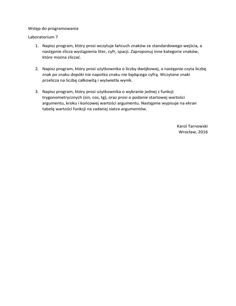 Wstęp do programowania Laboratorium 7 1. Napisz program, który prosi wczytuje łańcuch znaków ze standardowego wejścia, a następnie zlicza wystąpienia liter, cyfr, spacji. Zaproponuj inne kategorie znaków, które można zliczać. 2. Napisz program, który prosi użytkownika o liczby dwójkowej, a następnie czyta liczbę znak po znaku dopóki nie napotka znaku nie będącego cyfrą. Wczytane znaki przelicza na liczbę całkowitą i wyświetla wynik. 3. Napisz program, który prosi użytkownika o wybranie jednej z funkcji trygonometrycznych (sin, cos, tg), oraz prosi o podanie startowej wartości argumentu, kroku i końcowej wartości argumentu. Następnie wypisuje na ekran tabelę wartości funkcji na zadanej siatce argumentów. Karol Tarnowski Wrocław, 2016