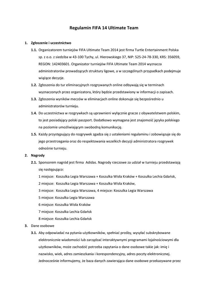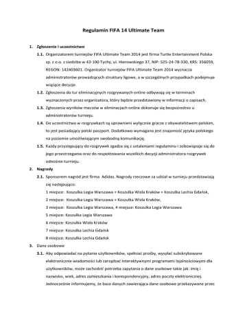 Regulamin FIFA 14 Ultimate Team 1. Zgłoszenie i uczestnictwo 1.1. Organizatorem turniejów FIFA Ultimate Team 2014 jest firma Turtle Entertainment Polska sp. z o.o. z siedziba w 43-100 Tychy, ul. Hierowskiego 37, NIP: 525-24-78-330, KRS: 356059, REGON: 142403601. Organizator turniejów FIFA Ultimate Team 2014 wyznacza administratorów prowadzących struktury ligowe, a w szczególnych przypadkach podejmuje wiążące decyzje. 1.2. Zgłoszenia do tur eliminacyjnych rozgrywanych online odbywają się w terminach wyznaczonych przez organizatora, który będzie przedstawiony w informacji o zapisach. 1.3. Zgłoszenia wyników meczów w eliminacjach online dokonuje się bezpośrednio u administratorów turnieju. 1.4. Do uczestnictwa w rozgrywkach są uprawnieni wyłącznie gracze z obywatelstwem polskim, to jest posiadający polski paszport. Dodatkowo wymagana jest znajomość języka polskiego na poziomie umożliwiającym swobodną komunikację. 1.5. Każdy przystępujący do rozgrywek zgadza się z ustaleniami regulaminu i zobowiązuje się do jego przestrzegania oraz do respektowania wszelkich decyzji administratora rozgrywek odnośnie turnieju. 2. Nagrody 2.1. Sponsorem nagród jest firma Adidas. Nagrody rzeczowe za udział w turnieju przedstawiają się następująco: 1 miejsce: Koszulka Legia Warszawa + Koszulka Wisła Kraków + Koszulka Lechia Gdańsk, 2 miejsce: Koszulka Legia Warszawa + Koszulka Wisła Kraków, 3 miejsce: Koszulka Legia Warszawa, 4 miejsce: Koszulka Legia Warszawa 5 miejsce: Koszulka Legia Warszawa 6 miejsce: Koszulka Wisła Kraków 7 miejsce: Koszulka Lechia Gdańsk 8 miejsce: Koszulka Lechia Gdańsk 3. Dane osobowe 3.1. Aby odpowiadać na pytania użytkowników, spełniać prośby, wysyłać subskrybowane elektronicznie wiadomości lub zarządzać interaktywnymi programami lojalnościowymi dla użytkowników, może zachodzić potrzeba zapytania o dane osobowe takie jak: imię i nazwisko, wiek, adres zamieszkania i korespondencyjny, adres poczty elektronicznej. Jednocześnie informujemy, że baza danych zawierająca dane osobowe przekazywane przez użytkowników jest zarejestrowana w Generalnym Inspektoracie Ochrony Danych Osobowych zgodnie z obowiązującymi przepisami prawnymi w tym Ustawą o ochronie danych osobowych. 4. Wszystkie mecze rozgrywek rozgrywane są przy pomocy gry FIFA 14 PS3 wyprodukowanej przez firmę EA Sports. 4.1. Ustawienia gry: • Długość połowy: 6 minut • Poziom trudności: World Class • Poziom trudności bramkarza: World Class • Szybkość gry: Normalna • Włączona obrona taktyczna • Składy: Online • Kontuzje: Off • Spalone: On • Kartki: On • Liczba zmian: 3 • Podania: Dowolne • Stadion: Dowolny • Pogoda: słoneczna 4.2. Wszystkie mecze muszą być rozgrywane za pomocą opcji Mecze Towarzyskie Online, zawsze na składach Online. 4.3. Wynik meczu w przypadku gier w pucharach wpisujemy po upływie 90 minut z wyjątkiem remisu. W przypadku remisu należy rozegrać dogrywkę metodą „złotego gola”, czyli kto pierwszy strzeli ten wygrywa spotkanie. 4.4. Zawodnik, który nie chce grać w deszczu ma prawo wyjść z gry na samym początku spotkania i połączyć się ponownie, aby grać w słońcu. Jeśli żaden z zawodników nie wychodzi z gry zakładamy, że zgadzają się na warunki atmosferyczne. UWAGA: Zasada ta nie tyczy się w przypadku, gdzie padnie gol lub jeden z zawodników zostanie ukarany czerwoną kartką. Wtedy należy dograć spotkanie do końca. 4.5. Jeżeli nastąpi rozłączenie gry pomiędzy 1 a 5 minutą należy powtórzyć całe spotkanie. Wynik meczu uzyskany do czasu rozłączenia należy dodać do końcowego rezultatu dogranego spotkania. Grę od środka rozpoczyna gracz, który był ostatni przy piłce w momencie rozłączenia: • 0 - 5 min -> cały mecz • 6 -10 min -> 85 min • 11-15 min -> 80 min • 16-20 min -> 75 min • 21-25 min -> 70 min • 26-30 min -> 65 min • 31-35 min -> 60 min • 36-40 min -> 55 min • 41-45 min -> 50 min • 46-50 min -> 1 połowa • 51-55 min -> 40 min • 56-60 min -> 35 min • 61-65 min -> 30 min • 66-70 min -> 25 min • 71-75 min -> 20 min • 76-80 min -> 15 min • 81-85 min -> 10 min • 86-90 min -> 7 min • 90-95 min -> 30 min • 95-100 min -> 25 min • 100-105 min -> 20 min • 105-110 min -> 15 min • 110-115 min -> 10 min • 115-120 min -> 7 min 4.6. Jeżeli po rozpoczęciu spotkania mamy złe warunki gry w postaci lagów/delaya możemy opuścić spotkanie bez żadnych konsekwencji w pierwszych 5ciu minutach meczowych. Jeżeli jakość meczu się nie poprawi można usunąć mecz. UWAGA: Zasada ta nie tyczy się w przypadku, gdzie padnie gol lub jeden z zawodników zostanie ukarany czerwoną kartką. Wtedy należy dograć spotkanie do końca. 5. Zakazane zagrania 5.1. Ustawianie własnych formacji, czyli 6-2-2, 8-1-1 itp. (należy korzystać z dostępnych formacji) 5.2. Strzały od razu po rozpoczęciu -> http://www.easports.com/media/play/video/5706073 5.3. Używania tzw. Starej obrony gramy wyłącznie na Nowej Obronie ( taktycznej.) 5.4. Wychodzenie z meczu przed końcem spotkania 5.5. Zmiany drużyny po rozłączeniu 5.6. Niesportowe zachowanie: granie na czas, włączanie pauzy gdy nie jest się przy piłce bądź w trudnych dla przeciwnikach momentach oraz inne które według admina mogą być zaliczane jako niesportowe zachowanie. Pod ten punkt podchodzi również zachowanie na kanale IRC czy w proteście. Po wykonaniu przez przeciwnika zagrania zabronionego należy kontynuować rozgrywkę, a po zakończeniu meczu należy przedstawić Administratorowi Rozgrywek odpowiednie dowody. Po jego przejrzeniu i stwierdzeniu nieprawidłowości, nastąpi korekta wyniku, a przeciwnik zostanie ukarany. 6. Gracz, który był ukarany czerwoną kartkę przed przerwaniem meczu, musi niezwłocznie sfaulować piłkarza drużyny przeciwnej tak, aby ponownie został ukaranym czerwoną kartką. Faulu na czerwoną kartkę powinien dokonać tym s