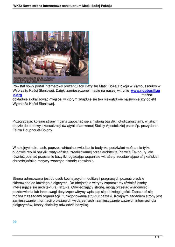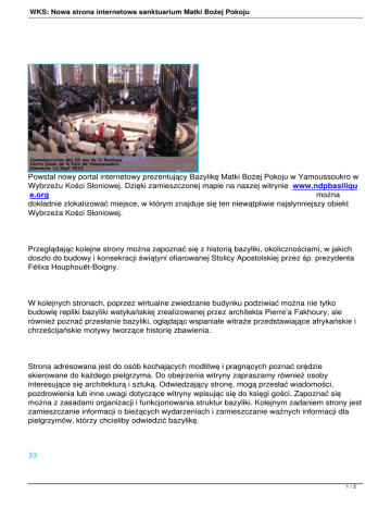 WKS: Nowa strona internetowa sanktuarium Matki Bożej Pokoju Powstał nowy portal internetowy prezentujący Bazylikę Matki Bożej Pokoju w Yamoussoukro w Wybrzeżu Kości Słoniowej. Dzięki zamieszczonej mapie na naszej witrynie www.ndpbasiliqu e.org można dokładnie zlokalizować miejsce, w którym znajduje się ten niewątpliwie najsłynniejszy obiekt Wybrzeża Kości Słoniowej. Przeglądając kolejne strony można zapoznać się z historią bazyliki, okolicznościami, w jakich doszło do budowy i konsekracji świątyni ofiarowanej Stolicy Apostolskiej przez śp. prezydenta Félixa Houphouët-Boigny. W kolejnych stronach, poprzez wirtualne zwiedzanie budynku podziwiać można nie tylko budowlę repliki bazyliki watykańskiej zrealizowanej przez architekta Pierre’a Fakhoury, ale również poznać przesłanie bazyliki, oglądając wspaniałe witraże przedstawiające afrykańskie i chrześcijańskie motywy tworzące historię zbawienia. Strona adresowana jest do osób kochających modlitwę i pragnących poznać orędzie skierowane do każdego pielgrzyma. Do obejrzenia witryny zapraszamy również osoby interesujące się architekturą i sztuką. Odwiedzający stronę, mogą przesłać wiadomości, pozdrowienia lub inne uwagi dotyczące witryny wpisując się do księgi gości. Zapoznać się można z zasadami organizacji i funkcjonowania struktur bazyliki. Kolejnym zadaniem strony jest zamieszczanie informacji o bieżących wydarzeniach i zamieszczanie ważnych informacji dla pielgrzymów, którzy chcieliby odwiedzić bazylikę. 1/2 WKS: Nowa strona internetowa sanktuarium Matki Bożej Pokoju Serdecznie zapraszamy do wirtualnego zwiedzania Bazyliki Matki Bożej Pokoju w Yamoussoukro ! 2/2