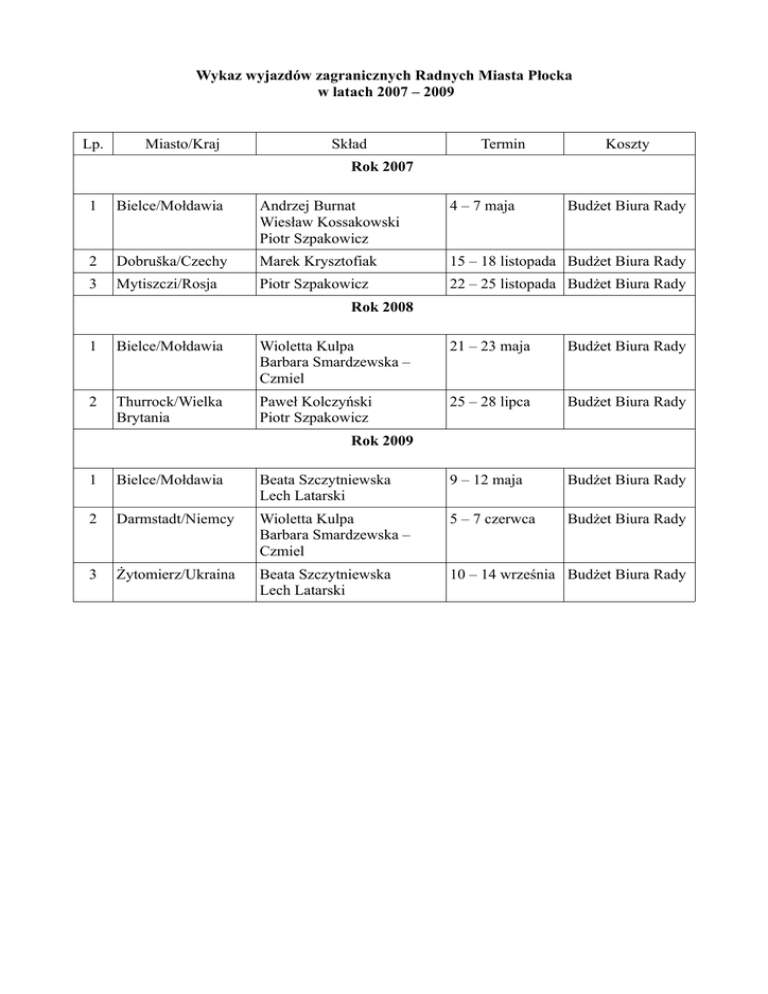 Wykaz wyjazdów zagranicznych Radnych Miasta Płocka w latach 2007 – 2009 Lp. Miasto/Kraj Skład Termin Koszty Rok 2007 1 Bielce/Mołdawia Andrzej Burnat Wiesław Kossakowski Piotr Szpakowicz 4 – 7 maja Budżet Biura Rady 2 Dobruška/Czechy Marek Krysztofiak 15 – 18 listopada Budżet Biura Rady 3 Mytiszczi/Rosja Piotr Szpakowicz 22 – 25 listopada Budżet Biura Rady Rok 2008 1 Bielce/Mołdawia Wioletta Kulpa Barbara Smardzewska – Czmiel 21 – 23 maja Budżet Biura Rady 2 Thurrock/Wielka Brytania Paweł Kolczyński Piotr Szpakowicz 25 – 28 lipca Budżet Biura Rady Rok 2009 1 Bielce/Mołdawia Beata Szczytniewska Lech Latarski 9 – 12 maja Budżet Biura Rady 2 Darmstadt/Niemcy Wioletta Kulpa Barbara Smardzewska – Czmiel 5 – 7 czerwca Budżet Biura Rady 3 Żytomierz/Ukraina Beata Szczytniewska Lech Latarski 10 – 14 września Budżet Biura Rady