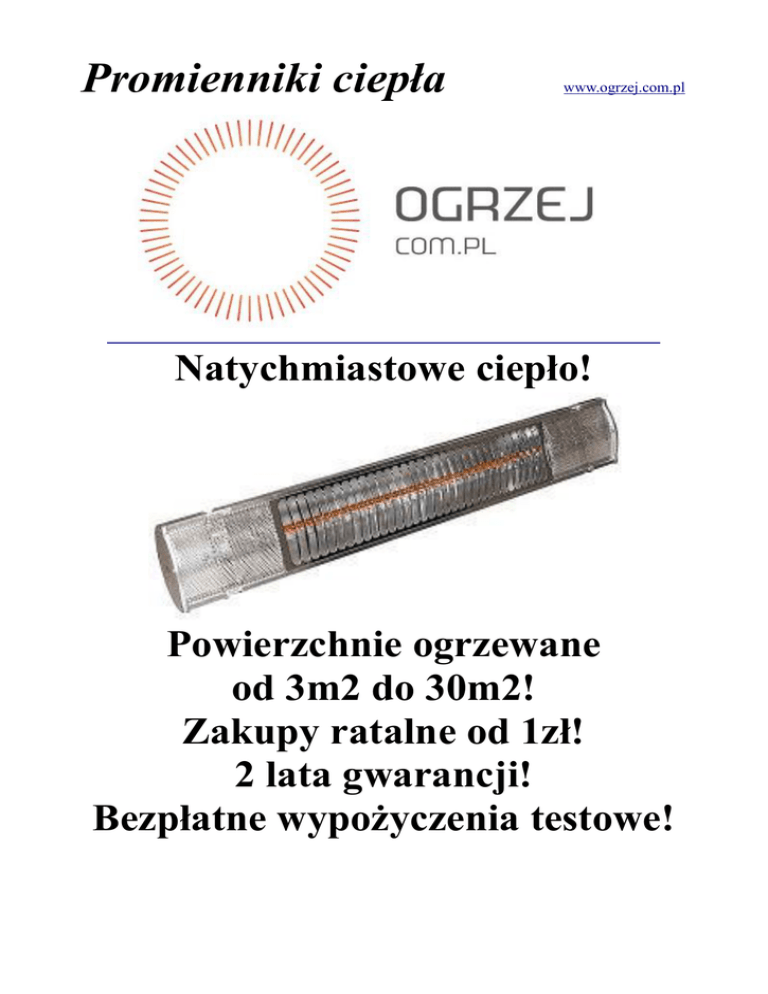 Promienniki ciepła www.ogrzej.com.pl Natychmiastowe ciepło! Powierzchnie ogrzewane od 3m2 do 30m2! Zakupy ratalne od 1zł! 2 lata gwarancji! Bezpłatne wypożyczenia testowe! OGS 2000 POWER 2 kW OG500 IP65 500W OG1000 IP65 1 kW Zestaw promiennikowy I: OG2000 + statyw Zestaw promiennikowy II: OG2000 + statyw OG1500 IP23 (3 x 500 W) Wieża OGS2000 POWER Sterownik mocy 2 kW Cennik szczegółowy produktów: Nazwa Ogrzana powierzchnia Moc OGS 2000 POWER 12 m.kw. 2 kW OG 2000 IP65 - Zestaw promiennikowy I (ze statywem) 12 m.kw. OG 2000 IP65 WODOSZCZELNY Cena (netto) Dostępne kolory 500,00 PLN netto biały, czarny 1.5 kW lub 2,0 kW 800 PLN netto srebrny (aluminium) 12 m.kw. 1.5 kW lub 2,0 kW 670 PLN netto srebrny (aluminium) OG 2000 IP65 - Zestaw promiennikowy II (ze zestawem) 12 m.kw. 1.5 kW lub 2,0 kW 860 PLN netto srebrny (aluminium) OG 500 IP65 WODOSZCZELNY 3-4 m.kw. 500 W (0,5 kW) 470 PLN netto srebrny (aluminium) OG 1000 IP65 WODOSZCZELNY 6-7 m.kw. 1000 W (1 kW) 570 PLN netto srebrny (aluminium) 9 m.kw. 1500 W (3 x 500 W) 540,00 PLN netto czarny, biały 24 m.kw. 3 kW (2 x 1,5 kW) lub 4 kW (2 x 2 kW) 1200,00 PLN netto promiennik: biały, statyw: czerwony Sterownik mocy 2 kW --------- --------- 340,00 PLN (cena netto) czarny Statyw --------- --------- 180,00 PLN czarny (cena netto) Promiennik parasolkowy OG 1500 IP23 Wieża OGS 2000 POWER www.ogrzej.com.pl ODDZIAŁ Woj. dolnośląskie W razie pytań lub wątpliwości zachęcam do kontaktu: TEL: 71 723 41 71 EMAIL: [email protected]