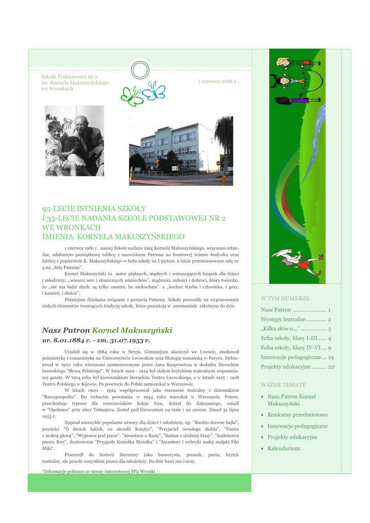 Szkoła Podstawowa nr 2 im. Kornela Makuszyńskiego we Wronkach 1 czerwca 2016 r . 95-LECIE ISTNIENIA SZKOŁY I 35-LECIE NADANIA SZKOLE PODSTAWOWEJ NR 2 WE WRONKACH IMIENIA KORNELA MAKUSZYŃSKIEGO 1 czerwca 1981 r. naszej Szkole nadano imię Kornela Makuszyńskiego, wręczono sztandar, odsłonięto pamiątkową tablicę z nazwiskiem Patrona na frontowej ścianie budynku oraz tablicę z popiersiem K. Makuszyńskiego w holu szkoły na I piętrze, a także przemianowano salę nr 5 na ,,Salę Patrona”. Kornel Makuszyński to autor pięknych, mądrych i wzruszających książek dla dzieci i młodzieży, ,,wieszcz serc i słonecznych uśmiechów”, mądrości, miłości i dobroci, który twierdzi, że ,,nie ma ludzi złych, są tylko smutni, bo niekochani”, a ,,kochać trzeba i człowieka, i góry, i kamień, i słońce”. Późniejsze działania związane z postacią Patrona Szkoły pozwoliły na wypracowanie stałych elementów tworzących tradycję szkoły, które pozostają w ceremoniale szkolnym do dziś. W TYM NUMERZE Nasz Patron ...................... 1 Występy teatralne .............. 2 Nasz Patron Kornel Makuszyński „Kilka słów o...” ................. 3 ur. 8.01.1884 r. - zm. 31.07.1953 r. Echa szkoły, klasy I-III ...... 4 Urodził się w 1884 roku w Stryju. Gimnazjum ukończył we Lwowie, studiował polonistykę i romanistykę na Uniwersytecie Lwowskim oraz filologię romańską w Paryżu. Debiutował w 1902 roku wierszami zamieszczonymi przez Jana Kasprowicza w dodatku literackim lwowskiego "Słowa Polskiego". W latach 1910 - 1914 był stałym krytykiem teatralnym wspomnianej gazety. W 1914 roku był kierownikiem literackim Teatru Lwowskiego, a w latach 1915 - 1918 Teatru Polskiego w Kijowie. Po powrocie do Polski zamieszkał w Warszawie. W latach 1920 - 1924 współpracował jako recenzent teatralny z dziennikiem "Rzeczpospolita". Do wybuchu powstania w 1944 roku mieszkał w Warszawie. Potem, przechodząc typowe dla warszawiaków koleje losu, dotarł do Zakopanego, osiadł w "Opolance" przy ulicy Tetmajera. Został pod Giewontem na stałe i na zawsze. Zmarł 31 lipca 1953 r. Napisał niezwykle popularne utwory dla dzieci i młodzieży, np. "Bardzo dziwne bajki", powieści "O dwóch takich, co ukradli Księżyc", "Przyjaciel wesołego diabła", "Panna z mokrą głową", "Wyprawa pod psem", "Awantura o Basię", "Szatan z siódmej klasy", "Szaleństwa panny Ewy", ilustrowane "Przygody Koziołka Matołka" i "Awantury i wybryki małej małpki Fiki Miki". Przeszedł do historii literatury jako humorysta, prozaik, poeta, krytyk teatralny, ale przede wszystkim pisarz dla młodzieży. Do dziś bawi nas i uczy. *Informacje pobrano ze strony internetowej SP2 Wronki Echa szkoły, klasy IV-VI .... 9 Innowacje pedagogiczne ... 19 Projekty edukacyjne .......... 22 WAŻNE TEMATY Nasz Patron Kornel Makuszyński Konkursy przedmiotowe Innowacje pedagogiczne Projekty edukacyjne Kalendarium „STRACONY JEST KAŻDY DZIEŃ BEZ UŚMIECHU” W Przeglądzie Teatrzyków Szkolnych Szkół noszących imię Kornela Makuszyńskiego, w ramach odchodów jubileuszowych dla klas IV-VI wystąpią zaproszeni goście. Jako pierwsi z przedstawieniem „Koziołek nie matołek” zaprezentują się uczniowie ze Szkoły Podstawowej w Skwierzynie, przygotowani przez panią Jadwigę Wysocką. „Nie byłoby radości bez smutku" to scenka kolejnej grupy teatralnej, tym razem ze Szkoły Podstawowej im. Kornela Makuszyńskiego nr 80 z Poznania, którą prowadzi pani Ewa Iwaszkiewicz. Natomiast wroniecka Kornelówka pokaże „Kopciuszka” w wersji współczesnej pod kierownictwem pani Elizy Paszyk. Pierwszy przegląd teatralny, 2014 r. Specjalnie dla młodszych uczniów zagrają wychowankowie pani Izabeli Świniarskiej i pani Beaty Tomczak. Wronkach. Każdy inscenizację opartą na wybranej powieści Kornela Makuszyńskiego. 2 To nasz drugi Przegląd Teatralny. Pierwszy odbył się w czerwcu 2014 r. i też towarzyszył Świętu Szkoły. Wtedy na zaproszenie odpowiedziały 3 szkoły SP 80 z Poznania, Szkoła Podstawowa ze Skwierzyny oraz Szkoła Podstawowa z Kruszewa. Swoją inscenizację przygotowali też młodzi aktorzy z SP2 we zespół przedstawił ok. 15-minutową KILKA SŁÓW O… Szkole Podstawowej nr 80 z Poznania „Położona w głębi osiedli Raszyn i Kopernika szkoła jest placówką kameralną, bezpieczną (z dala od ruchliwych ulic). Tu dzieci spędzają czas w pogodnej i życzliwej atmosferze. Nauka odbywa się w systemie jednozmianowym, dzięki czemu pozostaje jeszcze dużo czasu na rozwijanie swoich zainteresowań oraz talentów podczas zajęć pozalekcyjnych.”* Szkole Podstawowej im. Kornela Makuszyńskiego ze Skwierzyny 3 „Jesteśmy Zespołem Edukacyjnym – Szkołą Podstawową im. Kornela Makuszyńskiego w Skwierzynie. „Zespół” to takie bezbarwne określenie. Gdyby to od nas zależało, nazwalibyśmy się „Kornelowską Rodziną”. Rodziną, bo wszyscy się tutaj dobrze znamy i bardzo dobrze wśród siebie się czujemy. Na czele - głowy naszej rodziny, czyli Dyrekcja. Są to panowie: Leszek Pawłowski – dyrektor i Wojciech Kudliński – z-ca dyrektora. Te głowy są naprawdę nie od parady, bo zarządzają kadrą pedagogiczną w liczbie 52 osób. Nauczyciele z kolei uczą w 28 oddziałach klasowych, w których uczy się 620 uczniów. Taka ilość dorosłych i dzieci spotyka się codziennie w murach naszej szkoły, tak jak w rodzinnym domu. Lekcje odbywają się w 5 budynkach połączonych ze sobą długim holem. Cieszymy się, że przyjaźnimy się z innymi kornelowskimi szkołami i że możemy czasami się z nimi spotkać, tak jak teraz we Wronkach.”** *informacja pobrana ze strony szkoły: http://sp80.poznan.pl/ **informacja przesłana przez Szkołę Podstawową im. Kornela Makuszyńskiego w Skwierzynie „ECHA Z NASZEJ SZKOŁY…” Uczniowie klas I-III uczestniczą w ciekawych imprezach organizowanych na terenie szkoły. Do tych tradycyjnych należą Święto Pieczonego 