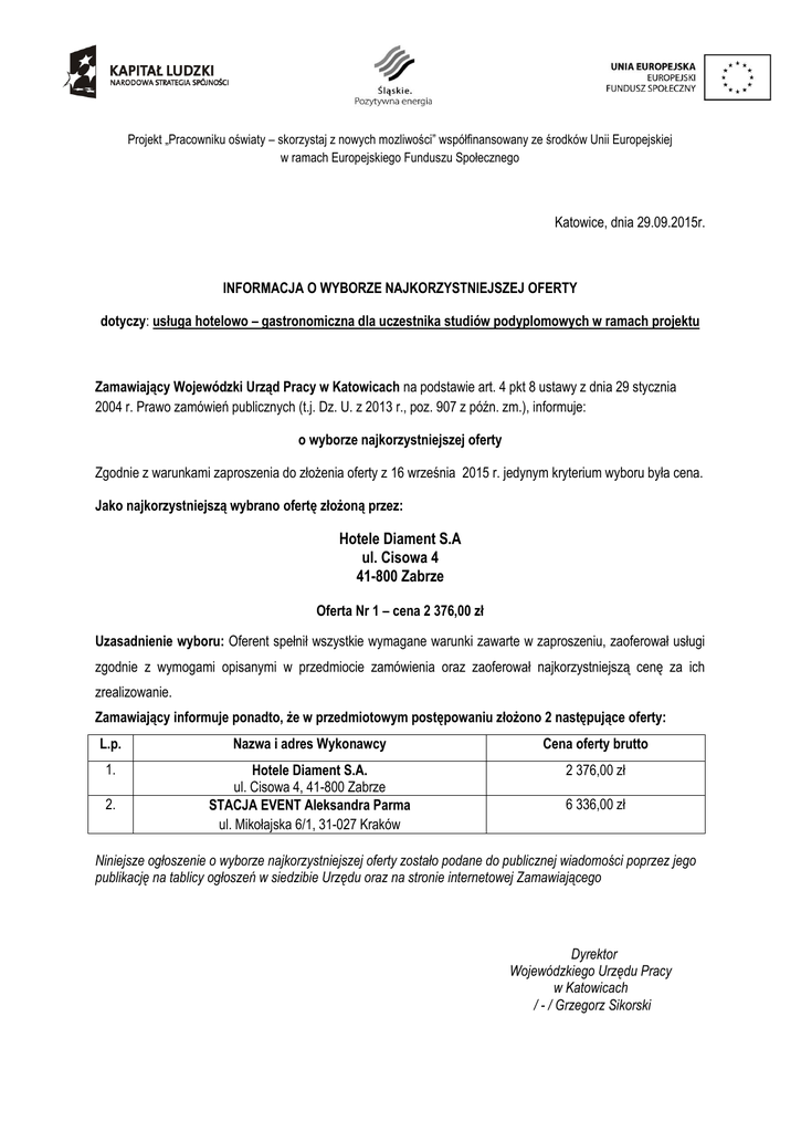 Projekt „Pracowniku oświaty – skorzystaj z nowych mozliwości” współfinansowany ze środków Unii Europejskiej w ramach Europejskiego Funduszu Społecznego Katowice, dnia 29.09.2015r. INFORMACJA O WYBORZE NAJKORZYSTNIEJSZEJ OFERTY dotyczy: usługa hotelowo – gastronomiczna dla uczestnika studiów podyplomowych w ramach projektu Zamawiający Wojewódzki Urząd Pracy w Katowicach na podstawie art. 4 pkt 8 ustawy z dnia 29 stycznia 2004 r. Prawo zamówień publicznych (t.j. Dz. U. z 2013 r., poz. 907 z późn. zm.), informuje: o wyborze najkorzystniejszej oferty Zgodnie z warunkami zaproszenia do złożenia oferty z 16 września 2015 r. jedynym kryterium wyboru była cena. Jako najkorzystniejszą wybrano ofertę złożoną przez: Hotele Diament S.A ul. Cisowa 4 41-800 Zabrze Oferta Nr 1 – cena 2 376,00 zł Uzasadnienie wyboru: Oferent spełnił wszystkie wymagane warunki zawarte w zaproszeniu, zaoferował usługi zgodnie z wymogami opisanymi w przedmiocie zamówienia oraz zaoferował najkorzystniejszą cenę za ich zrealizowanie. Zamawiający informuje ponadto, że w przedmiotowym postępowaniu złożono 2 następujące oferty: L.p. Nazwa i adres Wykonawcy Cena oferty brutto 1. Hotele Diament S.A. ul. Cisowa 4, 41-800 Zabrze STACJA EVENT Aleksandra Parma ul. Mikołajska 6/1, 31-027 Kraków 2 376,00 zł 2. 6 336,00 zł Niniejsze ogłoszenie o wyborze najkorzystniejszej oferty zostało podane do publicznej wiadomości poprzez jego publikację na tablicy ogłoszeń w siedzibie Urzędu oraz na stronie internetowej Zamawiającego Dyrektor Wojewódzkiego Urzędu Pracy w Katowicach / - / Grzegorz Sikorski