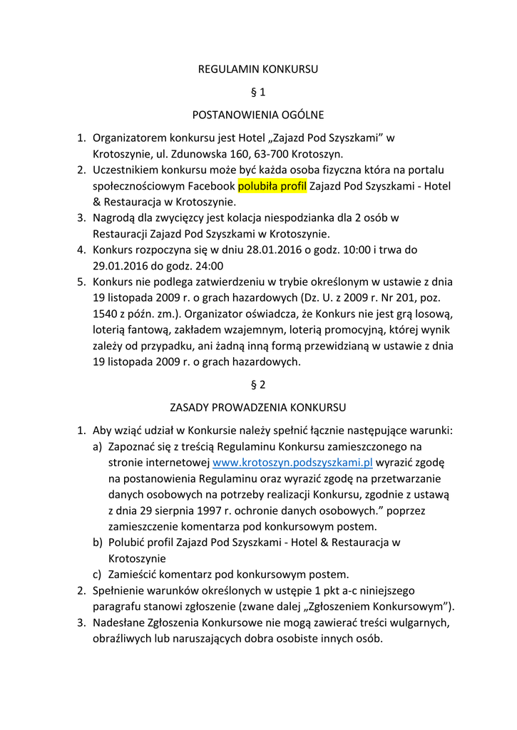 REGULAMIN KONKURSU §1 POSTANOWIENIA OGÓLNE 1. Organizatorem konkursu jest Hotel „Zajazd Pod Szyszkami” w Krotoszynie, ul. Zdunowska 160, 63-700 Krotoszyn. 2. Uczestnikiem konkursu może być każda osoba fizyczna która na portalu społecznościowym Facebook polubiła profil Zajazd Pod Szyszkami - Hotel & Restauracja w Krotoszynie. 3. Nagrodą dla zwycięzcy jest kolacja niespodzianka dla 2 osób w Restauracji Zajazd Pod Szyszkami w Krotoszynie. 4. Konkurs rozpoczyna się w dniu 28.01.2016 o godz. 10:00 i trwa do 29.01.2016 do godz. 24:00 5. Konkurs nie podlega zatwierdzeniu w trybie określonym w ustawie z dnia 19 listopada 2009 r. o grach hazardowych (Dz. U. z 2009 r. Nr 201, poz. 1540 z późn. zm.). Organizator oświadcza, że Konkurs nie jest grą losową, loterią fantową, zakładem wzajemnym, loterią promocyjną, której wynik zależy od przypadku, ani żadną inną formą przewidzianą w ustawie z dnia 19 listopada 2009 r. o grach hazardowych. §2 ZASADY PROWADZENIA KONKURSU 1. Aby wziąć udział w Konkursie należy spełnić łącznie następujące warunki: a) Zapoznać się z treścią Regulaminu Konkursu zamieszczonego na stronie internetowej www.krotoszyn.podszyszkami.pl wyrazić zgodę na postanowienia Regulaminu oraz wyrazić zgodę na przetwarzanie danych osobowych na potrzeby realizacji Konkursu, zgodnie z ustawą z dnia 29 sierpnia 1997 r. ochronie danych osobowych.” poprzez zamieszczenie komentarza pod konkursowym postem. b) Polubić profil Zajazd Pod Szyszkami - Hotel & Restauracja w Krotoszynie c) Zamieścić komentarz pod konkursowym postem. 2. Spełnienie warunków określonych w ustępie 1 pkt a-c niniejszego paragrafu stanowi zgłoszenie (zwane dalej „Zgłoszeniem Konkursowym”). 3. Nadesłane Zgłoszenia Konkursowe nie mogą zawierać treści wulgarnych, obraźliwych lub naruszających dobra osobiste innych osób. 4. Zgłoszenia Konkursowe niespełniające wymogów określonych w § 2 ust. 1 lub § 2 ust. 3 nie będą przyjmowane. §3 NAGRODY W KONKURSIE I SPOSÓB ICH PRZEKAZANIA 1. W ramach konkursu przewidziana jest nagroda – kolacja niespodzianka dla 2 osób w Restauracji Pod Szyszkami w Krotoszynie, ul. Zdunowska 160, 63-700 Krotoszyn. 2. Zwycięzca konkursu zostanie wyłoniony poprzez losowanie jednej prawidłowej odpowiedzi spośród wszystkich nadesłanych zgłoszeń konkursowych przez powołaną przez Organizatora Komisję Konkursową składającą się z przedstawicieli Organizatora. 3. Powiadomienie zwycięzcy Konkursu nastąpi przez przesłanie widomości prywatnej poprzez portal społecznościowy FACEBOOK.