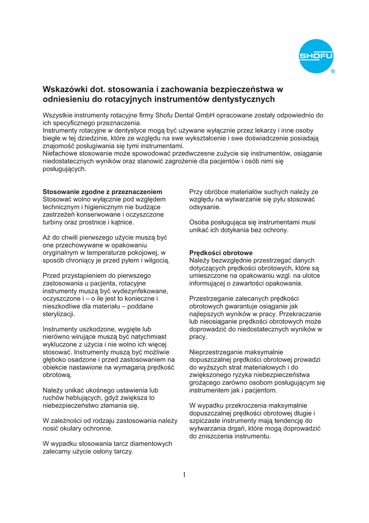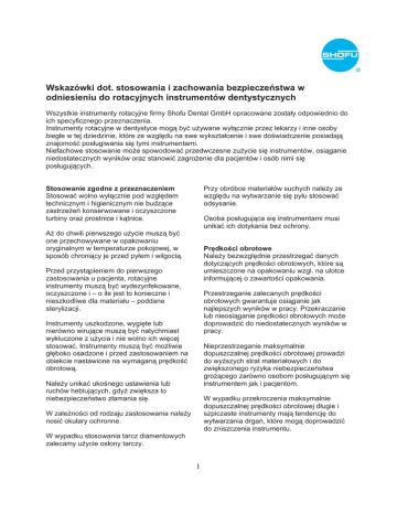 Wskazówki dot. stosowania i zachowania bezpieczeństwa w odniesieniu do rotacyjnych instrumentów dentystycznych Wszystkie instrumenty rotacyjne firmy Shofu Dental GmbH opracowane zostały odpowiednio do ich specyficznego przeznaczenia. Instrumenty rotacyjne w dentystyce mogą być używane wyłącznie przez lekarzy i inne osoby biegłe w tej dziedzinie, które ze względu na swe wykształcenie i swe doświadczenie posiadają znajomość posługiwania się tymi instrumentami. Niefachowe stosowanie może spowodować przedwczesne zużycie się instrumentów, osiąganie niedostatecznych wyników oraz stanowić zagrożenie dla pacjentów i osób nimi się posługujących. Przy obróbce materiałów suchych należy ze względu na wytwarzanie się pyłu stosować odsysanie. Stosowanie zgodne z przeznaczeniem Stosować wolno wyłącznie pod względem technicznym i higienicznym nie budzące zastrzeżeń konserwowane i oczyszczone turbiny oraz prostnice i kątnice. Osoba posługująca się instrumentami musi unikać ich dotykania bez ochrony. Aż do chwili pierwszego użycie muszą być one przechowywane w opakowaniu oryginalnym w temperaturze pokojowej, w sposób chroniący je przed pyłem i wilgocią. Prędkości obrotowe Należy bezwzględnie przestrzegać danych dotyczących prędkości obrotowych, które są umieszczone na opakowaniu wzgl. na ulotce informującej o zawartości opakowania. Przed przystąpieniem do pierwszego zastosowania u pacjenta, rotacyjne instrumenty muszą być wydezynfekowane, oczyszczone i – o ile jest to konieczne i nieszkodliwe dla materiału – poddane sterylizacji. Przestrzeganie zalecanych prędkości obrotowych gwarantuje osiąganie jak najlepszych wyników w pracy. Przekraczanie lub nieosiąganie prędkości obrotowych może doprowadzić do niedostatecznych wyników w pracy. Instrumenty uszkodzone, wygięte lub nierówno wirujące muszą być natychmiast wykluczone z użycia i nie wolno ich więcej stosować. Instrumenty muszą być możliwie głęboko osadzone i przed zastosowaniem na obiekcie nastawione na wymaganą prędkość obrotową. Nieprzestrzeganie maksymalnie dopuszczalnej prędkości obrotowej prowadzi do wyższych strat materiałowych i do zwiększonego ryzyka niebezpieczeństwa grożącego zarówno osobom posługującym się instrumentem jak i pacjentom. Należy unikać ukośnego ustawienia lub ruchów heblujących, gdyż zwiększa to niebezpieczeństwo złamania się. W wypadku przekroczenia maksymalnie dopuszczalnej prędkości obrotowej długie i szpiczaste instrumenty mają tendencję do wytwarzania drgań, które mogą doprowadzić do zniszczenia instrumentu. W zależności od rodzaju zastosowania należy nosić okulary ochronne. W wypadku stosowania tarcz diamentowych zalecamy użycie osłony tarczy. 1 13060 – Sterylizacja w autoklawie wilgotnym gorącym powietrzem (w temperaturze 134 °C przy minimalnym okresie przebywania wynoszącym 3 minuty z frakcjonowaniem próżnią wstępną i co najmniej 10 minutowym czasem schnięcia). Siły naciskające Należy bezwzględnie unikać występowania nadmiernych sił naciskających. Mogą one spowodować uszkodzenie elementu roboczego instrumentów, połączone z wyszczerbieniem się krawędzi ostrza i równoczesnym zwiększeniem wytwarzania się ciepła. W czasie sterylizacji należy bezwzględnie przestrzegać instrukcji obsługi producenta sprzętu. Nadmierne siły naciskające mogą w wypadku instrumentów szlifujących doprowadzić do wykruszenia się ziaren ściernych lub do zasmarowania instrumentu i do wytwarzania się ciepła. Przed przystąpieniem do sterylizacji instrumenty muszą być dostatecznie zdezynfekowane i wyczyszczone. Ze względu na przegrzewanie nadmierne siły naciskające mogą także doprowadzić do uszkodzenia miazgi lub ze względu na wyszczerbione krawędzie – do niepożądanej szorstkości powierzchni. Również nie można wtedy wykluczyć złamania się instrumentu. Dezynfekcja może być przeprowadzona ręcznie lub maszynowo. Ręczna możliwość czyszczenia i dezynfekcji instrumentów SHOFU została potwierdzona i poddana walidacji. Zanieczyszczenia powierzchniowe dokładnie usunąć pod bieżącą wodą stosując odpowiednią szczotkę. Chłodzenie Aby w czasie preparowania uniknąć za silnego wytwarzania się ciepła należy zapewnić dostateczne chłodzenie powietrzem / wodą (co najmniej 50 ml / min). Umieścić instrumenty w uchwycie (np. Bur Block, firma SHOFU) i: Instrumenty diamentowe i z metalu włożyć do łaźni ultrasonograficznej, kamienie i wyposażenie do polerowania włożyć do łaźni ciepłej , które wypełnione są przewidzianą ilością wody włącznie z 2% preparatu chemicznego do czyszczenia i dezynfekcji Stammopur DR8 (Dr. H Stamm GmbH, Berlin). W wypadku niedostatecznego chłodzenia może dojść do nieodwracalnego uszkodzenia zęba / kości i / lub tkanki. Przygotowanie do ponownego użycia Przechowywanie, dezynfekcja, czyszczenie i sterylizacja Używane instrumenty należy przed przystąpieniem do czyszczeniem zawsze zdezynfekować. Czas oddziaływania wynosi 10 min. przy temperaturze łaźni 45 °C. Po upływie okresu oddziaływania dokładnie spłukać wodą i osuszyć sprężonym powietrzem. Wszystkie instrumenty i elementy opakowane są niesterylnie i dlatego też, w zależności od rodzaju zastosowania, muszą być przed użyciem poddane sterylizacji. Następnie przeprowadzić oględziny pod kątem czystości i braku uszkodzeń. Jeśli widoczne są jeszcze pozostałości zanieczyszczeń, powtarzać czyszczenie i chemiczną dezynfekcję aż zanieczyszczenia nie będą widoczne. W razie wykonania nieprzepisowego czyszczenia i sterylizacji instrumentów pacjent może ulec zakażeniu niebezpiecznymi zarazkami. Maszynowa zdolność do czyszczenia i dezynfekowania instrumentów SHOFU dostępnymi w handlu środkami Wszystkie materiały mogą być poddawane sterylizacji wg normy EN DIN 554 i DIN EN 2 NADAJĄCE SIĘ do przygotowywania 