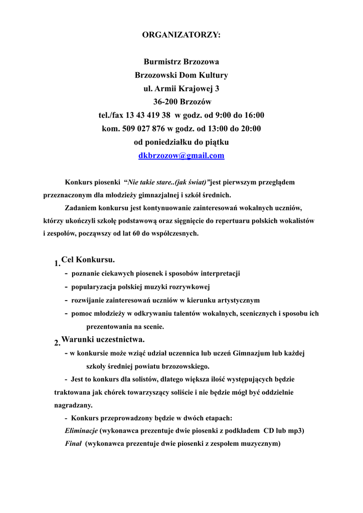 ORGANIZATORZY: ! Burmistrz Brzozowa Brzozowski Dom Kultury ul. Armii Krajowej 3 36-200 Brzozów tel./fax 13 43 419 38 w godz. od 9:00 do 16:00 kom. 509 027 876 w godz. od 13:00 do 20:00 od poniedziałku do piątku [email protected] ! Konkurs piosenki “Nie takie stare..(jak świat)”jest pierwszym przeglądem przeznaczonym dla młodzieży gimnazjalnej i szkół średnich. Zadaniem konkursu jest kontynuowanie zainteresowań wokalnych uczniów, którzy ukończyli szkołę podstawową oraz sięgnięcie do repertuaru polskich wokalistów i zespołów, począwszy od lat 60 do współczesnych. ! 1. Cel Konkursu. - poznanie ciekawych piosenek i sposobów interpretacji - popularyzacja polskiej muzyki rozrywkowej - rozwijanie zainteresowań uczniów w kierunku artystycznym - pomoc młodzieży w odkrywaniu talentów wokalnych, scenicznych i sposobu ich prezentowania na scenie. 2. Warunki uczestnictwa. - w konkursie może wziąć udział uczennica lub uczeń Gimnazjum lub każdej szkoły średniej powiatu brzozowskiego. - Jest to konkurs dla solistów, dlatego większa ilość występujących będzie traktowana jak chórek towarzyszący soliście i nie będzie mógł być oddzielnie nagradzany. - Konkurs przeprowadzony będzie w dwóch etapach: Eliminacje (wykonawca prezentuje dwie piosenki z podkładem CD lub mp3) Finał (wykonawca prezentuje dwie piosenki z zespołem muzycznym) - Uczestnik wybiera piosenki z listy utworów podanych przez organizatora (w każdej edycji konkursu będzie to repertuar dwóch polskich solistów lub zespołów) - W konkursie finałowym wezmą udział wykonawcy, którzy zostaną wytypowani przez Komisję Konkursową( do 20 wokalistów). - Uczestnicy, którzy wezmą udział w finale opłacają akredytację w wysokości 20zł przed próbami z zespołem muzycznym 3. Terminy konkursów. ! - Eliminacje - 8.maj 2014 godz. 10:00 - Finał - 12 czerwiec godz. 17:00 - zgłoszenia należy dostarczyć do Brzozowskiego Domu Kultury do 5. 05.2014. ! ! 4. Kategorie wiekowe i nagrody ! - I kategoria ( klasy 1-3 Gimnazjum) - II kategoria ( klasy 1-3 Szkoły średnie) - Przewidziano po trzy nagrody dla każdej kategorii ! 5. Organizacja konkursu - Instruktorzy BDK mogą pomóc w wyborze piosenki czy podkładu muzycznego - Organizator zapewnia zespół muzyczny, który będzie akompaniował finalistom. - Zapewnia się przeprowadzenie co najmniej dwóch prób z zespołem. - Terminy prób będą ustalane indywidualnie z każdym z finalistów po przeprowadzonych eliminacjach. - Przed Konkursem Eliminacyjnym przewidujemy jedynie próbę akustyczną i sprawdzenie nośnika podkładu w godz. 8:30 do 10:00 6. Repertuar do wyboru. W tej edycji największe przeboje zespołu „2 plus 1” oraz Anny Jantar - Lista utworów do wyboru: „Iść w stronę słońca” „Czerwone słoneczko” „Chodź pomaluj mój świat” „Wstawaj szkoda dnia” „Hej dogonię lato” „Gwiazda dnia” ! „Windą do nieba” „Ding, dong” „Taksówka nr.5” „Nic nie boli” „Podziel na dwa” „A my jak dzieci” „Romanse za grosz” „Z popiołu wosku” „Moje jedyne marzenie” „Pozwolił nam los” „Radość najpiękniejszych lat” „Nic nie może przecież wiecznie trwać” „Tyle słońca w całym mieście” „Żeby szczęśliwym być” „Najtrudniejszy pierwszy krok” „Mój tylko mój” „Baju, baj” „Za każdy uśmiech Twój” „Wielka dama tańczy sama” „Tylko mnie poproś do tańca” „Nie wierz mi nie ufaj mi” „Za wszystkie noce” „Staruszek świat” „Zawsze gdzieś czeka ktoś” 7. Wybór piosenek i ocena W czasie Eliminacji prezentowane są po 2 piosenki wybrane z listy . W Finale konkursu prezentujemy jedną piosenkę, wybraną przez jury z dwóch prezentowanych w czasie Eliminacji. Wszystkie utwory są dostępne w Internecie, dlatego można je łatwo poznać i dostosować do swoich możliwości. W razie potrzeby instruktorzy BDK pomogą w dostosowaniu tonacji podkładu. Dopuszczamy możliwość powtórzenia się tej samej piosenki do trzech razy w konkursie (w tym wypadku obowiązywać będzie kolejność zgłoszeń). W razie niższego poziomu wykonawczego w konkursie eliminacyjnym, komisja zastrzega sobie możliwość zakwalifikowania większej niż 10 osób z jednej kategorii na niekorzyść drugiej. ! Kryteria oceny: - dykcja i emisja głosu - intonacja - interpretacja utworu - prezentacja sceniczno-ruchowa ! ! BRZOZÓW maj-czerwiec 2014