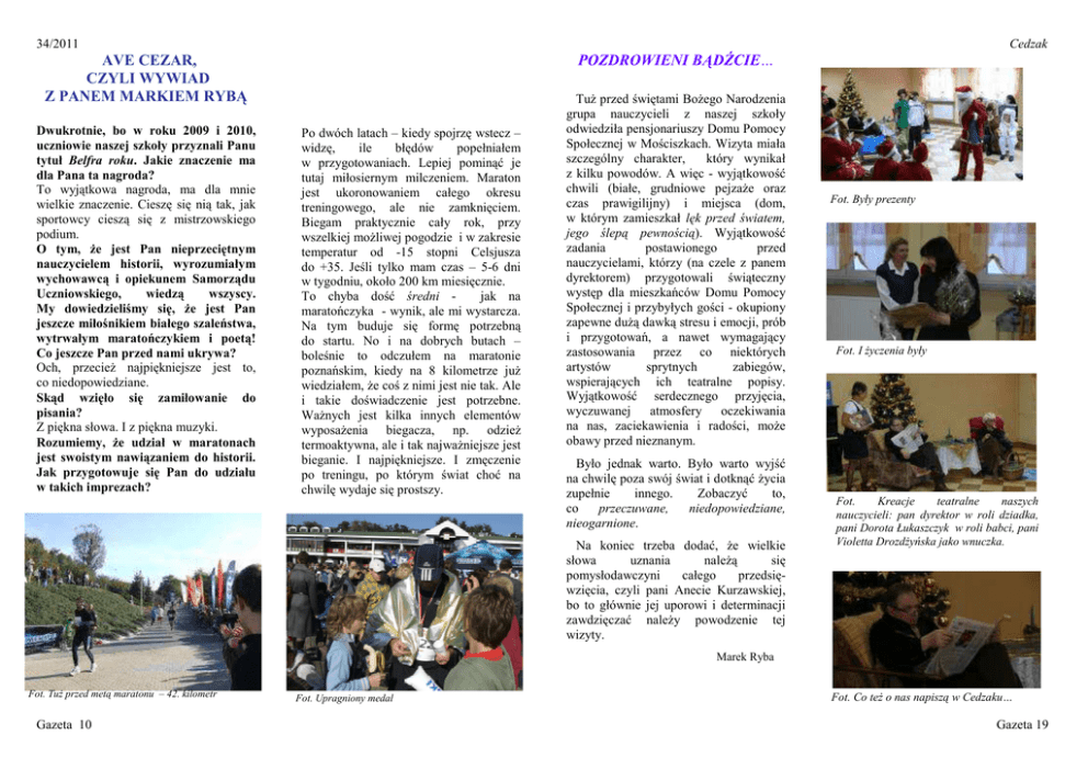34/2011 Cedzak POZDROWIENI BĄDŹCIE… AVE CEZAR, CZYLI WYWIAD Z PANEM MARKIEM RYBĄ Dwukrotnie, bo w roku 2009 i 2010, uczniowie naszej szkoły przyznali Panu tytuł Belfra roku. Jakie znaczenie ma dla Pana ta nagroda? To wyjątkowa nagroda, ma dla mnie wielkie znaczenie. Cieszę się nią tak, jak sportowcy cieszą się z mistrzowskiego podium. O tym, Ŝe jest Pan nieprzeciętnym nauczycielem historii, wyrozumiałym wychowawcą i opiekunem Samorządu Uczniowskiego, wiedzą wszyscy. My dowiedzieliśmy się, Ŝe jest Pan jeszcze miłośnikiem białego szaleństwa, wytrwałym maratończykiem i poetą! Co jeszcze Pan przed nami ukrywa? Och, przecieŜ najpiękniejsze jest to, co niedopowiedziane. Skąd wzięło się zamiłowanie do pisania? Z piękna słowa. I z piękna muzyki. Rozumiemy, Ŝe udział w maratonach jest swoistym nawiązaniem do historii. Jak przygotowuje się Pan do udziału w takich imprezach? Po dwóch latach – kiedy spojrzę wstecz – widzę, ile błędów popełniałem w przygotowaniach. Lepiej pominąć je tutaj miłosiernym milczeniem. Maraton jest ukoronowaniem całego okresu treningowego, ale nie zamknięciem. Biegam praktycznie cały rok, przy wszelkiej moŜliwej pogodzie i w zakresie temperatur od -15 stopni Celsjusza do +35. Jeśli tylko mam czas – 5-6 dni w tygodniu, około 200 km miesięcznie. To chyba dość średni jak na maratończyka - wynik, ale mi wystarcza. Na tym buduje się formę potrzebną do startu. No i na dobrych butach – boleśnie to odczułem na maratonie poznańskim, kiedy na 8 kilometrze juŜ wiedziałem, Ŝe coś z nimi jest nie tak. Ale i takie doświadczenie jest potrzebne. WaŜnych jest kilka innych elementów wyposaŜenia biegacza, np. odzieŜ termoaktywna, ale i tak najwaŜniejsze jest bieganie. I najpiękniejsze. I zmęczenie po treningu, po którym świat choć na chwilę wydaje się prostszy. TuŜ przed świętami BoŜego Narodzenia grupa nauczycieli z naszej szkoły odwiedziła pensjonariuszy Domu Pomocy Społecznej w Mościszkach. Wizyta miała szczególny charakter, który wynikał z kilku powodów. A więc - wyjątkowość chwili (białe, grudniowe pejzaŜe oraz czas prawigilijny) i miejsca (dom, w którym zamieszkał lęk przed światem, jego ślepą pewnością). Wyjątkowość zadania postawionego przed nauczycielami, którzy (na czele z panem dyrektorem) przygotowali świąteczny występ dla mieszkańców Domu Pomocy Społecznej i przybyłych gości - okupiony zapewne duŜą dawką stresu i emocji, prób i przygotowań, a nawet wymagający zastosowania przez co niektórych artystów sprytnych zabiegów, wspierających ich teatralne popisy. Wyjątkowość serdecznego przyjęcia, wyczuwanej atmosfery oczekiwania na nas, zaciekawienia i radości, moŜe obawy przed nieznanym. Było jednak warto. Było warto wyjść na chwilę poza swój świat i dotknąć Ŝycia zupełnie innego. Zobaczyć to, co przeczuwane, niedopowiedziane, nieogarnione. Na koniec trzeba dodać, Ŝe wielkie słowa uznania naleŜą się pomysłodawczyni całego przedsięwzięcia, czyli pani Anecie Kurzawskiej, bo to głównie jej uporowi i determinacji zawdzięczać naleŜy powodzenie tej wizyty. Fot. Były prezenty Fot. I Ŝyczenia były Fot. Kreacje teatralne naszych nauczycieli: pan dyrektor w roli dziadka, pani Dorota Łukaszczyk w roli babci, pani Violetta DrozdŜyńska jako wnuczka. Marek Ryba Fot. TuŜ przed metą maratonu – 42. kilometr Gazeta 10 Fot. Upragniony medal Fot. Co teŜ o nas napiszą w Cedzaku… Gazeta 19