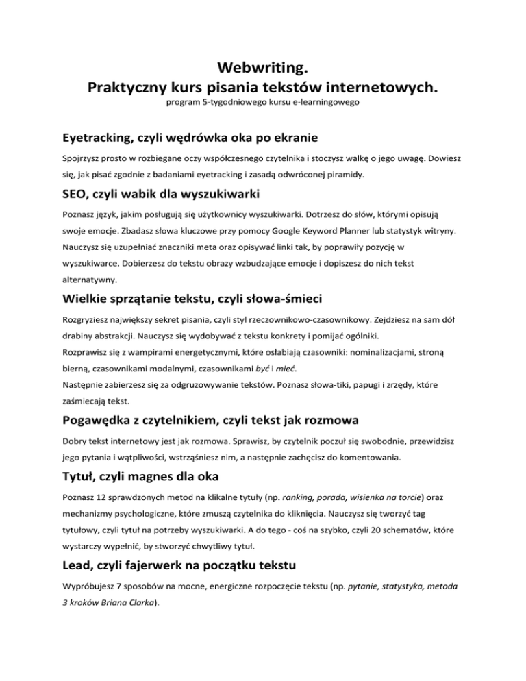 Webwriting. Praktyczny kurs pisania tekstów internetowych. program 5-tygodniowego kursu e-learningowego Eyetracking, czyli wędrówka oka po ekranie Spojrzysz prosto w rozbiegane oczy współczesnego czytelnika i stoczysz walkę o jego uwagę. Dowiesz się, jak pisać zgodnie z badaniami eyetracking i zasadą odwróconej piramidy. SEO, czyli wabik dla wyszukiwarki Poznasz język, jakim posługują się użytkownicy wyszukiwarki. Dotrzesz do słów, którymi opisują swoje emocje. Zbadasz słowa kluczowe przy pomocy Google Keyword Planner lub statystyk witryny. Nauczysz się uzupełniać znaczniki meta oraz opisywać linki tak, by poprawiły pozycję w wyszukiwarce. Dobierzesz do tekstu obrazy wzbudzające emocje i dopiszesz do nich tekst alternatywny. Wielkie sprzątanie tekstu, czyli słowa-śmieci Rozgryziesz największy sekret pisania, czyli styl rzeczownikowo-czasownikowy. Zejdziesz na sam dół drabiny abstrakcji. Nauczysz się wydobywać z tekstu konkrety i pomijać ogólniki. Rozprawisz się z wampirami energetycznymi, które osłabiają czasowniki: nominalizacjami, stroną bierną, czasownikami modalnymi, czasownikami być i mieć. Następnie zabierzesz się za odgruzowywanie tekstów. Poznasz słowa-tiki, papugi i zrzędy, które zaśmiecają tekst. Pogawędka z czytelnikiem, czyli tekst jak rozmowa Dobry tekst internetowy jest jak rozmowa. Sprawisz, by czytelnik poczuł się swobodnie, przewidzisz jego pytania i wątpliwości, wstrząśniesz nim, a następnie zachęcisz do komentowania. Tytuł, czyli magnes dla oka Poznasz 12 sprawdzonych metod na klikalne tytuły (np. ranking, porada, wisienka na torcie) oraz mechanizmy psychologiczne, które zmuszą czytelnika do kliknięcia. Nauczysz się tworzyć tag tytułowy, czyli tytuł na potrzeby wyszukiwarki. A do tego - coś na szybko, czyli 20 schematów, które wystarczy wypełnić, by stworzyć chwytliwy tytuł. Lead, czyli fajerwerk na początku tekstu Wypróbujesz 7 sposobów na mocne, energiczne rozpoczęcie tekstu (np. pytanie, statystyka, metoda 3 kroków Briana Clarka). Nagłówki, czyli punkty orientacyjne Zatrzymasz niecierpliwe oko internauty na nagłówkach, które zapewnią go, że warto czytać dalej. Wypróbujesz 6 typów skutecznych nagłówków. Landing page, czyli tekst reklamowy w internecie Dowiesz się, jak zaprojektować przejrzystą landing page i poznasz jej 10 głównych elementów. Stworzysz hasło reklamowe, przełożysz język cech na język korzyści, przełamiesz obawy, zmniejszysz ryzyko, wezwiesz do działania i skusisz promocją. W każdym tygodniu czeka Cię porcja ćwiczeń, które sprawdzi Joanna Wrycza-Bekier, autorka tego kursu oraz pięciu książek o pisaniu, w tym bestsellerów Webwriting. Profesjonalne tworzenie tekstów dla internetu i Magia słów. Jak pisać teksty, które porwą tłumy, a także popularnego bloga, Poradnik pisania.