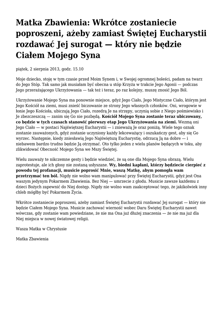 Matka Zbawienia: Wkrótce zostaniecie poproszeni, ażeby zamiast Świętej Eucharystii rozdawać Jej surogat — który nie będzie Ciałem Mojego Syna piątek, 2 sierpnia 2013, godz. 15.10 Moje dziecko, stoję w tym czasie przed Moim Synem i, w Swojej ogromnej boleści, padam na twarz do Jego Stóp. Tak samo jak musiałam być obecna u stóp Krzyża w trakcie Jego Agonii — podczas Jego przerażającego Ukrzyżowania — tak też i teraz, po raz kolejny, muszę znosić Jego Ból. Ukrzyżowanie Mojego Syna ma ponownie miejsce, gdyż Jego Ciało, Jego Mistyczne Ciało, którym jest Jego Kościół na ziemi, musi znieść biczowanie ze strony Jego własnych członków. Oni, wrogowie w łonie Jego Kościoła, ubiczują Jego Ciało, rozedrą Je na strzępy, uczynią sobie z Niego pośmiewisko i Je zbezczeszczą — zanim się Go nie pozbędą. Kościół Mojego Syna zostanie teraz ubiczowany, co będzie w tych czasach stanowić pierwszy etap Jego Ukrzyżowania na ziemi. Wezmą oni Jego Ciało — w postaci Najświętszej Eucharystii — i znieważą Je oraz poniżą. Wiele tego oznak zostanie zauważonych, gdyż zostanie uczyniony każdy lekceważący i oszukańczy gest, aby się Go wyrzec. Następnie, kiedy zniesławią Jego Najświętszą Eucharystię, odrzucą Ją na dobre — i niebawem bardzo trudno będzie Ją otrzymać. Oto tylko jeden z wielu planów będących w toku, aby zlikwidować Obecność Mojego Syna we Mszy Świętej. Wielu zauważy te nikczemne gesty i będzie wiedzieć, że są one dla Mojego Syna obrazą. Wielu zaprotestuje, ale ich głosy nie zostaną usłyszane. Wy, biedni kapłani, którzy będziecie cierpieć z powodu tej profanacji, musicie poprosić Mnie, waszą Matkę, abym pomogła wam przetrzymać ten ból. Nigdy nie wolno wam manipulować przy Świętej Eucharystii, gdyż jest Ona waszym jedynym Pokarmem Zbawienia. Bez Niej — umrzecie z głodu. Musicie zawsze każdemu z dzieci Bożych zapewnić do Niej dostęp. Nigdy nie wolno wam zaakceptować tego, że jakikolwiek inny chleb mógłby być Pokarmem Życia. Wkrótce zostaniecie poproszeni, ażeby zamiast Świętej Eucharystii rozdawać Jej surogat — który nie będzie Ciałem Mojego Syna. Musicie zachować wierność wobec Daru Świętej Eucharystii nawet wówczas, gdy zostanie wam powiedziane, że nie ma Ona już dłużej znaczenia — że nie ma już dla Niej miejsca w nowej światowej religii. Wasza Matka w Chrystusie Matka Zbawienia