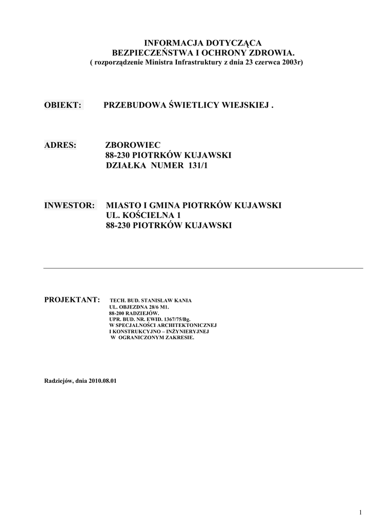 INFORMACJA DOTYCZĄCA BEZPIECZEŃSTWA I OCHRONY ZDROWIA. ( rozporządzenie Ministra Infrastruktury z dnia 23 czerwca 2003r) OBIEKT: PRZEBUDOWA ŚWIETLICY WIEJSKIEJ . ADRES: ZBOROWIEC 88-230 PIOTRKÓW KUJAWSKI DZIAŁKA NUMER 131/1 INWESTOR: MIASTO I GMINA PIOTRKÓW KUJAWSKI UL. KOŚCIELNA 1 88-230 PIOTRKÓW KUJAWSKI PROJEKTANT: TECH. BUD. STANISŁAW KANIA UL. OBJEZDNA 28/6 M1. 88-200 RADZIEJÓW. UPR. BUD. NR. EWID. 1367/75/Bg. W SPECJALNOŚCI ARCHITEKTONICZNEJ I KONSTRUKCYJNO – INŻYNIERYJNEJ W OGRANICZONYM ZAKRESIE. Radziejów, dnia 2010.08.01 1 CZĘŚĆ OPISOWA. 1. Zakres robót zamierzenia budowlanego oraz kolejność realizacji poszczególnych obiektów. Przebudowa świetlicy wiejskiej: - roboty ziemne - roboty fundamentowe - wykonanie ścian parteru - schody zewnętrzne - wykonanie konstrukcji dachu wraz z pokryciem - wykonanie elewacji - remont pomieszczeń wewnętrznych Inne roboty budowlane: - budowa przydomowej oczyszczalni ścieków wraz z przyłączem kanalizacyjnym - wykonanie utwardzenia z kostki betonowej pol- bruk. - rozbiórka budynku gospodarczego - zagospodarowanie terenu w zieleń ozdobną niską i wysoką. 2. Wykaz istniejących obiektów budowlanych. Budynek świetlicy wiejskiej Budynek gospodarczy 3. Wskazanie elementów zagospodarowania działki, które mogą stwarzać zagrożenie bezpieczeństwa i zdrowia ludzi. Brak ogrodzenia terenu lub oznaczenia granic za pomocą tablic ostrzegawczych. Brak ogrodzenia stref niebezpiecznych, na których istnieje możliwość spadania przedmiotów. Brak ogrodzenia i wykonania daszków ochronnych w strefie niebezpiecznej. Brak wyznaczenia terenu na drogi dojazdowe. Brak wyznaczenia bezpiecznych przejść dla pieszych. Brak wyznaczonego miejsca na składowanie materiałów budowlanych. Doprowadzenie energii elektrycznej niezakończone skrzynkami rozdzielczymi. Dźwigi i koparki. 4. Zagrożenia dla bezpieczeństwa i zdrowia ludzi występujące podczas budowy: Prowadzenie prac na wysokości powyżej 5m a w szczególności - wykonywanie więźby dachowej, ołacenie dachu, wykonywanie pokrycia dachu, wykonywanie obróbek blacharskich: niebezpieczeństwo upadku z rusztowań bądź dachu. - wznoszenie ścian: niebezpieczeństwo upadku z rusztowań. - wykonywanie stropów: niebezpieczeństwo upadku z rusztowań. - wykonywanie elewacji: niebezpieczeństwo upadku z rusztowań. - wykonywanie robót niezgodnie z technologią robót. - nieprzestrzeganie przepisów BHP podczas robót przy czynnych instalacjach. Wykonywanie wykopów o ścianach pionowych bez rozparcia o głębokości powyżej 1,5m oraz wykopów o bezpiecznym nachyleniu ścian o głębokości ponad 3,0m.: - wykonywanie fundamentów: niebezpieczeństwo przysypania ziemią - wykonywanie ścian piwnic: niebezpieczeństwo przysypania ziemią. Wykonywanie prac z udziałem dźwigu i koparek: - zerwanie się materiału transportowego i uszkodzeniami dźwigu - uderzenie wysięgnikiem koparki i uszkodzenie koparki. Roboty ziemne. Niezachowanie odpowiedniego nachylenia skarp. Składowanie materiałów na krawędzi wykopu. Niestaranne wykonanie szalunków lub ich brak. Przebywanie w zasięgu pracy ramienia koparki Brak kontroli izolacji kabli energetycznych i przewodów doprowadzających energię elektryczną, np. do pomp. Prace na wysokości. Niewyposażenie pracowników stosownie do rodzaju prac wykonywanych na wysokości w sprzęt chroniący przed upadkiem. Nieużywanie lub nieprawidłowe używanie przez pracowników sprzętu ochronnego. Niedostateczne informowanie pracowników o zagrożeniach i nieprowadzenie szkoleń. Niewłaściwa organizacja pracy. 2 Rusztowania budowlane i drabiny. Montaż rusztowań przez nieuprawnione osoby. Brak wpisu do dziennika budowy o dopuszczeniu rusztowania do użytku przez uprawnioną osobę. Wykonywanie rusztowań nietypowych bez opracowanego projektu. Stosowanie rusztowań i drabin uszkodzonych. Stosowanie drabin jako drogi transportu i do przenoszenia ciężarów powyżej 10.0kg. Ustawianie rusztowań i drabin na niestabilnym podłożu. Ustawianie rusztowań i drabin w bezpośrednim sąsiedztwie maszyn i innych urządzeń. Roboty zbrojarskie. Niezachowanie warunków bezpiecznego transportu i składowania stali zbrojeniowej i gotowych wyrobów. Obsługa maszyn i urządzeń zbrojarskich przez osoby nieuprawnione. Nieprzestrzeganie instrukcji obsługi maszyn i urządzeń zbrojarskich. Wykonywanie zbrojenia bez odpowiednich zabezpieczeń i rusztowań. Niestosowanie desek lub pomostów umożliwiających przemieszczanie się osób po wykonanym zbrojeniu. Roboty betoniarskie. Porażenie prądem przez uszkodzone przewody zasilające betoniarki, wibratory lub kable oświetleniowe. Urazy nóg przy chodzeniu po zbrojeniu zakrytym świeżym betonem. Używanie technicznie niesprawnych betoniarek, wibratorów itp. Używany sprzęt elektrotechniczny powinien posiadać aktualne okresowe badania potwierdzające ich sprawność techniczną i odpowiednią izolacyjność instalacji elektrycznej. Roboty murowe i tynkarskie. Obsługa sprzętu przez osoby nieuprawnione. Nieprzestrzeganie instrukcji obsługi i używania sprzętu. Brak zabezpieczeń ruchomych przy używanym sprzęcie. Nieprawidłowo wykonane rusztowania Samowolna likwidacja zabezpieczeń ochronnych – otwory w stropach, barierki itp. Wchodzenie i schodzenie z rusztowań w miejscach do tego nieprzystosowanych. Podwyższanie pomostów roboczych w sposób niezgodny z przepisami. Brak porządku na stanowisku pracy. Porażenie prądem przy niesprawnej instalacji elektrycznej. Roboty ciesielskie. Obsługa maszyn przez osoby nieuprawnione lub nieprzeszkolone, nieprzestrzeganie instrukcji obsługi maszyn i urządzeń. Niezachowanie warunków bezpiecznego transportu i składowania elementów deskowań i konstrukcji. Dopuszczenie pracowników do pracy bez zabezpieczeń indywidualnych. Wykonywanie robót i rozbiórek niezgodnie z technologią Brak porządku na stanowisku pracy (deski z gwoździami itp.) Roboty malarsk